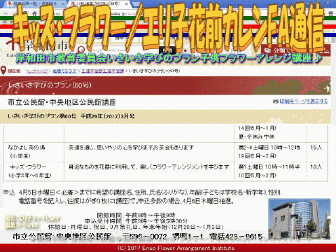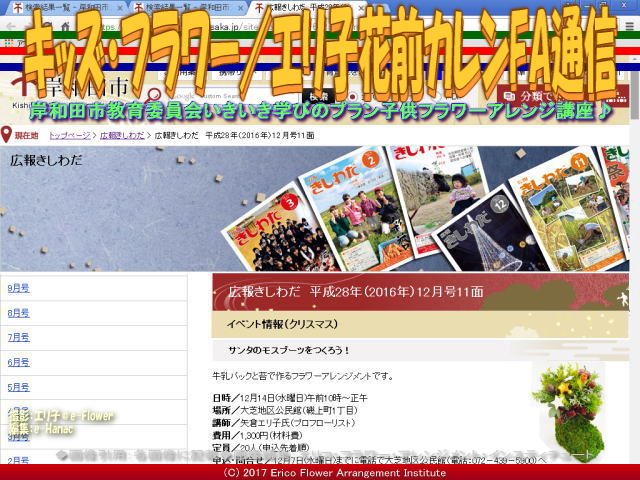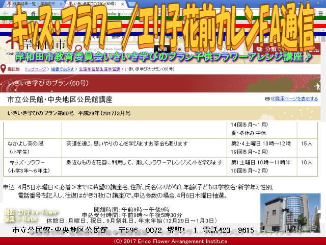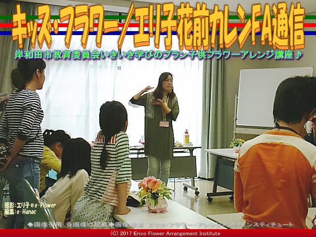 本日の紹介ブログは、『キッズ・フラワー(4)/エリ子花前カレンFA通信』です。 先日より紹介しています「キッズ・フラワー/エリ子花前カレンFA通信」ブログについては、今までに以下の 『キッズ・フラワー(3)/エリ子花前カレンFA通信』 『キッズ・フラワー(2)/エリ子花前カレンFA通信』 『キッズ・フラワー/エリ子花前カレンFA通信』 を作成してアップしてあります。画像タイトルは、「キッズ・フラワー/エリ子花前カレンFA通信」、そしてサブタイトルも「岸和田市教育委員会いきいき学びのプラン子供フラワーアレンジ講座♪」で統一しています。あわせてご覧いただければ幸いです。 ■第1回 キッズ・フラワー 2017/05/13Sat. この日第一回のキッズ・フラワーの日、勿論、子供達も緊張して来てくれているでしょうけど、私も少し緊張しました。上手く計画通り運ぶかしらという若干の不安と期待と希望で胸一杯にして、早めに出向きました。 【キッズ・フラワー(4)/エリ子花前カレンFA通信 01】 岸和田市立中央公民館の担当者さんで、キッズ・フラワー講座担当の社会教育指導員の西村千都子(Chizuko MISHIMURA)さんと岸和田中央公民館(正式には、岸和田市立中央公民館)でお会いしてご挨拶すると、少し落ち着きました。 気持ちのスイッチが切り替わり さぁ!イザ!頑張るそ!と言う気になりました。 岸和田中央公民館3階創作室に行き、机や椅子、材料の準備に取りかかりました。 【キッズ・フラワー(4)/エリ子花前カレンFA通信 02】 キッズ・フラワー開始時間の10分位前から参加者が集まり出しました。上の画像のように、参加者の中には男の子も一人居ます。うれしいですね。お花に興味を持ってくれる男の子がいて。 【キッズ・フラワー(4)/エリ子花前カレンFA通信 03】 私、エリ子花前カレンは岸和田市教育委員会生涯学習課FAフラワーアレンジメントレッスンでは大人の方々をお教えしています。上の画像は、昨年2016年の岸和田市クリスマスイベントでは、有真香会館・葛城地区公民館と大芝築公民館では「クリスマスモスブーツを作ろう」といく企画でエコとフラワーアレンジ(※参照『サンタのモスブーツ大芝会館/Xmas花前カレン』『サンタのモスブーツ/クリスマス花前カレン』等)に取り組んだときの岸和田市広報ビジュアルです。今回このキッズフラワーレッスンは、私としては、久しぶりの小学生との関わりです。あ、久しぶりと書いたのは、個人的なことですが、私の子供は末の女の子で、もう大学生ですので。・・・つづく ちなみに、私プロフローリスト、エリ子花前カレンがインストラクターを務めさせて頂いています、岸和田市教育委員会生涯学習部生涯学習課主催のフラワーアレンジメント関連ブログは、以下のようなタイトルがあります。 2 『2016フラワーアレンジ/公民館まつり花前カレン』 2 『2016フラワーアレンジ(2)/公民館まつり花前カレン』 K 『KAFAC植田享子/花前カレン生徒作品集』 K 『KAFAC原光枝/花前カレン生徒作品集』 K 『KAFAC植田美紀/花前カレン生徒作品集』 K 『KAFAC小山淳子/花前カレン生徒作品集』 K 『KAFAC笠井ヒデ子/花前カレン生徒作品集』 K 『KAFAC太田良江/花前カレン生徒作品集』 K 『KAFAC外山真利子/花前カレン生徒作品集』 K 『KAFAC小椋美栄子/花前カレン生徒作品集』 K 『KAFAC上田順子/花前カレン生徒作品集』 K 『KAFAC植田千代子/花前カレン生徒作品集』 K 『KAFAC藤本利子/花前カレン生徒作品集』 あ 『有真香2015Xmasリース/花前カレン』 あ 『有真香会館/花前カレン』 あ 『有真香会館花アレンジ/花前カレン』 あ 『有真香花アレンジクラブ/花前カレン』 お 『お正月初めての雨の祭日/花前カレン』 お 『お正月飾りフラワーアレンジ/花前カレン』 お 『お正月飾りフラワーアレンジ(2)/花前カレン』 お 『お正月飾りフラワーアレンジ(3)/花前カレン』 お 『お正月飾り2017フラワーアレンジ/花前カレン』 か 『葛城地区公民館/花前カレン』 か 『葛城公民館祭2016展示/花前カレン』 か 『葛城公民館祭2016発表/花前カレン』 か 『葛城地区公民館祭2016/花前カレン』 か 『葛城地区公民館まつり/花前カレン』 か 『葛城地区公民館まつり(2)/花前カレン』 か 『葛城地区公民館まつり(3)/花前カレン』 か 『葛城地区公民館まつり(4)/花前カレン』 か 『葛城地区公民館まつり(5)/花前カレン』 か 『葛城地区公民館まつり(6)/花前カレン』 こ 『コスモスアレンジ(4)/花前カレン』 こ 『コスモス・フラワーアレンジ(3)/花前カレン』 さ 『サンタのモスブーツ大芝会館/Xmas花前カレン』 さ 『サンタのモスブーツ/クリスマス花前カレン』 ふ 『フラワーアレンジ・コスモス(2)/花前カレン』 ふ 『フラワーアレンジメント・コスモス/花前カレン』 ふ 『フラワーアレンジメント/花前カレン』 ふ 『フラワーアレンジメント2016/花前カレン』 ふ 『フラワーアレンジ準備編/葛城地区公民館まつり2016』 ふ 『フラワーアレンジ市場編/公民館まつり2016花前カレン』 ふ 『フラワーアレンジ市場(2)/公民館まつり2016花前カレン』 