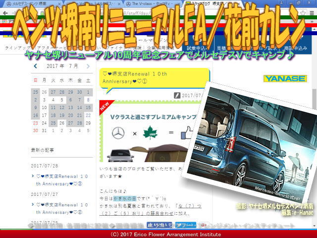 そして<第一弾!!「Enjoy Outingを合言葉に、屋外と人とを繋ぐ第一ブランド。「LOGOS」と「クルマはつくらない。クルマのある人生をつくっている。YANASE」のコラボ企画!! 【Vクラスと過ごすプレミアムキャンプ】 もう、7月末!早くも、キャンプの季節となりました!! 今は、1ランク上のラグジュアリーキャンプを楽しむ方が増えているそうです♪ そこで、機能的で広大な室内空間と知的安全装備が備わった「メルセデス・ベンツVクラス」と、プレミアムなキャンプライフを「LOGOS」とコラボレーションし、ショウルームにて展示いたします(*・∀・) 日頃の感謝を込めまして、ご来場いただいたお客様すべての方にスペシャルな2日間となっております!! ぜひ、皆様お揃いでお越しくださいませ。>と紹介されています。 【ベンツ堺南リニューアルFA(4)/花前カレン 02】 そして、2017年8月5日(土)と6日(日)にメルセデス・ベンツヤナセ堺南で開催予定の「ヤナセ堺支店 リニューアル10周年記念フェア」のブログを拝見すると、興味あるブログページです。 引用しますと、<今日7月27日はスイカの日です☆スイカの縦縞模様を綱にたとえて、27を「つ(2)な(7)」(綱)と読む。語呂合わせからスイカの日になりました!! 現在のスイカは緑に黒い縞模様が一般的ですが… このような品種が広まったのは昭和初期以降で、それまでは黒、無地皮だったそうです!スイカは熱中症予防にもなりますので、おすすめです(。・?・。)ノ>と書かれています。※「スイカ - Wikipedia」参照 因みに、引用は、ヤナセ堺のブログ担当者の柴田裕紀子さんと駒木根奈々子さんに、お知らせして掲載しています。ありがとうございます。 また、先日の中国訪問では、「スイカ」は中国語で「シーグァ xigua」と発音して、世界のスイカ生産国は中国だと聞いて「なるほど!」と思いました。 ※あ、ところで、当日は、スイカのサービスはございません、上の画像はイメージビジュアルで、私の家で食したスイカの画像を使用しています。・・・つづく ちなみに、「2017年8月5日(土)と6日(日) ヤナセ堺支店 リニューアル10周年記念フェア」のグリーンステージをプロデュースさせて頂く、私エリ子花前カレンは花屋の職人でプロフローリストでインストラクターも務めさせて頂いています、岸和田市教育委員会生涯学習部生涯学習課主催のフラワーアレンジメント関連ブログは、以下のようなタイトルがあります。 2 『2016フラワーアレンジ/公民館まつり花前カレン』 2 『2016フラワーアレンジ(2)/公民館まつり花前カレン』 K 『KAFAC植田享子/花前カレン生徒作品集』 K 『KAFAC原光枝/花前カレン生徒作品集』 K 『KAFAC植田美紀/花前カレン生徒作品集』 K 『KAFAC小山淳子/花前カレン生徒作品集』 K 『KAFAC笠井ヒデ子/花前カレン生徒作品集』 K 『KAFAC太田良江/花前カレン生徒作品集』 K 『KAFAC外山真利子/花前カレン生徒作品集』 K 『KAFAC小椋美栄子/花前カレン生徒作品集』 K 『KAFAC上田順子/花前カレン生徒作品集』 K 『KAFAC植田千代子/花前カレン生徒作品集』 K 『KAFAC藤本利子/花前カレン生徒作品集』 あ 『有真香2015Xmasリース/花前カレン』 あ 『有真香会館/花前カレン』 あ 『有真香会館花アレンジ/花前カレン』 あ 『有真香花アレンジクラブ/花前カレン』 お 『お正月初めての雨の祭日/花前カレン』 お 『お正月飾りフラワーアレンジ/花前カレン』 お 『お正月飾りフラワーアレンジ(2)/花前カレン』 お 『お正月飾りフラワーアレンジ(3)/花前カレン』 お 『お正月飾り2017フラワーアレンジ/花前カレン』 か 『葛城地区公民館/花前カレン』 か 『葛城公民館祭2016展示/花前カレン』 か 『葛城公民館祭2016発表/花前カレン』 か 『葛城地区公民館祭2016/花前カレン』 か 『葛城地区公民館まつり/花前カレン』 か 『葛城地区公民館まつり(2)/花前カレン』 か 『葛城地区公民館まつり(3)/花前カレン』 か 『葛城地区公民館まつり(4)/花前カレン』 か 『葛城地区公民館まつり(5)/花前カレン』 か 『葛城地区公民館まつり(6)/花前カレン』 こ 『コスモスアレンジ(4)/花前カレン』 こ 『コスモス・フラワーアレンジ(3)/花前カレン』 さ 『サンタのモスブーツ大芝会館/Xmas花前カレン』 さ 『サンタのモスブーツ/クリスマス花前カレン』 ふ 『フラワーアレンジ・コスモス(2)/花前カレン』 ふ 『フラワーアレンジメント・コスモス/花前カレン』 ふ 『フラワーアレンジメント/花前カレン』 ふ 『フラワーアレンジメント2016/花前カレン』 ふ 『フラワーアレンジ準備編/葛城地区公民館まつり2016』 ふ 『フラワーアレンジ市場編/公民館まつり2016花前カレン』 ふ 『フラワーアレンジ市場(2)/公民館まつり2016花前カレン』 ふ 『フラワーアレンジメント前日/葛城地区公民館まつり2016』 ふ 『フラワーアレンジメント制作/葛城地区公民館まつり2016』 ふ 『フラワーアレンジメント展示/葛城地区公民館まつり2016』 ふ 『フラワーアレンジメント公開/葛城地区公民館まつり2016』 ふ 『プリザーブドフラワーアレンジ/花前カレン』 ふ 