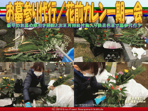 今回の紹介ブログは、『お墓参り代行/花前カレン一期一会』です。 お墓参りの代行を務めさせていただきました。この時期は、お墓のお掃除とお正月用松竹梅入りの供花・色花で、お参りさせていただきました。 【お墓参り代行/花前カレン一期一会 01】 友人が懇意にして貰っていたNさんのお父様お母様が他界されて5年。ご本人がお墓のお守りをすべきですが、海外赴任のためお墓参りが出来なくなったそうです。もともと信心深い方なのでお墓参りが十分に出来ない事に悩んでおられていたそうです。偶々(たまたま)、友人を介して、花屋の私にお声をお掛け頂いて、そのご家族の代わりに私がお墓参りをすることになりました。今時のビジネス風に言うと、いわば「お墓参り代行サービス」と言うことになります。 【お墓参り代行/花前カレン一期一会 02】 私は、フラワーアレンジのプロフローリストで、大阪府岸和田市生涯学習部葛城地区公民館(有真香会館)のフラワーアレンジメントクラブ(KAFAC)の講師(※参照『2016フラワーアレンジ/公民館まつり花前カレン』『プリザーブドフラワーアレンジ(4)/テーピング花前カレン』『フラワーアレンジメント2016/花前カレン』『葛城地区公民館まつり(6)/花前カレン』『葛城地区公民館祭2016/花前カレン』『有真香会館花アレンジ/花前カレン』『フラワーアレンジメント/花前カレン』『有真香花アレンジクラブ/花前カレン』『有真香2015Xmasリース/花前カレン』『葛城地区公民館/花前カレン』『有真香会館/花前カレン』等)と、大阪府泉佐野漁港青空市場でフラワーショップ園部のお店(※参照『フラワーショップ園部(5)/花前カレン』『フラワーショップ園部(4)/花前カレン』『フラワーショップ園部(3)/花前カレン』『フラワーショップ園部(2)/花前カレン』『フラワーショップ園部/花前カレン』等)のプロ職人としてお店勤めが本職です。お墓参りの代行は商ってはおりませんが時々こういった御依頼を頂きます。他所様(よそさま)他人様(ひとさま)のご先祖様のお墓でも何らかの御奉仕が出来れば必ず良い事があると信じていますし、お墓が綺麗になって気持ちが良いものなので、有り難い御報酬を頂いて時間の許す限り喜んでお受けしています。 【お墓参り代行/花前カレン一期一会 03】 友人から、その方が以前任せていた「何でもサービス屋」さんの至らなさのお話を伺いました。それはダメでしょ!やっぱり私がさせて頂こう!私なら、もっと丁寧にするし、花屋なのでもっと立派なお花も供えられるし、そしてお話からその方のお人柄を知ってお手伝いできるならという気持ちでお墓参りの代行をお引き受けしました。・・・つづく ちなみに、私がクラブ講師を務めさせていただいています葛城地区公民館(有真香会館)フラワーアレンジクラブ(KAFAC)の関連ブログでは、今までに、以下 『KAFAC植田享子/花前カレン生徒作品集』 『KAFAC原光枝/花前カレン生徒作品集』 『KAFAC植田美紀/花前カレン生徒作品集』 『KAFAC小山淳子/花前カレン生徒作品集』 『KAFAC笠井ヒデ子/花前カレン生徒作品集』 『KAFAC太田良江/花前カレン生徒作品集』 『KAFAC外山真利子/花前カレン生徒作品集』 『KAFAC小椋美栄子/花前カレン生徒作品集』 『KAFAC上田順子/花前カレン生徒作品集』 『KAFAC植田千代子/花前カレン生徒作品集』 『KAFAC藤本利子/花前カレン生徒作品集』 『2016フラワーアレンジ/公民館まつり花前カレン』 『プリザーブドフラワーアレンジ(4)/テーピング花前カレン』 『プリザーブドフラワーアレンジ(3)/ワイヤリング花前カレン』 『プリザーブドフラワーアレンジ(2)/葛城地区公民館まつり2016』 『プリザーブドフラワーアレンジ/花前カレン』 『フラワーアレンジメント2016/花前カレン』 『葛城地区公民館まつり(6)/花前カレン』 『葛城地区公民館まつり(5)/花前カレン』 『葛城地区公民館まつり(4)/花前カレン』 『葛城公民館祭2016展示/花前カレン』 『葛城公民館祭2016発表/花前カレン』 『葛城地区公民館祭2016/花前カレン』 『葛城地区公民館まつり(3)/花前カレン』 『葛城地区公民館まつり(2)/花前カレン』 『葛城地区公民館まつり/花前カレン』 『有真香会館花アレンジ/花前カレン』 『フラワーアレンジメント/花前カレン』 『有真香花アレンジクラブ/花前カレン』 『有真香2015Xmasリース/花前カレン』 『葛城地区公民館/花前カレン』 『有真香会館/花前カレン』 のように作成・アップしてあります。 あわせてご覧いただければ幸いです。 □テキスト編集:Fiori, Erico _ |