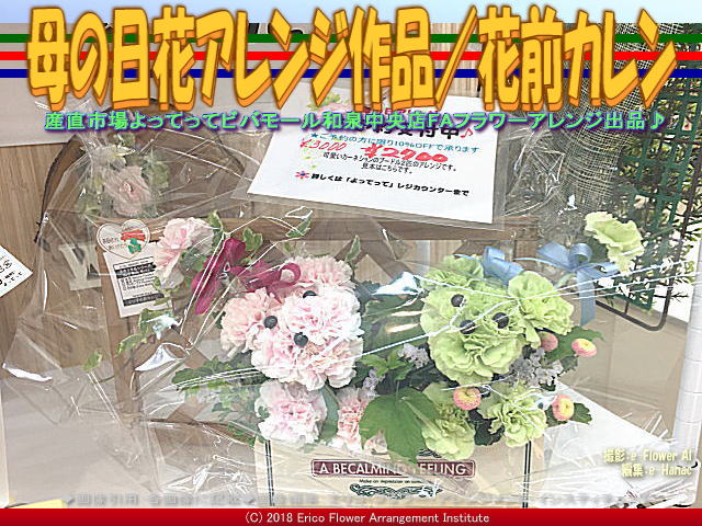 【母の日花アレンジ作品(2)/花前カレン 01】 今回の紹介ブログは、『母の日花アレンジ作品(2)/花前カレン』です。 前回(昨日)の紹介ブログは、『母の日花アレンジ作品/花前カレン』です。 「母の日花アレンジ作品/花前カレン」を書くにあたって、まずは母の日についてお勉強します。 画像タイトルは、<母の日花アレンジ作品/花前カレン>で統一しています。 サブタイトルは、<産直市場よってってビバモール和泉中央店FAフラワーアレンジ出品♪>としています。 タグは<母の日、花アレンジ、アレンジ作品、花前カレン、よってって、産直市場、ビバモール、和泉中央店、FA、フラワーアレンジ>としています。 今年は、大阪府和泉市の大きなショッピングモール「ビバモール和泉中央店」に、去る3月21日に新規グランドオープンしました地産地消のスーパー「産直市場よってってビバモール和泉中央店」(以下のブログページ参照 『産直市場よってって/エリ子花前カレン』 『産直市場よってって(2)/エリ子花前カレン』 『産直市場よってって(3)/エリ子花前カレン』 『産直市場よってって(4)/エリ子花前カレン』 『産直市場よってって(5)/エリ子花前カレン』) で、ご縁あって、母の日のフラワーアレンジメント(花アレンジ)作品を展示販売させていただくことになりました。 | ||||