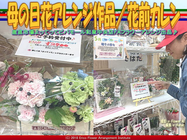 母の日は、私達花屋やフローリストやお店などでは大切なイベントというか、紋日です。 たとえば、母の日の定番ギフトとしては、プリザーブドフラワーやカーネーションなどの花ギフト、スイーツ・ファッションギフトなどが挙げられます。 上のトップタイトル画像は、浜の私の花屋(※参照『フラワーショップ園部(5)/花前カレン』『フラワーショップ園部(4)/花前カレン』『フラワーショップ園部(3)/花前カレン』『フラワーショップ園部(2)/花前カレン』『フラワーショップ園部/花前カレン』等)で今年母の日の紋日に並べたお花や注文品の展示です。 【母の日花アレンジ作品(6)/花前カレン 02】 母の日の経済効果としては、もっと細かく単純に羅列すると、花関連では、カーネーション花鉢、花束・ブーケ、プリザーブドフラワー、ボックスフラワーのアレンジメント、花・花ギフトセット、花とスイーツセット、花とグルメ・ドリンクセット、花と美容・ファッションセット、そしてカーネーション以外の花鉢やバラやチューリップの花などがあります。 あ、ハーバリウム・リースなども忘れてはなりません。 今年の母の日のフラワーアレンジメント作品は、今まで以上にモチベーションを上げて、弟子や生徒さんにも手伝ってもらって製作しました。 これからも良い「ありがとう母の日」作品をみんなで作ろうと決心した今日この頃です。 ちなみに、このブログは、私、エリ子花前カレンが管理者です。私は、岸和田市教育委員会生涯学習部生涯学習課が毎年開催している生涯学習のフラワーアレンジメント講座の講師の一人です。自分の教室(イー・フラワーアレンジメント教室/英語名:e-Flower Arrangement Institute/略称:e-Flower AI)を運営しながら、25年前から岸和田市立葛城地区公民館有真香会館(『秋の2017文化祭(4)/花前カレン作品』『文化祭2017生け込み/女子会お茶会』『岸和田市2017文化祭(6)/葛城地区公民館まつり』他)では成人の部を、そして2017年から岸和田市(岸和田市教育委員会公式ページはこちら)主催の「キッズフラワー」講座(『第9回キッズフラワー感想(7)/エリ子花前カレン』他)を担当しています。 また、ワンオフレッスンとして、不定期的にJA(『JAいずみのフラワーアレンジ/花前カレン』『JA農協新春アレンジ手順/花前カレン』等)、その他の施設(『サンタのモスブーツ(3)/大芝地区公民館2016』『お正月飾り2017フラワーアレンジ/花前カレン』等)でお受けしています。作品展示販売は(『ららぽーと和泉こどもの日(4)/花前カレン』『ららぽーと和泉Xmasリース(3)/花前カレン』『産直市場よってって(5)/エリ子花前カレン』『和歌山道の駅くしがきの里/花前カレン』『フラワーアレンジ作品販売/2017公民館まつり』等)やイベント(『ベンツ堺南リニューアルFA(10)当日/花前カレン』『書道作品展フラワーアレンジ(3)/花前カレン』『ひなまつりフラワーアレンジ(9)/花前カレン』『リーフとフラワーアレンジ(5)/花前カレン』『入社式フラワーアレンジ(13) /エリ子花前カレン』『99本の薔薇の花束(6)/花前カレン』『就労支援にフラワーアレンジ/花前カレン』『公民館まつり2017/岸和田市立中央地区公民館』等)でのフラワーアレンジメントを企画・運営を含んだプロデュースを行っています。また、各種行事(『メルセデスベンツ岸和田/花前カレン一期一会』『宝塚市長選フラワーアレンジ(3)/花前カレン』『日産大阪本店フラワーアレンジ/花前カレン』『入社式フラワーアレンジ/花前カレン一期一会』『お彼岸フラワーアレンジ/花前カレン一期一会』『ヤナセメルセデスベンツ岸和田/花前カレン』等)のフラワーアレンジメントの出張生け込みやお墓参り代行(※参照『お墓参り代行/花前カレン一期一会』『お墓参り草引き清掃供花/花前カレン』『お墓参り代行サービス/花前カレン』等)の各種サービスもさせていただいています。 このブログは、私、エリ子花前カレン(★YouTube動画『簡単クリスマスリース作り/TVKドレミファん』『公民館まつり2017/岸和田市立中央地区公民館』等)は京都国際芸術院のメンバーとして日本の各地の美術館や博物館を紹介するフリーペーパー「アートの旅」(640x480画像はこちらから)という小冊子を企画・出版しています。 facebook公開中・・・「いいね!」よろしくお願いいたします。・・・つづく □テキスト編集:Fiori, Erico _ |