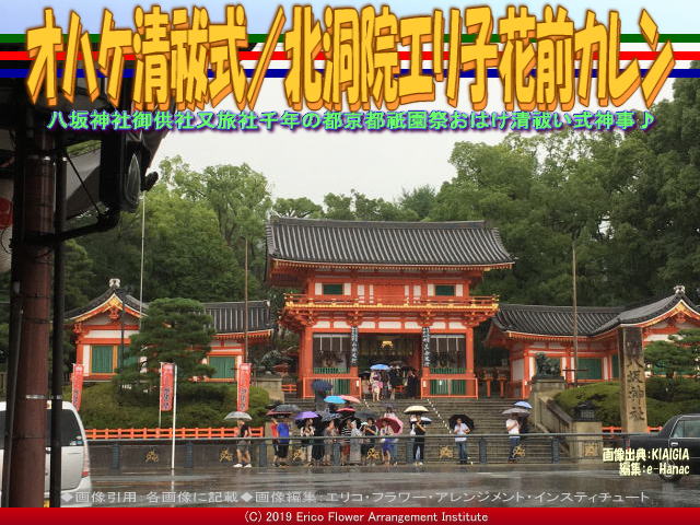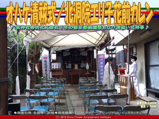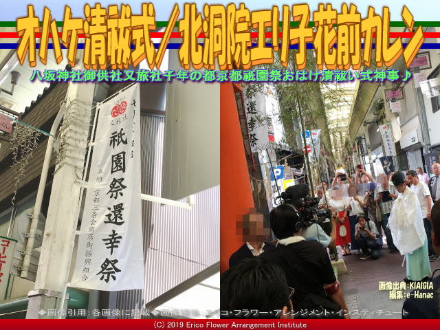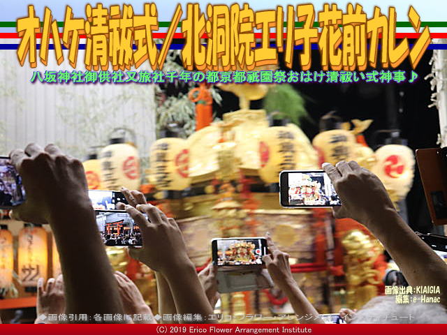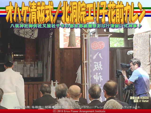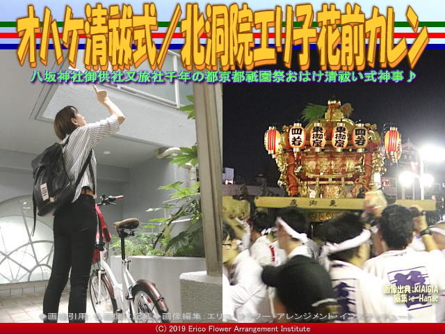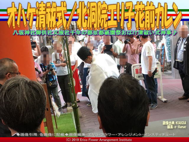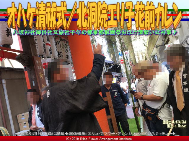 2019年令和元年7月24日(水)は祇園祭後祭(ぎおんさいあとまつり/ぎおんまつりあとのあつり)のクライマックス、山鉾巡行です。 後祭山鉾巡行が午前9時から祇園祭山鉾連合会の主催で各山鉾町や市中でパフォーマンス。 疫病退散のため各山鉾町により建てられた11基の山鉾<橋弁慶山(はしべんけいやま)、北観音山(きたかんのんやま)、鯉山(こいやま)、八幡山(はちまんやま)、黒主山(くろぬしやま)、南観音山(みなみかんのんやま)、役行者山(えんのぎょうじゃやま)、浄妙山(じょうみょうやま)、鈴鹿山(すずかやま)、鷹山「唐櫃(からびつ)巡行、大船鉾(おおふねほこ)>が、四条烏丸から、四条通・御旅所・河原町通・御池通・新町通と都大路を巡行しました。 【オハケ清祓式(5)/北洞院エリ子花前カレン 02】 今年の千年の都古都京都の祇園祭は1150年の節目を迎えます。 この佳節を奉祝して、八坂神社では幾つかの奉祝行事等を行いました。 その一つに7月24日還幸祭の神輿渡御があります。 7月17日(水)から四条御旅所(おたびしょ)に鎮座していた中御座神輿(なかござみこし)、東御座神輿(ひがじござみこし)、西御座神輿(にしござみこし)の三基の神輿が、祇園祭発祥の地三条又旅社に神輿三基揃った後、明治以前の姿を再現して、三基神輿が揃って氏子町内を渡旅します。 三条通を東へ、寺町通を南へ.そして四条通から最後に八坂神社へと戻ります。 深夜になります。 八坂神社に戻った後は、神輿に乗った神霊を本殿に戻す神事が行われます。 この7月24日還幸祭に先立って、前日7月23日の火曜日に営まれる神事が、八坂神社の末社・八坂神社御供社(やさかじんじゃごくうしゃ)「又旅社」の「オハケ清祓式(おはけきよはらいしき/おはけせいばつしき)」なのです。・・・つづく このブログページは、我が非営利型一般社団法人京都国際芸術院(法人番号7130005015305/略称:KIAIGIA/キアイジャ/公式ページ/Facebookページ/公式Twitter/代表のTwitter)花の代表、北洞院流華法道の家元として指揮を執る私北洞院エリ子花前カレン(公式ブログ、Profile、facebook、Twitter、公式HP1、公式HP2)が管理者です。 我が非営利型一般社団法人京都国際芸術院は、昨年2018年5月に京都中京の四条に法人設立した組織です。設立当初は、書と花をコアにして、書は、吉祥院心龍北洞院流書法道正師範(公式ブログ、公式Blog2アメブロ、facebook、Instagram、YouTube、公式HP)、そして花は私北洞院エリ子花前カレンの二人で、京都と大阪と兵庫で活動しています。 設立の2018年は私は、特に一般社団法人京都国際芸術院の設立(『社団法人化への歩み(6)/京都国際芸術院』など)や奈良ホテルでの記念式典(『奈良ホテル書花展(10)/京都国際芸術院』など)、出版事業部の初仕事(『アートの旅/一般社団法人京都国際芸術院』『アートの旅美術館/エリ子花前カレン』『アートの旅facebook記事/京都国際芸術院』『アートの旅松本編集長/京都国際芸術院』など)、産直市場よってって新規開店(『よってって和泉中央(4)/エリ子花前カレン』など)でのプロパー作品展示販売、そして公式ページの立上げやFcebookページやTwitterの開設、そして個人的には動画編集ビデオ制作の学習(『ビデオ制作勉強会(9)/エリ子花前カレン』など)等、ネット関連の仕事も増えて、有難くもどんどん忙しくなってきました。 また、2019年4月には京都下鴨北大路通りに北大路WS2(ワークショップ・スタジオ)を開設しました。※改装準備中の画像(※引用『北洞院流スタジオ改造(8)/京都国際芸術院』など)はこちら。 最近の我が非営利型一般社団法人京都国際芸術院の実働としては、書と花と出版をメインテーマにして、教室運営、出張講座、イベント企画と運営、出版、ウェッブ授業とデジタルコンテンツ作成と提供、京都四条北洞院流書法道と華法道認定の各師範の作品開発・頒布販売(<令和時代><作品価格@令和時代>)などを行っています。 とりわけ人気のハーバリウム体験や講座・レッスン関連ですこし例に挙げると、今までに 『ハーバリウム製作体験(3)/有真香会館』 『岸和田教育委員会FA講座(5)/エリ子花前カレン』『煉瓦館ハーバリウム(5)/北洞院流』を行い、一部ブログを作成して紹介してあります。 ハーバリウム体験授業の中で必ず口頭で紹介させて頂きます「アートの旅」は、私たち非営利型一般社団法人京都国際芸術院が企画・出版しています小冊子の名称で、英語名は“THE TRAVEL OF ART”です。 「アートの旅」は、日本の各地の美術館や博物館から掲載ご許可を頂いて展示作品や催事などを紹介するフリーペーパーです。 私北洞院エリ子花前カレンが企画と制作に加わって、松本正編集長が編集・出版した昨年からのアートの旅は、「アートの旅2018春号(640x480画像)」「アートの旅2018夏号(表紙2460x3486画像、動画『アートの旅/ページめくり』)」「アートの旅2018秋号」「アートの旅2019冬号」がラインナップされています。 アートの旅は一年で4回の季節毎の出版です。 今年2019年4月1日には『アートの旅2019春号』を発行いたしま