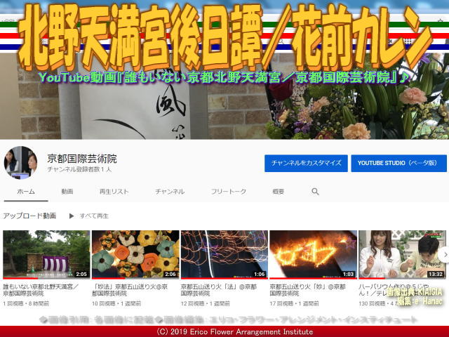 最近あれこれ忙しくてすべき事がたまっています。 やっと撮り貯めたiPhoneの動画を編集制作する時間が取れました。 ただいま我が京都四条北洞院流の非営利型一般社団法人京都国際芸術院(法人番号7130005015305/略称:KIAIGIA/キアイジャ/公式ページ/Facebookページ/公式Twitter/代表のTwitter)北大路WSS(下鴨北大路ワークショップオフィス)で4本制作予定でビデオ編集作業をしています。 トップのタイトル画像は、一般社団法人京都国際芸術院YouTubeページ<京都国際芸術院のYouTubeチャンネル>です。 【北野天満宮後日譚/花前カレン 02】 まずは今日は8月15日に撮影した千年の都古都京都北野天満宮の動画です。 YouTube動画『誰もいない京都北野天満宮/京都国際芸術院』がそれなりに完成、YouTubeページにアップしました。 ■一般社団法人京都国際芸術院YouTubeページ: 京都国際芸術院のYouTubeチャンネル ご覧くださいませ。・・・つづく このブログページは、我が非営利型一般社団法人京都国際芸術院(法人番号7130005015305/略称:KIAIGIA/キアイジャ/公式ページ/Facebookページ/公式Twitter/代表のTwitter)花の代表、北洞院流華法道の家元として指揮を執る私北洞院エリ子花前カレン(公式ブログ、Profile、facebook、Twitter、公式HP1、公式HP2)が管理者です。 我が非営利型一般社団法人京都国際芸術院は、昨年2018年5月に京都中京の四条に法人設立した組織です。設立当初は、書と花をコアにして、書は、吉祥院心龍北洞院流書法道正師範(公式ブログ、公式Blog2アメブロ、facebook、Instagram、YouTube、公式HP)、そして花は私北洞院エリ子花前カレンの二人で、京都と大阪と兵庫で活動しています。 設立の2018年は私は、特に一般社団法人京都国際芸術院の設立(『社団法人化への歩み(6)/京都国際芸術院』など)や奈良ホテルでの記念式典(『奈良ホテル書花展(10)/京都国際芸術院』など)、出版事業部の初仕事(『アートの旅/一般社団法人京都国際芸術院』『アートの旅美術館/エリ子花前カレン』『アートの旅facebook記事/京都国際芸術院』『アートの旅松本編集長/京都国際芸術院』など)、産直市場よってって新規開店(『よってって和泉中央(4)/エリ子花前カレン』など)でのプロパー作品展示販売、そして公式ページの立上げやFcebookページやTwitterの開設、そして個人的には動画編集ビデオ制作の学習(『ビデオ制作勉強会(9)/エリ子花前カレン』など)等、ネット関連の仕事も増えて、有難くもどんどん忙しくなってきました。 また、2019年4月には京都下鴨北大路通りに北大路WS2(ワークショップ・スタジオ)を開設しました。※改装準備中の画像(※引用『北洞院流スタジオ改造(8)/京都国際芸術院』など)はこちら。 最近の我が非営利型一般社団法人京都国際芸術院の実働としては、書と花と出版をメインテーマにして、教室運営、出張講座、イベント企画と運営、出版、ウェッブ授業とデジタルコンテンツ作成と提供、京都四条北洞院流書法道と華法道認定の各師範の作品開発・頒布販売(<令和時代><作品価格@令和時代>)などを行っています。 とりわけ人気のハーバリウム体験や講座・レッスン関連ですこし例に挙げると、今までに 『ハーバリウム製作体験(3)/有真香会館』 『岸和田教育委員会FA講座(5)/エリ子花前カレン』『煉瓦館ハーバリウム(5)/北洞院流』を行い、一部ブログを作成して紹介してあります。 ハーバリウム体験授業の中で必ず口頭で紹介させて頂きます「アートの旅」は、私たち非営利型一般社団法人京都国際芸術院が企画・出版しています小冊子の名称で、英語名は“THE TRAVEL OF ART”です。 「アートの旅」は、日本の各地の美術館や博物館から掲載ご許可を頂いて展示作品や催事などを紹介するフリーペーパーです。 私北洞院エリ子花前カレンが企画と制作に加わって、松本正編集長が編集・出版した昨年からのアートの旅は、「アートの旅2018春号(640x480画像)」「アートの旅2018夏号(表紙2460x3486画像、動画『アートの旅/ページめくり』)」「アートの旅2018秋号」「アートの旅2019冬号」がラインナップされています。 アートの旅は一年で4回の季節毎の出版です。 今年2019年4月1日には『アートの旅2019春号』を発行いたしました。 2019年7月1日(月)に「アートの旅2019夏号」を出版しました。 アートの旅の出版にご協力いただきました皆様にはこのブログページを借りて感謝申し上げます、ありがとうございました。 次刊秋号10月の出版費用捻出のため店償広告ご依頼に参上することもあるかと思います。 その節はご協力、どうか宜しくお願い申し上げます。 因みに、私北洞院エリ子花前カレンは、自分の教室(イー・フラワーアレンジメント教室/英語名:e-Flower Arrangement Institute/略称:e-Flower AI)を運営しながら、25年以上前から岸和田市立葛城地区公民館有真香会館(『秋の2017文化祭(4)/花前カレン作品』『文化祭2017生け込み/女子会お茶会』『岸和田市2017文化祭(6)/葛城地区公民館まつり』他)では成人の部を、そして2017年から岸和田市(岸和田市教育委員会公式ページはこちら)主催の「
