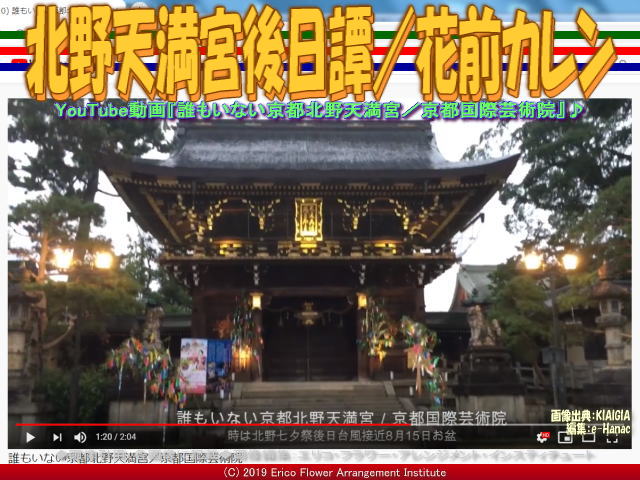 このYouTube動画『誰もいない京都北野天満宮/京都国際芸術院』は、2019年8月7日(水)の北野七夕祭(京都北野天満宮七夕祭)や御手洗祭に参加できなかったので、お盆真っ只中8月15日(木)に出かけて撮って編集したビデオです。 あ、本来七夕は7月7日ですが、8月に七夕というのは京都では普通です。 千年の都古都京都では7月一ヶ月間は祇園祭のビッグイベントがあるからかもしれませんが。 この日8月15日(木)は台風10号の影響で、北野天満宮には誰もいませんでした。 「誰もいませんでした」というのは、正確には「観光客やお参りの方が誰もいませんでした」ということです。 実際のところ、動画撮影しているときは、白袴の着物をお召しになった宮司さんが写りこんでいますし、撮影の後、ビデオには撮っていませんが、お参りの方がたった一人だけやってこられました。 そのたった一人の参拝客は雨の中、傘を目深にさして静かに手をあわせていらっしゃいました。 下の静止画写真がそのときのワンショットビジュアルです。 【北野天満宮後日譚(2)/花前カレン 02】 ■YouTube動画『誰もいない京都北野天満宮、時は北野七夕祭後日台風接近8月15日お盆/京都国際芸術院』データは以下です。 □URL: こちらから https://youtu.be/mnD0mR1ecf8 □動画タイトル=誰もいない京都北野天満宮/京都国際芸術院 □サブタイトル=時は北野七夕祭後日台風接近8月15日お盆 □タグ=京都北野天満宮 北野七夕祭 北野天満宮 京都国際芸術院 台風10号 北洞院エリ子 花前カレン KIAIGIA 8月15日 □ハッシュタグ=#北野天満宮,#京都北野天満宮,#北野七夕祭,#京都国際芸術院,#台風10号,#北洞院エリ子,#花前カレン,#KIAIGIA,#8月15日 □動画種類: MP4ビデオ(.mp4) □動画時間: 00:02:04 □動画サイズ: 75.8 MB(79,488,637 バイト) □動画大きさ: 1280x720 □撮影日時: 2019年令和元年8月15日午後6時過ぎ □撮影: 北洞院エリ子花前カレン@KIAIGIA □ビデオ編集: 花前カレン&KIAIGIA動画倶楽部 □関連ブログ: 『北野天満宮七夕祭(10)/花前カレン』 http://hanamae.blog.jp/archives/ 30022311.html このYouTube動画は、facebookとLINEでMP4ビデオ(.mp4)配信させていただきました。 動画時間が2分少々、動画メモリーサイズは、75.8 MB(79,488,637 バイト)でHD対応の1280x720で重くてストレージに負担がかかるかも知れませんが、是非ともご覧くださいませ。・・・つづく このブログページは、我が非営利型一般社団法人京都国際芸術院(法人番号7130005015305/略称:KIAIGIA/キアイジャ/公式ページ/Facebookページ/公式Twitter/代表のTwitter)花の代表、北洞院流華法道の家元として指揮を執る私北洞院エリ子花前カレン(公式ブログ、Profile、facebook、Twitter、公式HP1、公式HP2)が管理者です。 我が非営利型一般社団法人京都国際芸術院は、昨年2018年5月に京都中京の四条に法人設立した組織です。設立当初は、書と花をコアにして、書は、吉祥院心龍北洞院流書法道正師範(公式ブログ、公式Blog2アメブロ、facebook、Instagram、YouTube、公式HP)、そして花は私北洞院エリ子花前カレンの二人で、京都と大阪と兵庫で活動しています。 設立の2018年は私は、特に一般社団法人京都国際芸術院の設立(『社団法人化への歩み(6)/京都国際芸術院』など)や奈良ホテルでの記念式典(『奈良ホテル書花展(10)/京都国際芸術院』など)、出版事業部の初仕事(『アートの旅/一般社団法人京都国際芸術院』『アートの旅美術館/エリ子花前カレン』『アートの旅facebook記事/京都国際芸術院』『アートの旅松本編集長/京都国際芸術院』など)、産直市場よってって新規開店(『よってって和泉中央(4)/エリ子花前カレン』など)でのプロパー作品展示販売、そして公式ページの立上げやFcebookページやTwitterの開設、そして個人的には動画編集ビデオ制作の学習(『ビデオ制作勉強会(9)/エリ子花前カレン』など)等、ネット関連の仕事も増えて、有難くもどんどん忙しくなってきました。 また、2019年4月には京都下鴨北大路通りに北大路WS2(ワークショップ・スタジオ)を開設しました。※改装準備中の画像(※引用『北洞院流スタジオ改造(8)/京都国際芸術院』など)はこちら。 最近の我が非営利型一般社団法人京都国際芸術院の実働としては、書と花と出版をメインテーマにして、教室運営、出張講座、イベント企画と運営、出版、ウェッブ授業とデジタルコンテンツ作成と提供、京都四条北洞院流書法道と華法道認定の各師範の作品開発・頒布販売(<令和時代><作品価格@令和時代>)などを行っています。 とりわけ人気のハーバリウム体験や講座・レッスン関連ですこし例に挙げると、今までに 『ハーバリウム製作体験(3)/有真香会館』 『岸和田教育委員会FA講座(5)/エリ子花前カレン』『煉瓦館ハーバリウム(5)/北洞院流』を行い、一部ブログを作成して紹介してあります。 ハーバリウム体験授業の中で必ず口頭で紹介させて頂きます「アートの旅」は、私たち非営利型一般社団法人京都国際芸術院が企画・出版しています小冊子の名称で、英語名は“THE TRAVEL OF ART”です。 「アートの旅」は、日本の各地の美術館や