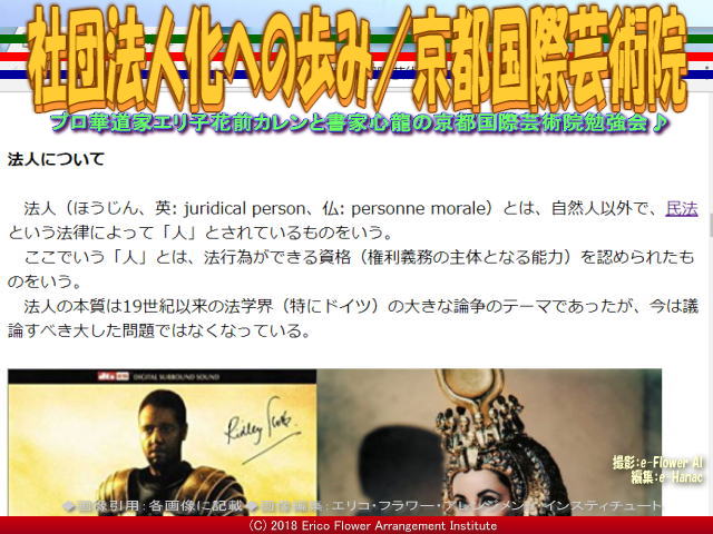 京都国際芸術院の社団法人化勉強会は、ひと・まち交流館京都(通称:まちセン)の第1会議室で行われました。 勉強会の時間割は以下です。 【勉強会の時間割】 ■第1時間目 エントリーシートと機関紙の配布 ■第2時間目 ご挨拶、心龍Ito&エリ子花前カレン ■第3時間目 法人について ■休憩と構外学習 市比賣神社(いちひめじんじゃ)参拝と散策 ■第4時間目 京都国際芸術院社団法人化の申請について ■第5時間目 社団法人京都国際芸術院の機関紙「アートの旅」について ■第6時間目 社団法人京都国際芸術院のあり方と今後 【社団法人化への歩み(5)/京都国際芸術院 02】 京都国際芸術院の社団法人化勉強会の第1時間目はエントリーシートと機関紙アートの旅(上の画像)の配布でした。 私の名前は、一応エリ子花前カレンですが、これはペンネームです。 この申込み書は、この第11回京都国際芸術院の社団法人化勉強会には誰がいらっしゃったかという簡単な記録です。 今回の勉強会は、私たちが京都国際芸術院をそのような組織形態にするかを、私たちも含んで、私たちのお弟子さんや生徒さんそれに出資をされる方に分かりやすく説明させていただきました。 今回は、今まで何度か行ってきた勉強会を、初めて公開させていただいたことになります。・・・つづく ちなみに、この社団法人設立の企画をしている私エリ子花前カレンは、岸和田市教育委員会生涯学習部生涯学習課が毎年開催している生涯学習のフラワーアレンジメント講座の講師の一人です。 自分の教室(イー・フラワーアレンジメント教室/英語名:e-Flower Arrangement Institute/略称:e-Flower AI)を運営しながら、25年前から岸和田市立葛城地区公民館有真香会館(『秋の2017文化祭(4)/花前カレン作品』『文化祭2017生け込み/女子会お茶会』『岸和田市2017文化祭(6)/葛城地区公民館まつり』他)では成人の部を、そして2017年から岸和田市(岸和田市教育委員会公式ページはこちら)主催の「キッズフラワー」講座(『第9回キッズフラワー感想(7)/エリ子花前カレン』他)を担当しています。 また、ワンオフレッスンとして、不定期的にJA(『JAいずみのフラワーアレンジ/花前カレン』『JA農協新春アレンジ手順/花前カレン』等)、その他の施設(『サンタのモスブーツ(3)/大芝地区公民館2016』『お正月飾り2017フラワーアレンジ/花前カレン』等)でお受けしています。作品展示販売は(『ららぽーと和泉こどもの日(4)/花前カレン』『ららぽーと和泉Xmasリース(3)/花前カレン』『産直市場よってって(5)/エリ子花前カレン』『和歌山道の駅くしがきの里/花前カレン』『フラワーアレンジ作品販売/2017公民館まつり』等)やイベント(『ベンツ堺南リニューアルFA(10)当日/花前カレン』『書道作品展フラワーアレンジ(3)/花前カレン』『ひなまつりフラワーアレンジ(9)/花前カレン』『リーフとフラワーアレンジ(5)/花前カレン』『入社式フラワーアレンジ(13) /エリ子花前カレン』『99本の薔薇の花束(6)/花前カレン』『就労支援にフラワーアレンジ/花前カレン』『公民館まつり2017/岸和田市立中央地区公民館』等)でのフラワーアレンジメントを企画・運営を含んだプロデュースを行っています。 また、各種行事(『メルセデスベンツ岸和田/花前カレン一期一会』『宝塚市長選フラワーアレンジ(3)/花前カレン』『日産大阪本店フラワーアレンジ/花前カレン』『入社式フラワーアレンジ/花前カレン一期一会』『お彼岸フラワーアレンジ/花前カレン一期一会』『ヤナセメルセデスベンツ岸和田/花前カレン』等)のフラワーアレンジメントの出張生け込みやお墓参り代行(※参照『お墓参り代行/花前カレン一期一会』『お墓参り草引き清掃供花/花前カレン』『お墓参り代行サービス/花前カレン』等)の各種サービスもさせていただいています。 ちなみに、このブログは、私、エリ子花前カレン(★YouTube動画『簡単クリスマスリース作り/TVKドレミファん』『公民館まつり2017/岸和田市立中央地区公民館』等)は京都国際芸術院のメンバーとして日本の各地の美術館や博物館を紹介するフリーペーパー「アートの旅」(640x480画像はこちらから)という小冊子を企画・出版しています。 facebook公開中・・・「いいね!」よろしくお願いいたします。 □テキスト編集:Fiori, Erico _ | ||||