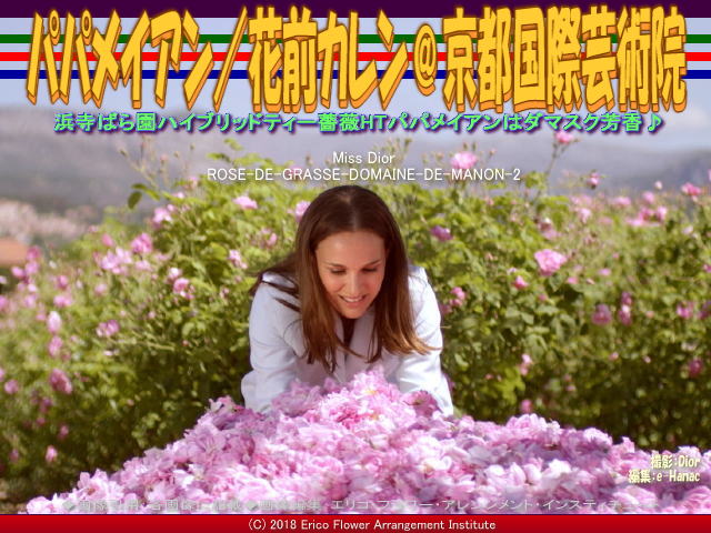 先月5月訪れた浜寺公園バラ園(浜寺公園ばら庭園)の洋風バラ庭園の一角にある、HTパパメイアンのバラ(薔薇ばら)を香ってみると本当に、良い香りがしました。 HTとは、ハイブリッドティーの省略です。 ハイブリッド・ティー (Hybrid tea) とは、「ハイブリッド・ティー - Wikipedia」を引用すると、<特定のガーデン・ローズ (garden roses) 類を指す、園芸における非公式な分類用語。2種類のバラを交配して作られたものであり、当初はハイブリッド・パーペチュアル・ローズ (hybrid perpetuals) とティー・ローズ (tea rose) をかけあわせた雑種として生まれた。モダン・ガーデン・ローズ (modern garden rose) に分類される品種の中では、最も古いものである。>と記載されています。 HTパパメイアンの香りはダマスク香(Damask)で強いとありました。 皆さんもダマスク香の香りを嗅いでみてください。 これが生のダマスク香なんだなぁ~って発見します。 タイトル画像の2本のバラ画像は浜寺バラ園<浜寺公園バラ園(浜寺公園ばら庭園)>の一角にあるHTパパメイアンです。 私はこのHTパパメイアンの香りを匂いだときに、以前にDiorのブログを書く際にお勉強したときのことが蘇ってきました。 「ディオールと薔薇・ばら・バラ/花前カレン」については以下のブログ 『ディオールと薔薇・ばら・バラ/花前カレン』 『ディオールと薔薇・ばら(2)/花前カレン』 『ディオールと薔薇(3)/花前カレン』 『ディオールとばら(4)/花前カレン』 『ディオールとバラ(5)/花前カレン』 で紹介してあります。 【HTパパメイアンDamask/京都国際芸術院 02】 香りや香水は“フレグランス fragrance”といいますが、香りは凄い力を持っているなぁ~と思います。 匂った途端、過去のシチュエーションとシーンに自分が転送されたようでした。 上の画像は、当時お勉強したときの「Miss Dior」のミューズ・ナタリー・ポートマンとグラースのバラ畑の画像です。 「南仏グラースのバラ畑/花前カレン一期一会」については以下のブログ 『南仏グラースのバラ畑/花前カレン一期一会』 『南仏グラースのバラ畑(2)/花前カレン』 『南仏グラースのバラ畑(3)/花前カレン』 で紹介してあります。あわせてご覧いただければ幸いです。・・・つづく ちなみに、このブログページは、一般社団法人京都国際芸術院代表理事の一人である私エリ子花前カレンが管理者です。私は、岸和田市教育委員会生涯学習部生涯学習課が毎年開催している生涯学習のフラワーアレンジメント講座の講師の一人でもあります。 私は自分の教室(イー・フラワーアレンジメント教室/英語名:e-Flower Arrangement Institute/略称:e-Flower AI)を運営しながら、25年前から岸和田市立葛城地区公民館有真香会館(『秋の2017文化祭(4)/花前カレン作品』『文化祭2017生け込み/女子会お茶会』『岸和田市2017文化祭(6)/葛城地区公民館まつり』他)では成人の部を、そして2017年から岸和田市(岸和田市教育委員会公式ページはこちら)主催の「キッズフラワー」講座(『第9回キッズフラワー感想(7)/エリ子花前カレン』『第9回キッズフラワー新春(5)/エリ子花前カレン』『ミニXmas会(6)/キッズフラワー花前カレン』他)を担当しています。 私、エリ子花前カレン関連ブログは、フラワーアレンジメントのプロフローリスト&花屋 『プロフローリスト花屋/花前カレン一期一会』 『プロフローリスト花屋(2)/花前カレン』 『プロフローリスト花屋(3)/花前カレン』 『プロフローリスト花屋(4)/花前カレン』 『プロフローリスト花屋(5)/花前カレン』 『プロフローリスト花屋(6)/花前カレン』 『プロフローリスト花屋(7)/花前カレン』 『プロフローリスト花屋(8)/花前カレン』 『プロフローリスト花屋(9)/花前カレン』 の花職人としても毎日一生懸命です。 週に2~3回は大阪鶴見の花卉市場に朝早くから仕入れ 『フラワーアレンジ市場編/公民館まつり2016花前カレン』 『フラワーアレンジ市場(2)/公民館まつり2016花前カレン』 をして、時には、これぞと思う季節の枝もの葉ものを求めてウチの裏山の植木山 『植木山の春木々/花前カレン一期一会』 『植木山の春木(2)/花前カレン一期一会』 『植木山の春木(3)/花前カレン一期一会』 『植木山の春木(4)/花前カレン一期一会』 『植木山の春木(5)/花前カレン一期一会』 『植木山の春木(6)/花前カレン一期一会』 『植木山の春木(7)/花前カレン一期一会』 『植木山の春木(8)/花前カレン一期一会』 に出掛けては、切り出しに行きます。 そして浜の市場・大阪府泉佐野漁業協同組合直結の青空市場(略称:泉佐野漁協青空市場)の 『フラワーショップ園部/花前カレン』 『フラワーショップ園部(2)/花前カレン』 『フラワーショップ園部(3)/花前カレン』 『フラワーショップ園部(4)/花前カレン』 『フラワーショップ園部(5)/花前カレン』 でも働いていますが、シフトでたまに 『岡田浦日曜朝市(3)/花前カレン』 『岡田浦日曜朝市(2)/花前カレン』 『岡田浦日曜朝市/花前カレン一期一会』 で花職人として威勢よく声出しをしています。 あ、それと