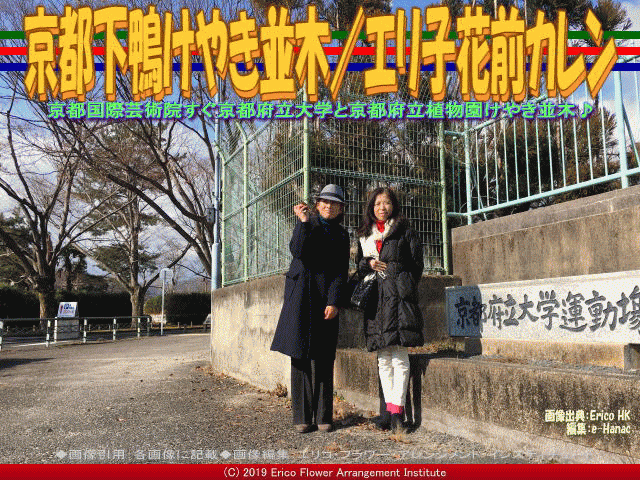上の画像は、下のマップでお分かりのように(詳しくはGoogleMapストリートビュー参照)、京都府立植物園けやき並木の西側の京都府立大学下鴨キャンパス内にある、京都府立大学運動場の南東の角、「京都府立大学運動場」校標の前で撮影したビジュアルです。 このブログのタイトルの「京都下鴨けやき並木」とは、京都市左京区下鴨半木町(キヨウトシサキヨウクシモガモハンギチヨウ)にある、京都府立植物園けやき並木です。 今回は、我が非営利型一般社団法人京都国際芸術院(法人番号7130005015305/略称:KIAIGIA/キアイジャ/公式ページ/Facebookページ/公式Twitter/代表のTwitter)北洞院流書法道の総帥(そうすい)吉祥院心龍北洞院流書法道正師範(心龍ITO/伊藤心龍改め、公式ブログ、公式Blog2アメブロ、facebook、Instagram、YouTube、公式HP)を案内しました。 【京都下鴨けやき並木(2)/エリ子花前カレン 02】 京都府立植物園には正門と北山門と賀茂川門がありますが、トップ画像は正門前に繋がる京都下鴨けやき並木の横の「京都府立大学運動場」という校標の前です。 上のマップ内に小さく写っているところが、「京都府立大学運動場」という校標のある場所です。 以前から北大路橋を通る度に、京都府立植物園京都下鴨けやき並木道の桜の季節や紅葉の秋に二人で歩こうと言っていたのに、もう季節は冬になってしまいました。 京都市内では、一番早く紅葉を見ることができるといわれているのは京都府立植物園前の京都下鴨けやき並木です。 前回ブログ『京都下鴨けやき並木/エリ子花前カレン』で、<けやき並木はすっかりスケルトン枝木のけやき(欅・ケヤキ)です。>と書きましたが、よくよく見ると、スケルトン枝木の京都下鴨けやき並木も趣があって素敵です。・・・つづく ちなみに、このブログページは、非営利型一般社団法人京都国際芸術院(略称:KIAIGIA/キアイジャ/公式ページ/Facebookページ/公式Twitter/代表のTwitter)花の代表、北洞院流華法道の家元として指揮を執る私エリ子花前カレン(公式ブログ、Profile、facebook、Twitter、公式HP1、公式HP2)が管理者です。 我が非営利型一般社団法人京都国際芸術院は、昨年2018年5月に京都中京の四条に法人設立した組織です。設立当初は、書と花をコアにして、書は、吉祥院心龍北洞院流書法道正師範(公式ブログ、公式Blog2アメブロ、facebook、Instagram、YouTube、公式HP)、そして花は私エリ子花前カレンの二人で、京都と大阪と兵庫で活動しています。 最近の実働としては、我が非営利型一般社団法人京都国際芸術院(略称:KIAIGIA/キアイジャ/公式ページ/Facebookページ/公式Twitter/代表のTwitter)は現時点で、書と花と出版をメインテーマにして、教室運営、出張講座、イベント企画と運営、出版、ウェッブ授業とデジタルコンテンツ作成と提供、書と花の各師範の作品開発・販売などを行っています。 設立の2018年は私は、特に一般社団法人京都国際芸術院の設立(『社団法人化への歩み(6)/京都国際芸術院』など)や奈良ホテルでの記念式典(『奈良ホテル書花展(10)/京都国際芸術院』など)、出版事業部の初仕事(『アートの旅/一般社団法人京都国際芸術院』『アートの旅美術館/エリ子花前カレン』『アートの旅facebook記事/京都国際芸術院』『アートの旅松本編集長/京都国際芸術院』など)、産直市場よってって新規開店(『よってって和泉中央(4)/エリ子花前カレン』など)でのプロパー作品展示販売、そして公式ページの立上げやFcebookページやTwitterの開設、そして個人的には動画編集ビデオ制作の学習(『ビデオ制作勉強会(9)/エリ子花前カレン』など)等、ネット関連の仕事も増えて、有難くもどんどん忙しくなってきています。 私は、自分の教室(イー・フラワーアレンジメント教室/英語名:e-Flower Arrangement Institute/略称:e-Flower AI)を運営しながら、25年以上前から岸和田市立葛城地区公民館有真香会館(『秋の2017文化祭(4)/花前カレン作品』『文化祭2017生け込み/女子会お茶会』『岸和田市2017文化祭(6)/葛城地区公民館まつり』他)では成人の部を、そして2017年から岸和田市(岸和田市教育委員会公式ページはこちら)主催の「キッズフラワー」講座(『第9回キッズフラワー感想(7)/エリ子花前カレン』『第9回キッズフラワー新春(5)/エリ子花前カレン』『ミニXmas会(6)/キッズフラワー花前カレン』他)を担当しています。 私のフラワーアレンジメントプロフローリスト&花屋関連ブログは、 『プロフローリスト花屋/花前カレン一期一会』 『プロフローリスト花屋(2)/花前カレン』 『プロフローリスト花屋(3)/花前カレン』 『プロフローリスト花屋(4)/花前カレン』 『プロフローリスト花屋(5)/花前カレン』 『プロフローリスト花屋(6)/花前カレン』 『プロフローリスト花屋(7)/花前カレン』 『プロフローリスト花屋(8)/花前カレン』 『プロフローリスト花屋(9)/花前カレン』 の花職人としても毎日一生懸命です。 週に2~3回は大阪鶴見の花卉市場に朝早くから仕入れ 『フラワーアレンジ市場編/公民館まつり2016花前カレン』 『フラワーアレンジ