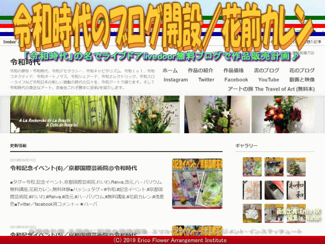 上のタイトル画像は、先週末から我が非営利型一般社団法人京都国際芸術院(略称:KIAIGIA/キアイジャ/公式ページ/Facebookページ/公式Twitter/代表のTwitter)北大路下鴨ワークショップスタジオ(下鴨WSスタジオ)で新規にみんなで作っているライブドア(livedoor)の令和時代のブログページです。 そのブログサイトのタイトルは「令和時代」です。 この「令和時代」のブログサイトは、私たちの作品を販売して、我が京都国際芸術院の活動資金の捻出に役立てようと思っています。 どうかご協力いただけきますようお願い申し上げます。 「令和時代」になった令和元年(2019年)5月1日(水)から4日間、最初の令和週間では令和時代の「令和記念イベント」でハーバリウム無料講座無料教室を行いました。 それらの案内については、京都下鴨地区に5月1日(水)に五大紙(京都新聞、朝日新聞、読売新聞、毎日新聞、産経新聞)のこのような折込みチラシを配布しました。 期間外でも、インストラクターの手が空いているときは、予約をお受けして個人的にもハーバリウム製作やその他色々なデザインのフラワーアレンジメント作品お教えさせて頂いたり、花と緑のセラピー効果について勉強会を開いております。 「令和記念イベント」でハーバリウム無料講座無料教室については、以下のブログ 『令和記念イベント(6)/京都国際芸術院』 『令和記念イベント(5)/京都国際芸術院』 『令和記念イベント(4)/京都国際芸術院』 『令和記念イベント(3)/京都国際芸術院』 『令和記念イベント(2)/京都国際芸術院』 『令和記念イベント/京都国際芸術院』 をアップしてあります。 【令和時代のブログ開設/花前カレン 02】 また令和元年5月7日から13日までの第2週目は「令和時代」の「梅・菫・桜」カラーを使って生けた、令和時代魁のいけばなフラワーアレンジメントについて紹介しました。 我が非営利型一般社団法人京都国際芸術院(略称:KIAIGIA/キアイジャ/公式ページ/Facebookページ/公式Twitter/代表のTwitter)の花の代表、北洞院流華法道家元エリ子花前カレン(公式ブログ、Profile、facebook、Twitter、公式HP1、公式HP2)が、『令和記念イベント』としてハーバリウム無料教室・無料講座を催行の際に、参加者様の緊張の軽減と癒しと潤いをテーマに生けたフラワーアレンジメントは好評でした。 「令和カラーいけばな/京都北洞院流」ブログについては今までに以下のブログ 『令和カラーいけばな(5)/京都北洞院流』 『令和カラーいけばな(4)/京都北洞院流』 『令和カラーいけばな(3)/京都北洞院流』 『令和カラーいけばな(2)/京都北洞院流』 『令和カラーいけばな/京都北洞院流』 を作成してアップしてあります。・・・つづく 今回の『令和記念イベント』の教材としての「ハーバリウム」については、北洞院流華法道家元エリ子花前カレン(公式ブログ、Profile、facebook、Twitter、公式HP1、公式HP2)は、多くのレッスンを行って来ています。 まずは『ハーバリウム作り@5じやん!/テレビ岸和田EX版/京都国際芸術院』をご覧くださいませ。 【ハーバリウム作り@5じやん!/テレビ岸和田EX版/京都国際芸術院】 ■URL: 以下です。 ※クリックでYouTube動画が観れます。 □https://youtu.be/IBMht5basnQ □https://youtu.be/Oe2BKEqevao ■ジャンル: YouTubeビデオ ■形式: MP4 ■長さ: 00:13:31 ■サイズ: 789MB ■フレーム: 1280x720pxls ■公開: 2019/04/18 ■発信元: 非営利型一般社団法人 京都国際芸術院 TVKテレビ岸和田で北洞院流ハーバリウムが紹介された生番組「5じやん!ハーバリウム」については以下のブログ 『5じやん!ハーバリウム/北垣有唯』 『5じやん!ハーバリウム/加納永美子』 『5じやん!ハーバリウム/川崎亜沙美』 『5じやん!ハーバリウム/真輝志@きんめ鯛』 『5じやん!ハーバリウム/記念撮影』 『5じやん!ハーバリウム/北洞院流工房』 『5じやん!ハーバリウム/北洞院流家元』 『5じやん!ハーバリウム/北洞院流白原』 『5じやん!ハーバリウム/北洞院流』 『5じやん!(5)/TVKテレビ岸和田』 『5じやん!(4)/TVKテレビ岸和田』 『5じやん!(3)/TVKテレビ岸和田』 『5じやん!(2)/TVKテレビ岸和田』 『5じやん!/TVKテレビ岸和田』 を作成してアップしてあります。 また、ハーバリウム体験や講座・レッスン関連ですこし例に挙げると、今までに 『ハーバリウム製作体験(3)/有真香会館』 『ハーバリウム製作体験(2)/有真香会館』 『ハーバリウム製作体験/有真香会館』 『岸和田教育委員会FA講座(5)/エリ子花前カレン』 『岸和田教育委員会FA講座(4)/エリ子花前カレン』 『岸和田教育委員会FA講座(3)/エリ子花前カレン』 『岸和田教育委員会FA講座(2)/エリ子花前カレン』 『岸和田教育委員会FA講座/エリ子花前カレン』 などのブログを作成して紹介してあります。 最近行った少人数でのフラワーアレンジメントにおけるハーバリウムセラピーについては以下のブログ 『煉瓦館ハーバリウム(5)/北洞院流』 『煉瓦館ハーバリウム(4)/北洞院流』 『煉瓦館ハーバリウム(3)/北洞院流』 『煉瓦館ハーバリウム(2)/北洞院流』 『煉瓦館ハーバリウム/北洞院流』 