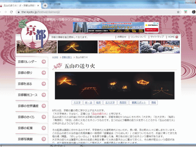 上のタイトル画像は、「ざ・京都」サイトの「五山の送り火」ページのプリントスクリーンショット・ビジュアルです。 京都五山の送り火について、このページを引用しますと、以下 <8月16日、京都の夏の夜に浮かび上がる大の文字。「大文字焼き」ではなく、正確には「五山の送り火」と呼びます。五山の送り火とはお盆に行われる京都の伝統行事で、京都を囲む5つの山にそれぞれ「大文字」「左大文字」「船形」「鳥居形」「妙法」の形に火をともすというものです。五つの山に5種類の送り火を焚くところから「五山の送り火」と呼ばれるようになりました。その起源は諸説に分かれるのですが、平安時代とも室町時代ともいわれ、長い間、京の町の人々に親しまれています。この五山の送り火はお盆の先祖供養の一般信仰「盂蘭盆会(うらぼんえ)」と結びついたもので、お盆に帰ってきた先祖の魂(精霊。「おしょらいさん」)を各家で供養した後、再びあの世に送り出すという意味があります。大文字の送り火は護摩木に自分の名前と病名を書いて火床の割木の上に載せて焚くと、その病が癒るという信仰があり、また消炭を持ち帰って粉末にして服すると、持病が癒るとも言われています。送り火は、京都三大祭(葵祭、祇園祭、時代祭)に加えて、京都四大行事とも言われています。> と紹介されています。 【五山送り火(3)/北洞院エリ子花前カレン 02】 さて、8月16日金曜日五山送り火の当日、午後7時過ぎ松ヶ崎「妙法」の撮影に出かける時間です。 我が京都四条北洞院流の非営利型一般社団法人京都国際芸術院(法人番号7130005015305/略称:KIAIGIA/キアイジャ/公式ページ/Facebookページ/公式Twitter/代表のTwitter)北大路WSS(下鴨北大路ワークショップオフィス)から自転車と徒歩で取材に出かけます。 上の画像は、北大路通りに面している我が北大路WSS(下鴨北大路ワークショップオフィス)の朝6時過ぎのワンショットビジュアルです。 実は、北大路WSS(下鴨北大路ワークショップオフィス)の窓からは、高さの問題で松ヶ崎「妙法」の「妙」という字の一部だけ見ることが出来ます。 このお盆の終り夏の夜空を彩る「京都五山送り火」は、京都のお盆のビッグイベントです。 大文字(東山如意ケ嶽)、妙法 (松ヶ崎西山・東山)、舟形(西賀茂船山)、左大文字(金閣寺大北山)、鳥居形(嵯峨曼荼羅山)の五山送り火は盂蘭盆・お盆にお戻りのおしょらいさん(お精霊さん/ご先祖の魂)を再びあの世浄土に送り出すという伝統的な行いです。・・・つづく このブログページは、我が非営利型一般社団法人京都国際芸術院(法人番号7130005015305/略称:KIAIGIA/キアイジャ/公式ページ/Facebookページ/公式Twitter/代表のTwitter)花の代表、北洞院流華法道の家元として指揮を執る私北洞院エリ子花前カレン(公式ブログ、Profile、facebook、Twitter、公式HP1、公式HP2)が管理者です。 我が非営利型一般社団法人京都国際芸術院は、昨年2018年5月に京都中京の四条に法人設立した組織です。設立当初は、書と花をコアにして、書は、吉祥院心龍北洞院流書法道正師範(公式ブログ、公式Blog2アメブロ、facebook、Instagram、YouTube、公式HP)、そして花は私北洞院エリ子花前カレンの二人で、京都と大阪と兵庫で活動しています。 設立の2018年は私は、特に一般社団法人京都国際芸術院の設立(『社団法人化への歩み(6)/京都国際芸術院』など)や奈良ホテルでの記念式典(『奈良ホテル書花展(10)/京都国際芸術院』など)、出版事業部の初仕事(『アートの旅/一般社団法人京都国際芸術院』『アートの旅美術館/エリ子花前カレン』『アートの旅facebook記事/京都国際芸術院』『アートの旅松本編集長/京都国際芸術院』など)、産直市場よってって新規開店(『よってって和泉中央(4)/エリ子花前カレン』など)でのプロパー作品展示販売、そして公式ページの立上げやFcebookページやTwitterの開設、そして個人的には動画編集ビデオ制作の学習(『ビデオ制作勉強会(9)/エリ子花前カレン』など)等、ネット関連の仕事も増えて、有難くもどんどん忙しくなってきました。 また、2019年4月には京都下鴨北大路通りに北大路WS2(ワークショップ・スタジオ)を開設しました。※改装準備中の画像(※引用『北洞院流スタジオ改造(8)/京都国際芸術院』など)はこちら。 最近の我が非営利型一般社団法人京都国際芸術院の実働としては、書と花と出版をメインテーマにして、教室運営、出張講座、イベント企画と運営、出版、ウェッブ授業とデジタルコンテンツ作成と提供、京都四条北洞院流書法道と華法道認定の各師範の作品開発・頒布販売(<令和時代><作品価格@令和時代>)などを行っています。 とりわけ人気のハーバリウム体験や講座・レッスン関連ですこし例に挙げると、今までに 『ハーバリウム製作体験(3)/有真香会館』 『岸和田教育委員会FA講座(5)/エリ子花前カレン』『煉瓦館ハーバリウム(5)/北洞院流』を行い、一部ブログを作成して紹介してあります。 ハーバリウム体験授業の中で必ず口頭で紹介させて頂きます「アー