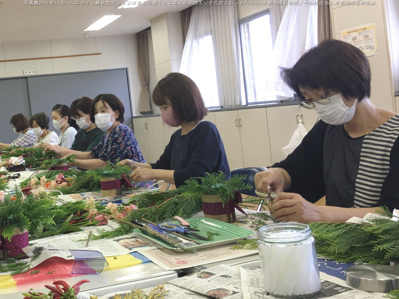 先日2021年10月13日(水)に開催された岸和田市立葛城地区公民館(有真香会館)のフラワーアレンジ講座「ハロウィン風秋色アレンジ」のレッスン風景です。
