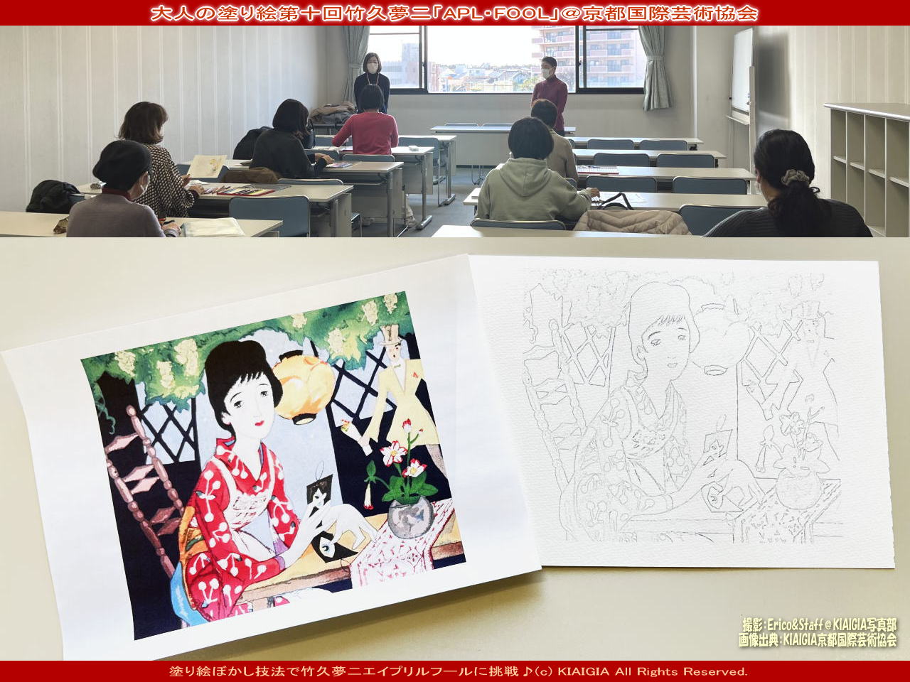 トップのタイトル画像は、上の画像は岸和田市教育委員会生涯学習授業前の社会教育指導員の西村千都子(にしむらちずこ)さんのご挨拶の様子、そして下、大人の塗り絵第十回の課題<竹久夢二さんの「APL・FOOL」(エイプリルフール)>のお手本画像とを合わせで編集したワンショットビジュアルです。