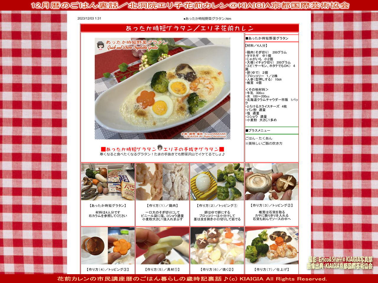■Xツィート(旧Twitter)とfacebook用コメント=★花前カレンの市民講座「暦のごはん~暮らしの歳時記(実習編)」12月はあったか時短野菜グラタン♪