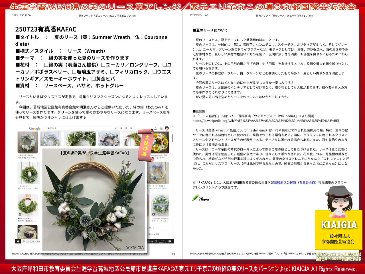 ファイルサブタイトルは、「明瀬さん提供綿の実リース夏アレンジ挑戦!KAFAC市民講座♪(c)