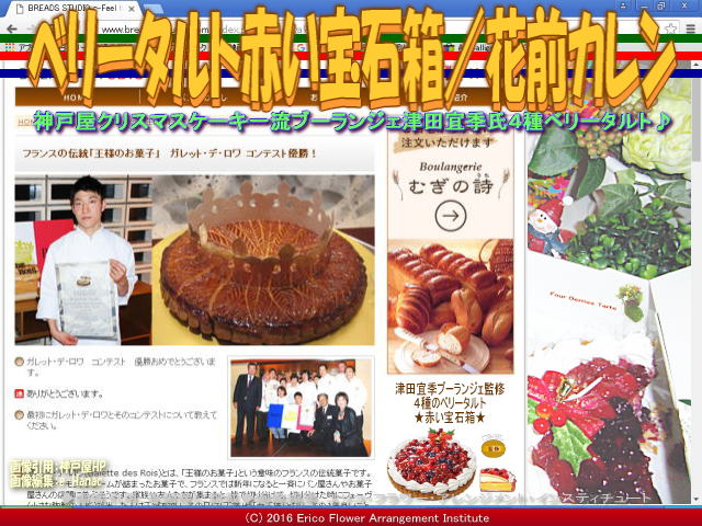 今回の紹介ブログは、『ベリータルト赤い宝石箱/花前カレン』です。 恒例のクリスマスケーキと2016年神戸屋クリスマスタルトについて、本ブログを含んで、以下のブログ 『ベリータルト赤い宝石箱/花前カレン』 『神戸屋4種のベリータルト/花前カレン』 『Xmasクリスマスタルト/花前カレン一期一会』 『Xmasクリスマスケーキ/花前カレン一期一会』 を作成・アップしています。あわせてご覧頂ければ幸いです。 さて、こんな綺麗で美味しい神戸屋のXmasクリスマスケーキ・タルトケーキ4種のベリー・タルト「赤い宝石箱 4種のベリーのタルト」。誰が作ったんだろうって、物を作るプロとして、私はとても興味を持ちました。神戸屋専属の津田宜季ブーランジェ・パティシエさんというお方がこのベリータルト赤い宝石箱を作って監修していました。ネーミングも洒落ています。「4種のベリーのタルト」の「4種のベリー」とは、イチゴ、ブルーベリー、クランベリー、ラズベリーで、それぞれの英語には、語尾に「~berry ベリー」が付くのでそう命名したのでしょうか。津田宜季ブーランジェ・パティシエさんの事をちょっとネットで調べてみました。 【ベリータルト赤い宝石箱/花前カレン 01】 神戸屋公式ページの「BREADS STUDIO ~Feel the Quality~ 神戸屋」ページの<パンとわたし/ フランスの伝統「王様のお菓子」 ガレット・デ・ロワ コンテスト優勝!>というページに津田宜季ブーランジェ・パティシエさんの事が掲載されていました。 【ベリータルト赤い宝石箱/花前カレン 02】 引用すると、<フランスの伝統「王様のお菓子」 ガレット・デ・ロワ コンテスト優勝!ガレット・デ・ロワ コンテスト 優勝おめでとうございます。ありがとうございます。最初にガレット・デ・ロワとそのコンテストについて教えてください。フランスの伝統「王様のお菓子」 ガレット・デ・ロワ コンテスト優勝!ガレット・デ・ロワ(Galette des Rois)とは、「王様のお菓子」という意味のフランスの伝統菓子です。パイにアーモンドクリームが詰まったお菓子で、フランスでは新年になると一斉にパン屋さんやお菓子屋さんの店頭に並ぶそうです。家族や友人たちが集まると、皆で切り分けて、切り分けた時にフェーヴ(小さな陶製の人形)が当った人は王冠を被り、その日は「王様」や「女王様」となり、その1年良いことがあると言われています。パリでは毎年このガレット・デ・ロワのコンクールが行われ、1月にはなんとフランス大統領とパリ市長に特大のガレット・デ・ロワが献上されるそうです。日本では、2003年から「クラブ・ドゥ・ラ・ガレット・デ・ロワ」主催でコンテストが行われるようになりました。全国の製菓、製パンのプロが対象で、日本のコンテスト優勝者はパリで行われるコンクールに日本代表として参加できます。えっ!日本代表としてパリに?そう…ですネ。(照) パリには来年2011年の1月に・・・以下こちらを参照>とあります。 【ベリータルト赤い宝石箱/花前カレン 03】 以下は、この美味しいXmasクリスマスケーキ・タルトケーキ4種のベリー・タルト「赤い宝石箱 4種のベリーのタルト」を作る津田宜季ブーランジェ・パティシエの簡単プロフィールを紹介します。 【津田宜季 簡単プロフィール】 ■2005年大学時代は環境学部で、パンとは直接関係なかったが、アルバイト先のフランス料理店でお世話になった方の影響で、食の世界に興味を持ち、食に関わる仕事がしたいと思うようになる。 ■就活当時、レストラン、洋菓子店などいろいろ見て回るも、特別でなく、毎日食べるもの、日常的でより生活に密着しているからという理由でパンを選ぶ。学生時代旅行したフランスの町の何気ないパン屋さんに、毎朝近隣の人たちがバゲットやクロワッサンを買いに並んでいる光景や文化に憧れを感じたことも理由の一つ。 ■ガレット・デ・ロワは学生時代に知り、入社後、社外の講習会や上司、専門書などから学び知識を深める。 ■2005年 神戸屋入社。神戸屋レストラン勤務。 ■2006年 現在の勤務場所「ブレッドラブ」に異動。初めてパン作りを経験。 (「ブレッドラブ」とは手づくりの高付加価値商品を生産・開発しながら、全社的視点で技術の高度化や基盤の確立を目指した「錬成の場(人材育成・技術の伝承・新技術の開発)」として位置づけられた、神戸屋のこだわりの部署。) ■2008年 クラブ・ドゥ・ラ・ガレット・デ・ロワ主催のガレット・デ・ロワ・コンテストに応募。最終審査で敗退 ■2009年 同コンテストに再挑戦。見事グランプリ獲得。 ■2010年 1月フランス大使、フランス総領事に特大ガレット・デ・ロワを献上。 ■2011年 1月フランス、パリにて開催のガレット・デ・ロワ・コンクールに出場予定。 津田宜季ブーランジェ・パティシエさんのプロフィール・経歴を見て、すごいなぁ~って感動できるレベルだから、「赤い宝石箱 4種のベリーのタルト」のような美味しい物が作れるんだなあ~と感激すること頻り(しきり)の花前