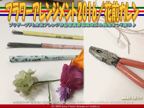 今回の紹介ブログは、『プリザーブドフラワーアレンジ(2)/葛城地区公民館まつり2016』です。 前回(昨日)のブログ『プリザーブドフラワーアレンジ/花前カレン』の続きです。 前々回(一昨日)のブログ『フラワーアレンジメント2016/花前カレン』から続いています。画像タイトルは「フラワーアレンジメント2016/花前カレン」で統一しています。 さて、プリザーブドフラワーは、生花のような感じにアレンジするのも素敵ですが、ペンチや針金やテープで切ったり貼り付けたり細かな大工さんのようなクラフトチックに楽しむこともできます。プリザーブドフラワーアレンジメントは、生花のフラワーアレンジの技スキルをベースにしながら、生花のフラワーアレンジの枠にとらわれずに、プリザーブドフラワーならではのワイヤリングメソッドを使ってアレンジを自由に考えていくことができます。ただ、プリザーブドフラワーは、生花もそうなのですが、とりわけプリザーブドフラワーはワイヤリングやテーピングなどの手を加える加工作業過程では丁寧に扱わなければなりません。 【プリザーブドフラワーアレンジ(2)/葛城地区公民館まつり2016 01】 まず、プリザーブドフラワー花材の加工には、いくつかの技法テクニックがあります。「メソッド」や「メソード」と呼ばれています。プリザーブドフラワーの花材には茎が殆ど無いために、針金(ワイヤー)を突き刺して人工のステム(stem茎)を作ってからアレンジします。この作業をワイヤリング(ワイヤーリング)と言います。ワイヤーの太さはワイヤ♯24(ワイヤー♯24)とかワイヤ♯22(ワイヤー♯22)と表記して販売されています、数字が大きいほど細いワイヤーです。 【プリザーブドフラワーアレンジ(2)/葛城地区公民館まつり2016 02】 今回のプリザーブドフラワー花材は主にバラとアジサイを用います。バラなどの花の場合、通常は裸線ワイヤーでワイヤリングしてからテープを巻きます。しかし色の付いたカラーワイヤーも販売されています。販売されている花材によっては、茎が殆ど無かったり、細かったりで、案外ワイヤリングに梃子摺るばあいがありますが、工夫しながら根気よく丁寧に作業することが大切です。それがアレンジスキルの上達に繋がります。 【プリザーブドフラワーアレンジ(2)/葛城地区公民館まつり2016 03】 プリザーブドフラワーアレンジメントのワイヤリング(ワイヤーリング)テクニックには次のようなメソッド(メソード)があります。インサーションメソッドInsertionMETHOD(刺しどめ)、クラッチメメソッドClutchMethod(挟みどめ)、クロスメソッドCrossMethod(十時止め)、ソーイングメソッドSewingMethod(縫いどめ)、セキュアリングメソッドSecuringMethod(補強)、ツイスティングメソッドTwistingMethod(巻きどめ)、ピアスメソッド・ピアシングPiercingMethod(横ざしどめ)、フェーザーリングメソッドFeatherMethod(組み直し)、フックメメソッドHookMethod(かぎどめ、ヘアピンメソッドHairpinMethod(U字どめ)等です。・・・つづく ちなみに、今年2016年(平成28年)岸和田市第53回岸和田公民館まつりでは、岸和田市生涯学習部生涯学習課の取り組みとして、「集い・学び・地域と連携しよう。」というテーマで大阪府岸和田市葛城地区(おおさかふきしわだしかつらぎちく)「葛城地区公民館」(別名「有真香会館(ありまかかいかん)」)でも開催されました。葛城地区公民館まつりも、「発表の部」と「展示の部」の2部構成で行われました。「発表の部」が去る2016年(平成28年)10月15日(土)に、「展示の部」が明日明後日2日間2016年(平成28年)10月22日(土)23日(日)、そして体験コーナーと模擬店が3日間通して開催されました。※アクセスマップ。 私たち葛城地区公民館(有真香会館)フラワーアレンジクラブ(KAFAC)も作品展示させていただきました。フラワーアレンジメントのクラブ講師を務める私、花前カレンのブログでは、葛城地区公民館」(有真香会館)関連ブログは今までに、以下 『葛城地区公民館まつり(6)/花前カレン』 『葛城地区公民館まつり(5)/花前カレン』 『葛城地区公民館まつり(4)/花前カレン』 『葛城公民館祭2016展示/花前カレン』 『葛城公民館祭2016発表/花前カレン』 『葛城地区公民館祭2016/花前カレン』 『葛城地区公民館まつり(3)/花前カレン』 『葛城地区公民館まつり(2)/花前カレン』 『葛城地区公民館まつり/花前カレン』 『有真香会館花アレンジ/花前カレン』 『フラワーアレンジメント/花前カレン』 『有真香花アレンジクラブ/花前カレン』 『有真香2015Xmasリース/花前カレン』 『葛城地区公民館/花前カレン』 『有真香会館/花前カレン』 のように作成・アップしてあります。 あわせてご覧いただければ幸いです。 □テキスト編集:Fiori, Erico _ |