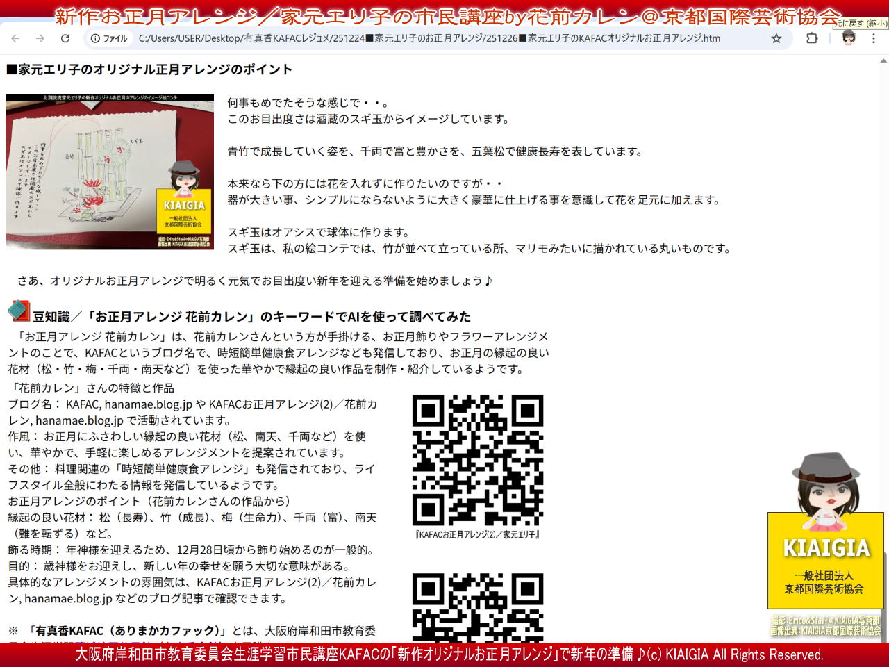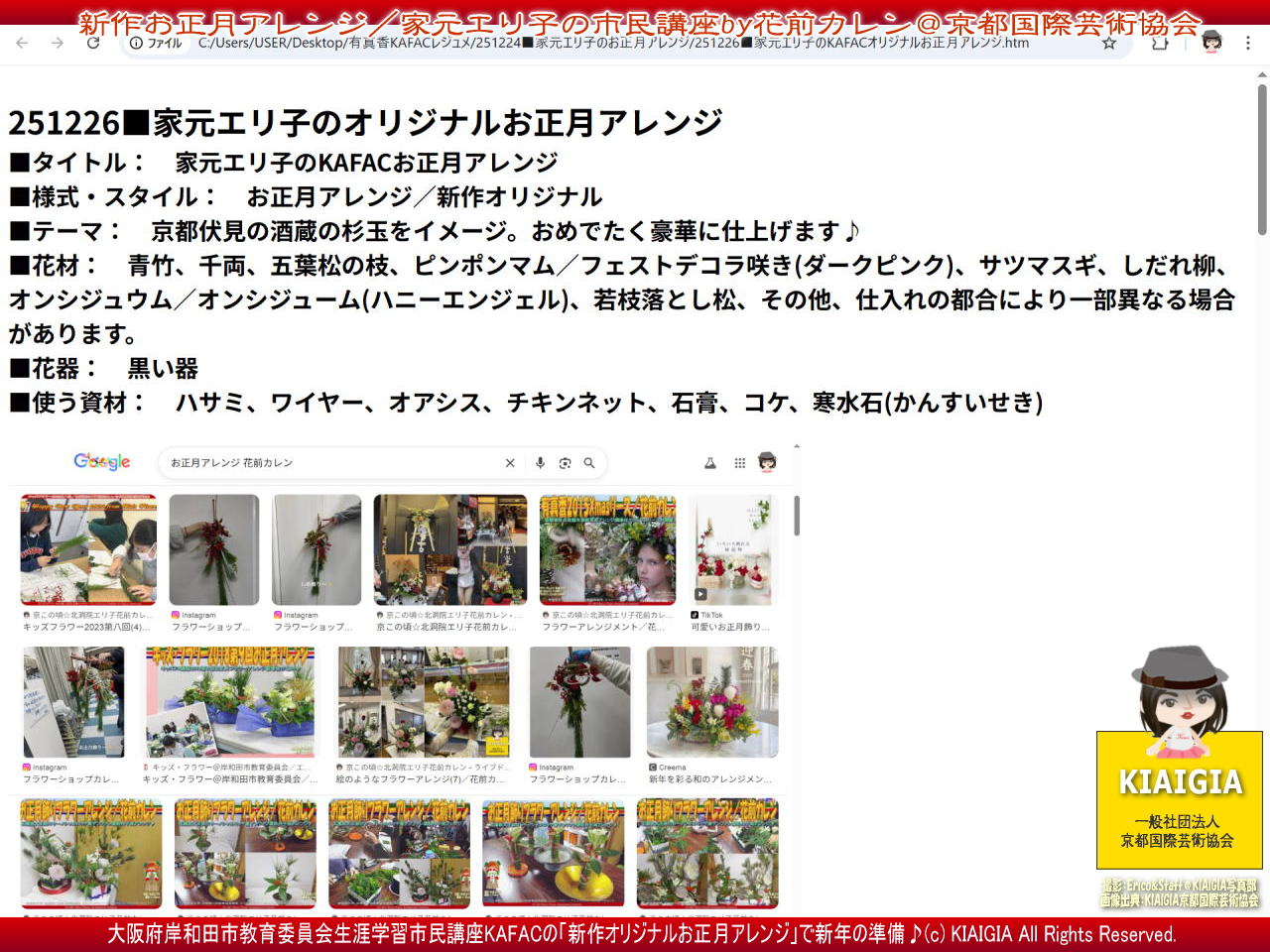 さて、トップのタイトル画像の上部は講座データで、2025年12月26日(金)の大阪府岸和田市教育委員会生涯学習市民講座フラワーアレンジクラブ講座KAFACで「251226■家元エリ子のオリジナルお正月アレンジ」フラワーアレンジメントレッスンでの生徒に配布するレジュメ(教本)の元資料の一部のワンショットビジュアルです。