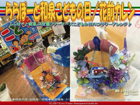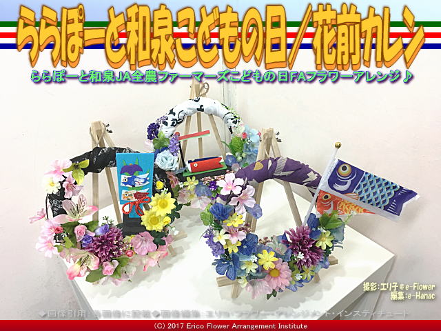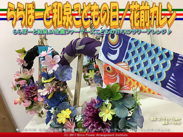 今回の紹介ブログは、『ららぽーと和泉こどもの日(4)/花前カレン』です。 今回のブログ記事「ららぽーと和泉こどもの日/花前カレン」については、先日より以下のブログページ 『ららぽーと和泉こどもの日(3)/花前カレン』 『ららぽーと和泉こどもの日(2)/花前カレン』 『ららぽーと和泉こどもの日/花前カレン』 作成して、アップしています。画像タイトルは、「ららぽーと和泉こどもの日/花前カレン」で統一しています。 ららぽーと和泉のJAファーマーズ・マーケットでの展示販売は、今までに以下のブログ 『ひなまつりフラワーアレンジ/花前カレン』 『ひなまつりフラワーアレンジ(2)/花前カレン』 『ひなまつりフラワーアレンジ(3)/花前カレン』 『ひなまつりフラワーアレンジ(4)/花前カレン』 『ひなまつりフラワーアレンジ(5)/花前カレン』 『ひなまつりフラワーアレンジ(6)/花前カレン』 『ひなまつりフラワーアレンジ(7)/花前カレン』 『ひなまつりフラワーアレンジ(8)/花前カレン』 『ひなまつりフラワーアレンジ(9)/花前カレン』 『ららぽーと和泉Xmasリース(3)/花前カレン』 『ららぽーと和泉Xmasリース(2)/花前カレン』 『ららぽーと和泉Xmasリース/花前カレン』 をアップしてあります、 そして子供の日の鯉のぼりについては以下 『子供の日鯉のぼり(2)/花前カレン』 『子供の日鯉のぼり/花前カレン』 をアップしてあります、あわせてご覧いただければ幸いです これらの、こどもの日用のフラワーアレンジメント作品は、ららぽーと和泉のJA全農ファーマーズ・マーケットで展示販売されました。 FAフラワーアレンジメント作品画像(4) 【ららぽーと和泉こどもの日(4)/花前カレン 01】 私たち、FA(フラワーアレンジメント教室/e-Flower Arrangement Institute)の作品が、とても有名で連日訪問者が絶え間のない、ららぽーと和泉JA全農ファーマーズ・マーケットで展示させていただき、おまけにお値段も付けて頂きウレシイです。 FAフラワーアレンジメント作品画像(5) 【ららぽーと和泉こどもの日(4)/花前カレン 02】 FAフラワーアレンジメント作品画像(6) 【ららぽーと和泉こどもの日(4)/花前カレン 03】 これを展示している事が御縁で、和歌山県かつらぎ町の道の駅 くしがきの里でも展示販売させていただく事になりました。2017年5月の母の日に合わせて、作品制作を行ってまいります。何だか人のつながりで想像を越える展開になってきて、ちょっと驚いている花前カレンの今日この頃です。 因みに、エリ子花前カレンのフラワーアレンジメントのプロフローリスト、花屋の花職人 『プロフローリスト花屋/花前カレン一期一会』 『プロフローリスト花屋(2)/花前カレン』 『プロフローリスト花屋(3)/花前カレン』 『プロフローリスト花屋(4)/花前カレン』 『プロフローリスト花屋(5)/花前カレン』 『プロフローリスト花屋(6)/花前カレン』 『プロフローリスト花屋(7)/花前カレン』 『プロフローリスト花屋(8)/花前カレン』 『プロフローリスト花屋(9)/花前カレン』 として毎日一生懸命です。そしてこれぞと思う季節の枝もの葉ものを求めてウチの裏山の植木山 『植木山の春木々/花前カレン一期一会』 『植木山の春木(2)/花前カレン一期一会』 『植木山の春木(3)/花前カレン一期一会』 『植木山の春木(4)/花前カレン一期一会』 『植木山の春木(5)/花前カレン一期一会』 『植木山の春木(6)/花前カレン一期一会』 『植木山の春木(7)/花前カレン一期一会』 『植木山の春木(8)/花前カレン一期一会』 に出掛けては、切り出しに行きます。 あわせてご覧いただければ幸いです。 □テキスト編集:Fiori, Erico _ |