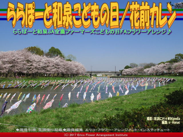 今回の紹介ブログは、『ららぽーと和泉こどもの日/花前カレン』です。 こどもの日に合わせて、ららぽーと和泉のJAファーマーズで、こどもの日のFA(フラワーアレンジメント)の作品を商品化させていただきました。 ららぽーと和泉のJAファーマーズ・マーケットでの展示販売は、今までに以下のブログ 『ひなまつりフラワーアレンジ/花前カレン』 『ひなまつりフラワーアレンジ(2)/花前カレン』 『ひなまつりフラワーアレンジ(3)/花前カレン』 『ひなまつりフラワーアレンジ(4)/花前カレン』 『ひなまつりフラワーアレンジ(5)/花前カレン』 『ひなまつりフラワーアレンジ(6)/花前カレン』 『ひなまつりフラワーアレンジ(7)/花前カレン』 『ひなまつりフラワーアレンジ(8)/花前カレン』 『ひなまつりフラワーアレンジ(9)/花前カレン』 『ららぽーと和泉Xmasリース(3)/花前カレン』 『ららぽーと和泉Xmasリース(2)/花前カレン』 『ららぽーと和泉Xmasリース/花前カレン』 をアップしてあります、 そして子供の日の鯉のぼりについては以下 『子供の日鯉のぼり(2)/花前カレン』 『子供の日鯉のぼり/花前カレン』 をアップしてあります、あわせてご覧いただければ幸いです。 【ららぽーと和泉こどもの日/花前カレン 01】 今回のららぽーと和泉のJAファーマーズマーケット「こどもの日」キャンペーンでの作品制作の依頼をお受けさせていただきました。ありがとうございます。ワタシ的に、「こどもの日」といえば「端午の節句(たんごのせっく)」。「こいのぼり(鯉のぼり・鯉幟)」です。 【ららぽーと和泉こどもの日/花前カレン 02】 上の画像02は、「こどもの日 - Wikipedia」より引用させていただきました、京浜にけ@Wikipediaの撮影写真です。 今回この画像からインスパイアされて、「こいのぼり(鯉のぼり・鯉幟)」をイメージして、FA(フラワーアレンジメント)させていただきました。 【ららぽーと和泉こどもの日/花前カレン 03】 画像は、まだまだあります。ご覧いただければ幸いです。・・・つづく 因みに、エリ子花前カレンのフラワーアレンジメントのプロフローリスト、花屋の花職人 『プロフローリスト花屋/花前カレン一期一会』 『プロフローリスト花屋(2)/花前カレン』 『プロフローリスト花屋(3)/花前カレン』 『プロフローリスト花屋(4)/花前カレン』 『プロフローリスト花屋(5)/花前カレン』 『プロフローリスト花屋(6)/花前カレン』 『プロフローリスト花屋(7)/花前カレン』 『プロフローリスト花屋(8)/花前カレン』 『プロフローリスト花屋(9)/花前カレン』 として毎日一生懸命です。そしてこれぞと思う季節の枝もの葉ものを求めてウチの裏山の植木山 『植木山の春木々/花前カレン一期一会』 『植木山の春木(2)/花前カレン一期一会』 『植木山の春木(3)/花前カレン一期一会』 『植木山の春木(4)/花前カレン一期一会』 『植木山の春木(5)/花前カレン一期一会』 『植木山の春木(6)/花前カレン一期一会』 『植木山の春木(7)/花前カレン一期一会』 『植木山の春木(8)/花前カレン一期一会』 に出掛けては、切り出しに行きます。 あわせてご覧いただければ幸いです。 □テキスト編集:Fiori, Erico _ |