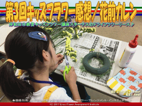 キッズ達の作品は出来上がりました。 8人のうち、先ず4人のキッズの作品を紹介します。 【第3回キッズフラワー(8)/花前カレンFA通信 02】 上の画像は、岸和田市教育委員会生涯学習部生涯学習キッズ・フラワー<第3回: キッズ・フラワー#170701『ドライフラワーのリース』>の作り方の説明を受けているワンショットです。・・・つづく ちなみに、私プロフローリスト、エリ子花前カレンがインストラクターを務めさせて頂いています、岸和田市教育委員会生涯学習部生涯学習課主催のフラワーアレンジメント関連ブログは、以下のようなタイトルがあります。 2 『2016フラワーアレンジ/公民館まつり花前カレン』 2 『2016フラワーアレンジ(2)/公民館まつり花前カレン』 K 『KAFAC植田享子/花前カレン生徒作品集』 K 『KAFAC原光枝/花前カレン生徒作品集』 K 『KAFAC植田美紀/花前カレン生徒作品集』 K 『KAFAC小山淳子/花前カレン生徒作品集』 K 『KAFAC笠井ヒデ子/花前カレン生徒作品集』 K 『KAFAC太田良江/花前カレン生徒作品集』 K 『KAFAC外山真利子/花前カレン生徒作品集』 K 『KAFAC小椋美栄子/花前カレン生徒作品集』 K 『KAFAC上田順子/花前カレン生徒作品集』 K 『KAFAC植田千代子/花前カレン生徒作品集』 K 『KAFAC藤本利子/花前カレン生徒作品集』 あ 『有真香2015Xmasリース/花前カレン』 あ 『有真香会館/花前カレン』 あ 『有真香会館花アレンジ/花前カレン』 あ 『有真香花アレンジクラブ/花前カレン』 お 『お正月初めての雨の祭日/花前カレン』 お 『お正月飾りフラワーアレンジ/花前カレン』 お 『お正月飾りフラワーアレンジ(2)/花前カレン』 お 『お正月飾りフラワーアレンジ(3)/花前カレン』 お 『お正月飾り2017フラワーアレンジ/花前カレン』 か 『葛城地区公民館/花前カレン』 か 『葛城公民館祭2016展示/花前カレン』 か 『葛城公民館祭2016発表/花前カレン』 か 『葛城地区公民館祭2016/花前カレン』 か 『葛城地区公民館まつり/花前カレン』 か 『葛城地区公民館まつり(2)/花前カレン』 か 『葛城地区公民館まつり(3)/花前カレン』 か 『葛城地区公民館まつり(4)/花前カレン』 か 『葛城地区公民館まつり(5)/花前カレン』 か 『葛城地区公民館まつり(6)/花前カレン』 こ 『コスモスアレンジ(4)/花前カレン』 こ 『コスモス・フラワーアレンジ(3)/花前カレン』 さ 『サンタのモスブーツ大芝会館/Xmas花前カレン』 さ 『サンタのモスブーツ/クリスマス花前カレン』 ふ 『フラワーアレンジ・コスモス(2)/花前カレン』 ふ 『フラワーアレンジメント・コスモス/花前カレン』 ふ 『フラワーアレンジメント/花前カレン』 ふ 『フラワーアレンジメント2016/花前カレン』 ふ 『フラワーアレンジ準備編/葛城地区公民館まつり2016』 ふ 『フラワーアレンジ市場編/公民館まつり2016花前カレン』 ふ 『フラワーアレンジ市場(2)/公民館まつり2016花前カレン』 ふ 『フラワーアレンジメント前日/葛城地区公民館まつり2016』 ふ 『フラワーアレンジメント制作/葛城地区公民館まつり2016』 ふ 『フラワーアレンジメント展示/葛城地区公民館まつり2016』 ふ 『フラワーアレンジメント公開/葛城地区公民館まつり2016』 ふ 『プリザーブドフラワーアレンジ/花前カレン』 ふ 『プリザーブドフラワーアレンジ(2)/葛城地区公民館まつり2016』 ふ 『プリザーブドフラワーアレンジ(3)/ワイヤリング花前カレン』 ふ 『プリザーブドフラワーアレンジ(4)/テーピング花前カレン』 あわせてご覧いただければ幸いです。 また、この画像の岸和田市立中央地区公民館で行われているキッズ・フラワー講師である私、エリ子花前カレン関連ブログは、 『プロフローリスト花屋/花前カレン一期一会』 『プロフローリスト花屋(2)/花前カレン』 『プロフローリスト花屋(3)/花前カレン』 『プロフローリスト花屋(4)/花前カレン』 『プロフローリスト花屋(5)/花前カレン』 『プロフローリスト花屋(6)/花前カレン』 『プロフローリスト花屋(7)/花前カレン』 『プロフローリスト花屋(8)/花前カレン』 『プロフローリスト花屋(9)/花前カレン』 『フラワーショップ園部/花前カレン』 『フラワーショップ園部(2)/花前カレン』 『フラワーショップ園部(3)/花前カレン』 『フラワーショップ園部(4)/花前カレン』 『フラワーショップ園部(5)/花前カレン』 『ノマドワーカー(5)/花前カレン』 『ノマドワーカー(4)/花前カレン』 『ノマドワーカー(3)/花前カレン』 『ノマドワーカー(2)/花前カレン』 『ノマドワーカー/花前カレン』 のタイトルがあります。 最近はfacebook デビュー勉強中です。厚かましくて恐れ入りますが、「いいね!」よろしくお願いいたします。 □テキスト編集:Fiori, Erico _ |