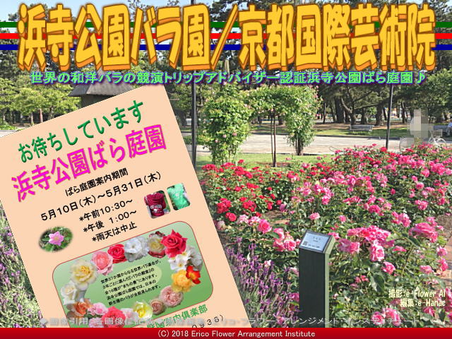 大阪府堺市にある浜寺公園バラ園は、正式には「浜寺公園ばら庭園」といいますが、大阪府直営の総合公園「浜寺公園」の中にあります。 ちなみに、南海電鉄羽衣駅から南北に位置する浜寺公園は、「日本の名松100選」にも選ばれていて、春には桜が咲いて春爛漫、BBQバーベキューもできるお花見スポットとしても人気があります。 そして浜寺公園は日常は、散歩やジョギングや愛犬散歩やデートスポットとしても、近隣の住民に親しまれ、アメニティ度の高い憩いの場です。 また、浜寺公園の5月は、“Rose de Mai ローズ・ド・メ(フランス語/5月のバラ)”の文字通り、日本有数のバラスポットとしても親しまれています。 【浜寺公園バラ園(2)/京都国際芸術院 02】 大阪観光案内公式サイト「大阪観光局 OSAKAINFO」の「浜寺公園ばら庭園」ページを参考にして、以下に浜寺公園バラ園データを作成します。 【浜寺公園バラ園】データ ■正式名称: 浜寺公園ばら庭園 ■読み: ハマデラコウエンバラテイエン ■案内: 南海電鉄「浜寺公園」駅または阪堺電気軌道「浜寺駅前」駅を降りて徒歩すぐ。浜寺公園は明治6年(1873)につくられた大阪最古の府営公園のひとつ。広大な園内には約5000本の松が繁り、日本の名松100選(社団法人・日本の松の緑を守る会選定)に選ばれている。敷地約2.5haのばら庭園は、大阪府の「花ふる大阪事業」として平成5年(1993)に完成したもので、和風の回遊式庭園に見立てた「湖沼・水路の景」「里の景」「山間の景」など5つのゾーンと遊歩道、ヨーロッパの庭園を思わせる「まちの景」などが広がる味わいあるつくり。日本に昔から自生するノイバラやツクシイバラ、ハマナスをはじめ、約300種6,500株のバラが春から初冬まで咲き誇る。例年3月から12月まで開園。入園無料。春、秋の見頃シーズンのみ。ボランティアグループ「バラ庭園案内倶楽部」によるバラのガイドツアーなどもある。 ■所在地: 〒 592-8346 大阪府堺市西区浜寺公園町 ■アクセス: 以下の公共機関 □南海本線「浜寺公園駅」より徒歩3分 □阪堺電軌阪堺線「浜寺駅前」駅すぐ □JR羽衣線「東羽衣」駅から北西へ徒歩450m ■ルートマップ: こちらから ■開園日: 2018年4月25日~6月4日 ※期間中の火曜日は開園。 ■営業時間: 10:00~17:00(入園は16:00まで) □イベント期間によっては夜間入園やコンサートなどが催行されています。2018年は5/12~27日は21時まで営業です。 □休日: 火曜日(祝日の場合は翌日) ■料金: 無料 ■駐車場: 有料。普通車1時間400円、以降1時間毎に100円課金 ■お問い合わせ □施設名: 浜寺公園管理事務所 □電話番号: 0722-61-0936 □FAX: 0722-63-6300 □公式URL: こちらから osaka-park.or.jp/rinkai/hamadera/main.html □マップ: 園内イラストマップはこちらから 以上。 データは2018年5月30日(水)作成したものです。データが古くなっている場合もありますので、お出かけの際はネットや関係機関にお問い合わせ頂ければ幸いです。・・・つづく ちなみに、このブログページは、一般社団法人京都国際芸術院代表理事の一人である私エリ子花前カレンが管理者です。私は、岸和田市教育委員会生涯学習部生涯学習課が毎年開催している生涯学習のフラワーアレンジメント講座の講師の一人でもあります。 私は自分の教室(イー・フラワーアレンジメント教室/英語名:e-Flower Arrangement Institute/略称:e-Flower AI)を運営しながら、25年前から岸和田市立葛城地区公民館有真香会館(『秋の2017文化祭(4)/花前カレン作品』『文化祭2017生け込み/女子会お茶会』『岸和田市2017文化祭(6)/葛城地区公民館まつり』他)では成人の部を、そして2017年から岸和田市(岸和田市教育委員会公式ページはこちら)主催の「キッズフラワー」講座(『第9回キッズフラワー感想(7)/エリ子花前カレン』『第9回キッズフラワー新春(5)/エリ子花前カレン』『ミニXmas会(6)/キッズフラワー花前カレン』他)を担当しています。 私、エリ子花前カレン関連ブログは、フラワーアレンジメントのプロフローリスト&花屋 『プロフローリスト花屋/花前カレン一期一会』 『プロフローリスト花屋(2)/花前カレン』 『プロフローリスト花屋(3)/花前カレン』 『プロフローリスト花屋(4)/花前カレン』 『プロフローリスト花屋(5)/花前カレン』 『プロフローリスト花屋(6)/花前カレン』 『プロフローリスト花屋(7)/花前カレン』 『プロフローリスト花屋(8)/花前カレン』 『プロフローリスト花屋(9)/花前カレン』 の花職人としても毎日一生懸命です。 週に2~3回は大阪鶴見の花卉市場に朝早くから仕入れ 『フラワーアレンジ市場編/公民館まつり2016花前カレン』 『フラワーアレンジ市場(2)/公民館まつり2016花前カレン』 をして、時には、これぞと思う季節の枝もの葉ものを求めてウチの裏山の植木山 『植木山の春木々/花前カレン一期一会』 『植木山の春木(2)/花前カレン一期一会』 『植木山の春木(3)/花前カレン一期一会』 『植木山の春木(4)/花前カレン一期一会』 『植木山の春木(5)/花前カレン一期一会』 『植木山の春木(6)/花前カレン一期一