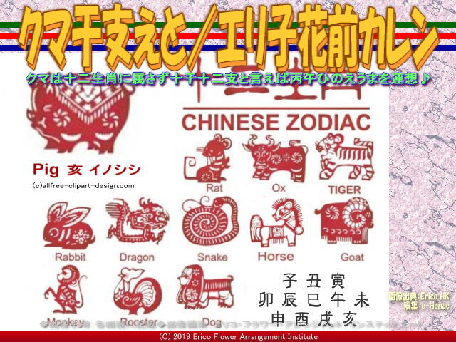 干支(えと/かんし)とは、十干十二支を合わせたものを干支(「かんし」または「えと」)というところまで書いてきました。 ところで、コストコで見つけたあの大きなクマ・熊のぬいぐるみ、テディベア(英:Teddy bear)ですが、クマ・熊は、十二支(じゅうにし/twelve horary signs) ■子「ね」、鼠(ねずみ) Rat ■丑「うし」、牛(うし) Ox ■寅「とら」、虎(とら) Tiger ■卯「う」、兎(うさぎ) Hare ■辰「たつ」、竜・龍(りゅう) Dragon ■巳「み」、蛇(へび) Serpent ■午「うま」、馬(うま) Horse ■未「ひつじ」、羊(ひつじ) Sheep ■申「さる」、猿(さる) Monkey ■酉「とり」、鶏(にわとり) Cock ■戌「いぬ」、犬(いぬ) Dog ■亥「い」、猪(いのしし) Boar には入っていません。 亥「い」、猪(いのしし)は、英語でBoar(ボア)と云います。 クマは、Bear(ベア)。 「o」と「e」の一字違いで大きな差ですね。 「干支 - Wikipedia」(出典: フリー百科事典『ウィキペディア(Wikipedia)』)を参考にしますと、クマ・熊は、日本、中国、台湾、韓国、タイ、ベトナム、モンゴル、インド、アラビア、ロシア、ベラルーシ、アラビア、イランのどの国の十二支(十二動物/十二生肖(じゅうにせいしょう)/十二属相(じゅうにぞくしょう))にも入っていません。※「生肖 - Wikipedia」(出典: フリー百科事典『ウィキペディア(Wikipedia)』)参照 【クマと干支えと(3)/エリ子花前カレン 02】 扨而(さて)、クマ・熊はどうして干支に入っていないのでしょうか? ネットで調べてみると、Yahoo!JAPAN知恵袋で<なぜ十二支には熊や鹿がないのですか。教えてください。>の回答は以下、 <古代中国において、12宮は方角や順番を表すものでしたが、人々が覚えやすいよう身近な動物を使ったからです。その当時は、『辰』は想像上の動物でしたが、それ以外は、日常的に良く見る動物です。辰(龍)は、想像上ではありましたが、心中として中国の人にとっては、身近な動物でした。一方、ご質問にある、熊や鹿は、猛獣であったり、山岳部に主にいたり、やはり当時でも、犬や、猫ほど、よく見たり、近しかったりしない動物で、メディアが発達していない当時においては、珍しい動物であったために、選から漏れたわけです。>と記載されています。 うん、なるほど、そう言えば、タイやベトナムやチベットやベラルーシでは身近な存在として十二支(十二動物/十二生肖(じゅうにせいしょう)/十二属相(じゅうにぞくしょう))にネコ・猫がウサギ・兎(卯「う」)に代って入っていますし、日本の干支のイノシシ・猪(亥「い」)の代わりとして、中国、韓国、タイ、ベトナム、モンゴル、インド、アラビア、ロシア、ベラルーシの十二支(十二動物/十二生肖(じゅうにせいしょう)/十二属相(じゅうにぞくしょう))に家畜のブタ・豚が入っています。 余談ですが、タイとベトナムの干支(十二動物)では、ヒツジ羊(未「ひつじ」)に代わってヤギ・山羊が、インドの干支(十二動物)ではニワトリ・鶏(酉「とり」)に代わってガルダ・ガルーダ(インドの想像上の神鳥)が、モンゴルの干支(十二動物)ではトラ・虎(寅「とら」)に代わってヒョウ・豹が、アラビアの干支(十二動物)ではワニ・鰐が、イランでは辰(たつ、龍)に代わってクジラ・鯨が、ブルガリアではトラ・虎(寅「とら」)がネコ・猫にそれぞれ置き換わって入っています。 上の画像は、海外の干支の十二支(十二動物/十二生肖(じゅうにせいしょう)/十二属相(じゅうにぞくしょう))で、ヒツジ羊(未「ひつじ」)がヤギ・山羊になり、イノシシ・猪(亥「い」)が豚になっているビジュアルです。・・・明日につづく ちなみに、このブログページは、非営利型一般社団法人京都国際芸術院(略称:KIAIGIA/キアイジャ/公式ページ/Facebookページ/公式Twitter/代表のTwitter)花の代表、北洞院流華法道の家元として指揮を執る私エリ子花前カレン(公式ブログ、Profile、facebook、Twitter、公式HP1、公式HP2)が管理者です。 我が非営利型一般社団法人京都国際芸術院は、昨年2018年5月に京都中京の四条に法人設立した組織です。設立当初は、書と花をコアにして、書は、吉祥院心龍北洞院流書法道正師範(公式ブログ、公式Blog2アメブロ、facebook、Instagram、YouTube、公式HP)、そして花は私エリ子花前カレンの二人で、京都と大阪と兵庫で活動しています。 最近の実働としては、我が非営利型一般社団法人京都国際芸術院(略称:KIAIGIA/キアイジャ/公式ページ/Facebookページ/公式Twitter/代表のTwitter)は現時点で、書と花と出版をメインテーマにして、教室運営、出張講座、イベント企画と運営、出版、ウェッブ授業とデジタルコンテンツ作成と提供、書と花の各師範の作品開発・販売などを行っています。 設立の2018年は私は、特に一般社団法人京都国際芸術院の設立(『社団法人化への歩み(6)/京都国際芸術院』など)や奈良ホテルでの記念式典(『奈良ホテル書花展(10)/京都国際芸術院』など)、出版事業部の初仕事(『アートの旅/一般社団法人京都国際芸術院』『アートの旅美術館/エリ子花前カレン』『アートの旅facebook記事/京