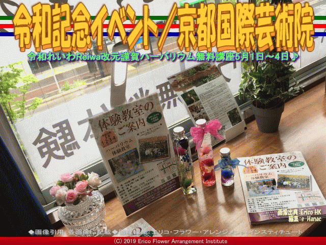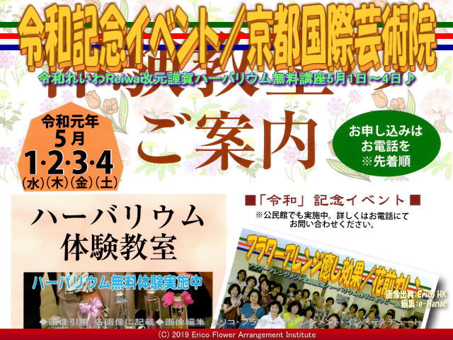 2019年「令和」(れいわ、レイワ、Reiwa)元年5月1日(水)が明けて、今日は令和元年5月2日(木)です。 ここ京都下鴨にある我が非営利型一般社団法人京都国際芸術院(略称:KIAIGIA/キアイジャ/公式ページ/Facebookページ/公式Twitter/代表のTwitter)北大路下鴨ワークショップスタジオは、静かな朝6時半です。 【令和記念イベント(2)/京都国際芸術院 02】 さて、昨日も『令和記念イベント』にお電話でお問い合わせいただき、参加してくださり、ありがとうございます。 好評の『令和記念イベント』、フラワーアレンジメント「ハーバリウム無料体験教室」の詳細は以下です。 2019年「令和」(れいわ、レイワ、Reiwa)元年5月1日(水)から4日間の5月4日(土)2時から5時まで行っております。 以下は、昨日5月1日(水)五大紙(京都新聞、朝日新聞、読売新聞、毎日新聞、産経新聞)の京都下鴨地区に折込み配布された『令和記念イベント』チラシのビジュアルです。 ※ここをクリックで『令和記念イベント』フラワーアレンジメント「ハーバリウム無料体験教室」チラシ全体がご覧いただけます。 ■タイトル: 『令和記念イベント』ハーバリウム無料体験教室 ■場所: 北大路下鴨ワークショップスタジオ 京都市左京区下鴨東本町25 ワールドダックビル305 ■時間: 午後2時~5時(随時) ■個別レッスン: 完成まで約20分~60分(お友達とご一緒にマイペースでお楽しみください♪) ■講習費: 無料 ■材料代: 実費(千円、2千円、3千円各コース) ■講師: 北洞院流家元 エリ子花前カレン ■公式ブログ: http://hanamae.blog.jp/ ■主催者: 一般社団法人京都国際芸術院 ■申込み: 電話受付、先着順 ■電話受付: 075-721-7600、または090-5058-1088 ■講師コメント: ご参加ありがとうございます。ハーバリウムは誰にで簡単に出来ます。自由にお花(各種プリザーブドフラワー)をお好みでお選びいただいて、思うままにガラスの容器の中に生けてください。出来上がれば自らの個性の発露。お店で販売されている商品ではなく、私だけのマイハーバリウム♪身近な芸術の完成です。・・・つづく ハーバリウム体験授業の中で口頭で紹介させて頂きました「アートの旅」は、私たち非営利型一般社団法人京都国際芸術院(法人番号7130005015305/略称:KIAIGIA/キアイジャ/公式ページ/Facebookページ/公式Twitter/代表のTwitter)が企画・出版しています小冊子の名称で、英語名は“THE TRAVEL OF ART”です。 日本の各地の美術館や博物館から掲載ご許可を頂いて展示作品や催事などを紹介するフリーペーパーです。 私エリ子花前カレンが企画に加わって、松本正編集長が編集・出版した昨年からのアートの旅は、「アートの旅2018春号(640x480画像)」「アートの旅2018夏号(表紙2460x3486画像、動画『アートの旅/ページめくり』)」「アートの旅2018秋号」「アートの旅2019冬号」がラインナップされています。 アートの旅は一年で4回の季節毎の出版です。 今年2019年4月1日には『アートの旅2019春号』を発行いたしました。 アートの旅の出版にご協力いただきました皆様にはこのブログページを借りて感謝申し上げます、ありがとうございました。 次刊夏号7月の出版費用捻出のため店償広告ご依頼に参上することもあるかと思います。 その節はご協力、どうか宜しくお願い申し上げます。 このブログページは、非営利型一般社団法人京都国際芸術院(略称:KIAIGIA/キアイジャ/公式ページ/Facebookページ/公式Twitter/代表のTwitter)花の代表、北洞院流華法道の家元として指揮を執る私エリ子花前カレン(公式ブログ、Profile、facebook、Twitter、公式HP1、公式HP2)が管理者です。 我が非営利型一般社団法人京都国際芸術院は、昨年2018年5月に京都中京の四条に法人設立した組織です。設立当初は、書と花をコアにして、書は、吉祥院心龍北洞院流書法道正師範(公式ブログ、公式Blog2アメブロ、facebook、Instagram、YouTube、公式HP)、そして花は私エリ子花前カレンの二人で、京都と大阪と兵庫で活動しています。 最近の実働としては、我が非営利型一般社団法人京都国際芸術院(略称:KIAIGIA/キアイジャ/公式ページ/Facebookページ/公式Twitter/代表のTwitter)は現時点で、書と花と出版をメインテーマにして、教室運営、出張講座、イベント企画と運営、出版、ウェッブ授業とデジタルコンテンツ作成と提供、書と花の各師範の作品開発・販売などを行っています。 設立の2018年は私は、特に一般社団法人京都国際芸術院の設立(『社団法人化への歩み(6)/京都国際芸術院』など)や奈良ホテルでの記念式典(『奈良ホテル書花展(10)/京都国際芸術院』など)、出版事業部の初仕事(『アートの旅/一般社団法人京都国際芸術院』『アートの旅美術館/エリ子花前カレン』『アートの旅facebook記事/京都国際芸術院』『アートの旅松本編集長/京都国際芸術院』など)、産直市場よってって新規開店(『よってって和泉中央(4)/エリ子花前カレン』など)でのプロパー作品展示販売、そして公式ページの立上げやFcebookページやTwitterの開設、そして個人的には動画編集ビデオ制作の学習(『ビデオ制作勉