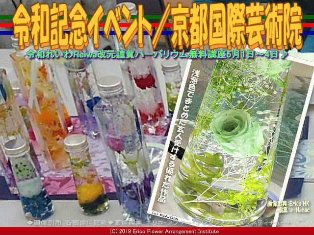 我が非営利型一般社団法人京都国際芸術院(略称:KIAIGIA/キアイジャ/公式ページ/Facebookページ/公式Twitter/代表のTwitter)北大路下鴨ワークショップスタジオは、『令和記念イベント』として、ハーバリウム無料教室・無料講座を行っています。 以下は、一昨日5月1日(水)五大紙(京都新聞、朝日新聞、読売新聞、毎日新聞、産経新聞)朝刊の京都下鴨地区全域に折込み配布された『令和記念イベント』チラシのビジュアルは、ここをクリックで『令和記念イベント』フラワーアレンジメント「ハーバリウム無料体験教室」チラシ全体がご覧いただけます。 2019年5月1日、平成ではなく、新元号「令和」(れいわ、レイワ、Reiwa)元年5月1日(水)から5月4日(土)4日間の2時から5時まで『令和記念イベント』として行っています。 お申込みいただいた参加者様の画像掲載のご許可を頂いていませんので、北大路下鴨ワークショップスタジオの私のサイドデスクの画像を紹介させていただいています。 【令和記念イベント(3)/京都国際芸術院 02】 今回の『令和記念イベント』の教材としての「ハーバリウム」については、北洞院流華法道家元エリ子花前カレン(公式ブログ、Profile、facebook、Twitter、公式HP1、公式HP2)は、多くのレッスンを行って来ています。 まずは『ハーバリウム作り@5じやん!/テレビ岸和田EX版/京都国際芸術院』をご覧くださいませ。 【ハーバリウム作り@5じやん!/テレビ岸和田EX版/京都国際芸術院】 ■URL: 以下です。 ※クリックでYouTube動画が観れます。 □https://youtu.be/IBMht5basnQ □https://youtu.be/Oe2BKEqevao ■ジャンル: YouTubeビデオ ■形式: MP4 ■長さ: 00:13:31 ■サイズ: 789MB ■フレーム: 1280x720pxls ■公開: 2019/04/18 ■発信元: 非営利型一般社団法人 京都国際芸術院 TVKテレビ岸和田で北洞院流ハーバリウムが紹介された生番組「5じやん!ハーバリウム」については以下のブログ 『5じやん!ハーバリウム/北垣有唯』 『5じやん!ハーバリウム/加納永美子』 『5じやん!ハーバリウム/川崎亜沙美』 『5じやん!ハーバリウム/真輝志@きんめ鯛』 『5じやん!ハーバリウム/記念撮影』 『5じやん!ハーバリウム/北洞院流工房』 『5じやん!ハーバリウム/北洞院流家元』 『5じやん!ハーバリウム/北洞院流白原』 『5じやん!ハーバリウム/北洞院流』 『5じやん!(5)/TVKテレビ岸和田』 『5じやん!(4)/TVKテレビ岸和田』 『5じやん!(3)/TVKテレビ岸和田』 『5じやん!(2)/TVKテレビ岸和田』 『5じやん!/TVKテレビ岸和田』 を作成してアップしてあります。 また、ハーバリウム体験や講座・レッスン関連ですこし例に挙げると、今までに 『ハーバリウム製作体験(3)/有真香会館』 『ハーバリウム製作体験(2)/有真香会館』 『ハーバリウム製作体験/有真香会館』 『岸和田教育委員会FA講座(5)/エリ子花前カレン』 『岸和田教育委員会FA講座(4)/エリ子花前カレン』 『岸和田教育委員会FA講座(3)/エリ子花前カレン』 『岸和田教育委員会FA講座(2)/エリ子花前カレン』 『岸和田教育委員会FA講座/エリ子花前カレン』 などのブログを作成して紹介してあります。 最近行った少人数でのフラワーアレンジメントにおけるハーバリウムセラピーについては以下のブログ 『煉瓦館ハーバリウム(5)/北洞院流』 『煉瓦館ハーバリウム(4)/北洞院流』 『煉瓦館ハーバリウム(3)/北洞院流』 『煉瓦館ハーバリウム(2)/北洞院流』 『煉瓦館ハーバリウム/北洞院流』 をアップしてあります。 あわせてご覧頂ければ幸いです。・・・つづく ハーバリウム体験授業の中で口頭で紹介させて頂きました「アートの旅」は、私たち非営利型一般社団法人京都国際芸術院(法人番号7130005015305/略称:KIAIGIA/キアイジャ/公式ページ/Facebookページ/公式Twitter/代表のTwitter)が企画・出版しています小冊子の名称で、英語名は“THE TRAVEL OF ART”です。 日本の各地の美術館や博物館から掲載ご許可を頂いて展示作品や催事などを紹介するフリーペーパーです。 私エリ子花前カレンが企画に加わって、松本正編集長が編集・出版した昨年からのアートの旅は、「アートの旅2018春号(640x480画像)」「アートの旅2018夏号(表紙2460x3486画像、動画『アートの旅/ページめくり』)」「アートの旅2018秋号」「アートの旅2019冬号」がラインナップされています。 アートの旅は一年で4回の季節毎の出版です。 今年2019年4月1日には『アートの旅2019春号』を発行いたしました。 アートの旅の出版にご協力いただきました皆様にはこのブログページを借りて感謝申し上げます、ありがとうございました。 次刊夏号7月の出版費用捻出のため店償広告ご依頼に参上することもあるかと思います。 その節はご協力、どうか宜しくお願い申し上げます。 このブログページは、非営利型一般社団法人京都国際芸術院(略称:KIAIGIA/キアイジャ/公式ページ/Facebookページ/公式Twitter/代表のTwitter)花の代表、北洞院流華法道の家元として指揮を執る私エリ子花前カレン(公式ブログ、Profile、facebook、Twitter、公式HP1、公式HP2)が管理者です。 我が非営利型一般社団法人京都国際芸術院は、昨年2018年