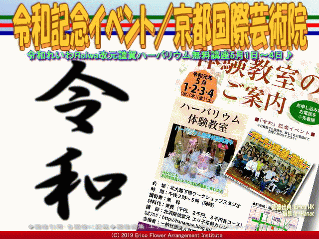 新元号「令和」(れいわ、レイワ、Reiwa)、おめでとうございます。 2019年「令和」(れいわ、レイワ、Reiwa)元年5月1日午前0時、新しい天皇陛下第126代目がご即位されました。 平成に感謝し、そして新元号「令和」(れいわ、レイワ、Reiwa)の改元を謹しんで賀し、今正に新元号「令和」(れいわ、レイワ、Reiwa)の始まりを体験できることをとても嬉しく幸せに感じます。 我が非営利型一般社団法人京都国際芸術院(略称:KIAIGIA/キアイジャ/公式ページ/Facebookページ/公式Twitter/代表のTwitter)の書の代表吉祥院心龍北洞院流書法道正師範(公式ブログ、公式Blog2アメブロ、facebook、Instagram、YouTube、公式HP)の相棒で花の代表エリ子花前カレン(公式ブログ、Profile、facebook、Twitter、公式HP1、公式HP2)北洞院流華法道家元が畏れ多くも大胆に、新元号の予想を以下のように 『新元号予想(3)仁永/北洞院エリ子花前カレン』 『新元号予想(2)/北洞院エリ子花前カレン』 『新元号予想/北洞院エリ子花前カレン』 行いましたが、今回の「令和」(れいわ、レイワ、Reiwa)は全く想像すら及ばない高貴な元号です。 あらためて「令和おめでとうございます♪」 【令和記念イベント/京都国際芸術院 02】 さて、新元号「令和」(れいわ、レイワ、Reiwa)記念として、我が非営利型一般社団法人京都国際芸術院(略称:KIAIGIA/キアイジャ/公式ページ/Facebookページ/公式Twitter/代表のTwitter)は、2019年「令和」(れいわ、レイワ、Reiwa)元年5月1日(水)から4日間の5月4日(土)2時から5時まで、『令和記念イベント』として、フラワーアレンジメント「ハーバリウム無料体験教室」を開催します。 上の画像は、京都下鴨地区に5月1日(水)に配布された五大紙(京都新聞、朝日新聞、読売新聞、毎日新聞、産経新聞)の折込みチラシのビジュアルです。 ここをクリックで『令和記念イベント』フラワーアレンジメント「ハーバリウム無料体験教室」チラシ全体がご覧いただけます。・・・つづく 前回のハーバリウム体験授業の中で口頭で紹介させて頂きました「アートの旅」は、私たち非営利型一般社団法人京都国際芸術院(法人番号7130005015305/略称:KIAIGIA/キアイジャ/公式ページ/Facebookページ/公式Twitter/代表のTwitter)が企画・出版しています小冊子の名称で、英語名は“THE TRAVEL OF ART”です。 日本の各地の美術館や博物館から掲載ご許可を頂いて展示作品や催事などを紹介するフリーペーパーです。 私エリ子花前カレンが企画に加わって、松本正編集長が編集・出版した昨年からのアートの旅は、「アートの旅2018春号(640x480画像)」「アートの旅2018夏号(表紙2460x3486画像、動画『アートの旅/ページめくり』)」「アートの旅2018秋号」「アートの旅2019冬号」がラインナップされています。 アートの旅は一年で4回の季節毎の出版です。 今年2019年4月1日には『アートの旅2019春号』を発行いたしました。 アートの旅の出版にご協力いただきました皆様にはこのブログページを借りて感謝申し上げます、ありがとうございました。 次刊夏号7月の出版費用捻出のため店償広告ご依頼に参上することもあるかと思います。 その節はご協力、どうか宜しくお願い申し上げます。 このブログページは、非営利型一般社団法人京都国際芸術院(略称:KIAIGIA/キアイジャ/公式ページ/Facebookページ/公式Twitter/代表のTwitter)花の代表、北洞院流華法道の家元として指揮を執る私エリ子花前カレン(公式ブログ、Profile、facebook、Twitter、公式HP1、公式HP2)が管理者です。 我が非営利型一般社団法人京都国際芸術院は、昨年2018年5月に京都中京の四条に法人設立した組織です。設立当初は、書と花をコアにして、書は、吉祥院心龍北洞院流書法道正師範(公式ブログ、公式Blog2アメブロ、facebook、Instagram、YouTube、公式HP)、そして花は私エリ子花前カレンの二人で、京都と大阪と兵庫で活動しています。 最近の実働としては、我が非営利型一般社団法人京都国際芸術院(略称:KIAIGIA/キアイジャ/公式ページ/Facebookページ/公式Twitter/代表のTwitter)は現時点で、書と花と出版をメインテーマにして、教室運営、出張講座、イベント企画と運営、出版、ウェッブ授業とデジタルコンテンツ作成と提供、書と花の各師範の作品開発・販売などを行っています。 設立の2018年は私は、特に一般社団法人京都国際芸術院の設立(『社団法人化への歩み(6)/京都国際芸術院』など)や奈良ホテルでの記念式典(『奈良ホテル書花展(10)/京都国際芸術院』など)、出版事業部の初仕事(『アートの旅/一般社団法人京都国際芸術院』『アートの旅美術館/エリ子花前カレン』『アートの旅facebook記事/京都国際芸術院』『アートの旅松本編集長/京都国際芸術院』など)、産直市場よってって新規開店(『よってって和泉中央(4)/エリ子花前カレン』など)でのプロパー作品展示販売、そして公式ページの立上げやFcebookページやTwitterの開設、そして個人的には動画編集ビデオ制作の学習(『ビデオ制作勉強会(9)/エリ子花前カレン』など)等、ネット関連の仕事も増えて、有難くもどんどん忙しくなって