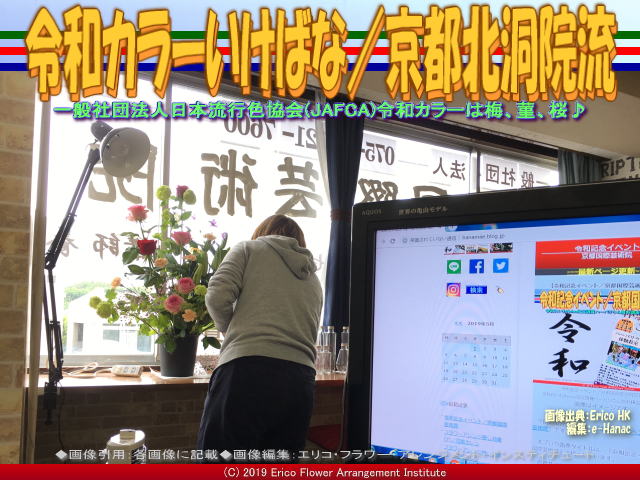 2019年「令和」(れいわ、レイワ、Reiwa)元年5月1日午前0時、新天皇陛下第126代目(徳仁/なるひとさま、称号は浩宮さま。59歳、新皇后雅子さまは55歳)がご即位されましたと同時に、ここ我が非営利型一般社団法人京都国際芸術院(略称:KIAIGIA/キアイジャ/公式ページ/Facebookページ/公式Twitter/代表のTwitter)北大路下鴨ワークショップスタジオで慶春のいけばなとして、令和カラーを使って、「令和」の「令」を形取ってお花をフラワーアレンジメント京都北洞院流「令和カラーいけばな」で生けました。 タイトル画像は、身近な美の探究、エリ子花前カレンのフラワーアレンジメント京都北洞院流「令和カラーいけばな」のビジュアルです。 【令和カラーいけばな(2)/京都北洞院流 02】 私、北洞院流華法道家元エリ子花前カレン(公式ブログ、Profile、facebook、Twitter、公式HP1、公式HP2)が企画催行させていただいた『令和記念イベント』ハーバリウム無料教室・無料講座の開始日に、慶祝の意をこめてお花を令和カラーをイメージして生けさせていただき、ハーバリウムを数個作らせていただきました。 そして、ハーバリウムは、最初に訪問されたお客様にプレゼントさせて頂きました。 タイトルは、「令和カラーいけばな」「令和カラーフラワーアレンジメント」です。 上の画像は、慶祝令和をイメージして生け込んでいるビジュアルです。・・・つづく 今回の『令和記念イベント』の教材としての「ハーバリウム」については、北洞院流華法道家元エリ子花前カレン(公式ブログ、Profile、facebook、Twitter、公式HP1、公式HP2)は、多くのレッスンを行って来ています。 まずは『ハーバリウム作り@5じやん!/テレビ岸和田EX版/京都国際芸術院』をご覧くださいませ。 【ハーバリウム作り@5じやん!/テレビ岸和田EX版/京都国際芸術院】 ■URL: 以下です。 ※クリックでYouTube動画が観れます。 □https://youtu.be/IBMht5basnQ □https://youtu.be/Oe2BKEqevao ■ジャンル: YouTubeビデオ ■形式: MP4 ■長さ: 00:13:31 ■サイズ: 789MB ■フレーム: 1280x720pxls ■公開: 2019/04/18 ■発信元: 非営利型一般社団法人 京都国際芸術院 TVKテレビ岸和田で北洞院流ハーバリウムが紹介された生番組「5じやん!ハーバリウム」については以下のブログ 『5じやん!ハーバリウム/北垣有唯』 『5じやん!ハーバリウム/加納永美子』 『5じやん!ハーバリウム/川崎亜沙美』 『5じやん!ハーバリウム/真輝志@きんめ鯛』 『5じやん!ハーバリウム/記念撮影』 『5じやん!ハーバリウム/北洞院流工房』 『5じやん!ハーバリウム/北洞院流家元』 『5じやん!ハーバリウム/北洞院流白原』 『5じやん!ハーバリウム/北洞院流』 『5じやん!(5)/TVKテレビ岸和田』 『5じやん!(4)/TVKテレビ岸和田』 『5じやん!(3)/TVKテレビ岸和田』 『5じやん!(2)/TVKテレビ岸和田』 『5じやん!/TVKテレビ岸和田』 を作成してアップしてあります。 また、ハーバリウム体験や講座・レッスン関連ですこし例に挙げると、今までに 『ハーバリウム製作体験(3)/有真香会館』 『ハーバリウム製作体験(2)/有真香会館』 『ハーバリウム製作体験/有真香会館』 『岸和田教育委員会FA講座(5)/エリ子花前カレン』 『岸和田教育委員会FA講座(4)/エリ子花前カレン』 『岸和田教育委員会FA講座(3)/エリ子花前カレン』 『岸和田教育委員会FA講座(2)/エリ子花前カレン』 『岸和田教育委員会FA講座/エリ子花前カレン』 などのブログを作成して紹介してあります。 最近行った少人数でのフラワーアレンジメントにおけるハーバリウムセラピーについては以下のブログ 『煉瓦館ハーバリウム(5)/北洞院流』 『煉瓦館ハーバリウム(4)/北洞院流』 『煉瓦館ハーバリウム(3)/北洞院流』 『煉瓦館ハーバリウム(2)/北洞院流』 『煉瓦館ハーバリウム/北洞院流』 をアップしてあります。 ハーバリウム体験授業の中で口頭で紹介させて頂きました「アートの旅」は、私たち非営利型一般社団法人京都国際芸術院(法人番号7130005015305/略称:KIAIGIA/キアイジャ/公式ページ/Facebookページ/公式Twitter/代表のTwitter)が企画・出版しています小冊子の名称で、英語名は“THE TRAVEL OF ART”です。 日本の各地の美術館や博物館から掲載ご許可を頂いて展示作品や催事などを紹介するフリーペーパーです。 私エリ子花前カレンが企画に加わって、松本正編集長が編集・出版した昨年からのアートの旅は、「アートの旅2018春号(640x480画像)」「アートの旅2018夏号(表紙2460x3486画像、動画『アートの旅/ページめくり』)」「アートの旅2018秋号」「アートの旅2019冬号」がラインナップされています。 アートの旅は一年で4回の季節毎の出版です。 今年2019年4月1日には『アートの旅2019春号』を発行いたしました。 アートの旅の出版にご協力いただきました皆様にはこのブログページを借りて感謝申し上げます、ありがとうございました。 次刊夏号7月の出版費用捻出のため店償広告ご依頼に参上することもあるかと思います。 その節はご協力、どうか宜しくお願い申し上げます。 このブログページは、非営利型一般社団法人京都国