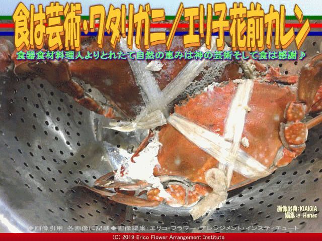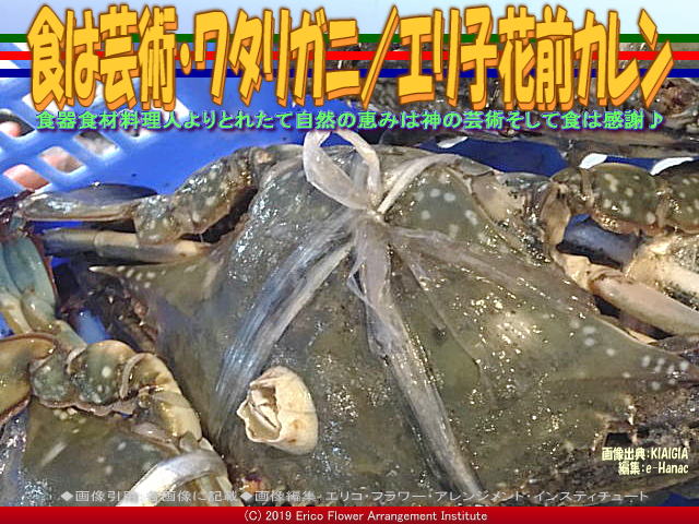 私ん家(わたしんち)の食卓に並ぶご飯やおかずは殆どが住まいの近くにある田んぼや畑や山や海からの恵みもの、とれたて、自然の恵みです。 野菜はとれたて(採れ立て)、魚はとれたて(獲れ立て)です。 私は新鮮とれたての食材を頂いています。 あ、お肉はスーパーで買いますが。 そんな新鮮とれたての食材にまずは感謝です。 「食は感謝」です。 【食は芸術・ワタリガニ(2)/エリ子花前カレン 02】 お米や野菜や魚や、口にするすべては、自然からの恵み物(自然の恵み)です。 特に私の回りで、お米や野菜や魚に関わっている人たちは、父の商売仲間だったり、母の古くからの友達や知り合いだったり、私の身内だったり、同級生だったり、私の生徒のお家だったり、弟子のご家族だったり、幼い時から可愛がってくれているご家庭だったり、市場仲間だったりします。 私エリ子花前カレン(公式ブログ、Profile、facebook、Twitter、公式HP1、公式HP2)がシフトを組んで定期的に働く浜の市場・大阪府泉佐野漁業協同組合直結の青空市場(略称:泉佐野漁協青空市場)では、「エリちゃん、これ食べるかぁ~!」と言ってとれたての食材を頂くこともあって、本当に身近な恵み物だったりします。 今回は、頂き物恵み物自然の恵みはとれたてのワタリガニ。 上の画像は漁で獲れたとれたてのワタリガニの生きているワンショットビジュアルです。 先日2019年6月18日(火)はお天気も良く快調に店番(みせばん)をしていた時に頂いたとれたてワタリガニです。 紐で縛ってあるのは、暴れるとれたてワタリガニのハサミは危険なので、足や手が自由に動かないようにしています。 あ、暴れるとれたてワタリガニさんには申し訳ないけど、ワタリガニさんの元気と命を有難く頂戴して、合掌して頂かなければなりません。 あるセッションで聞いたお話ですが、「私たちの幸せは他者の犠牲の下にある」ことを痛感します。 絶対にとれたてワタリガニさんに感謝を忘れてはいけません。 新鮮とれたての食材にまずは感謝、食卓では合掌して感謝とともに頂きます。 「食は感謝」です。・・・つづく このブログページは、我が非営利型一般社団法人京都国際芸術院(法人番号7130005015305/略称:KIAIGIA/キアイジャ/公式ページ/Facebookページ/公式Twitter/代表のTwitter)花の代表、北洞院流華法道の家元として指揮を執る私エリ子花前カレン(公式ブログ、Profile、facebook、Twitter、公式HP1、公式HP2)が管理者です。 我が非営利型一般社団法人京都国際芸術院は、昨年2018年5月に京都中京の四条に法人設立した組織です。設立当初は、書と花をコアにして、書は、吉祥院心龍北洞院流書法道正師範(公式ブログ、公式Blog2アメブロ、facebook、Instagram、YouTube、公式HP)、そして花は私エリ子花前カレンの二人で、京都と大阪と兵庫で活動しています。 設立の2018年は私は、特に一般社団法人京都国際芸術院の設立(『社団法人化への歩み(6)/京都国際芸術院』など)や奈良ホテルでの記念式典(『奈良ホテル書花展(10)/京都国際芸術院』など)、出版事業部の初仕事(『アートの旅/一般社団法人京都国際芸術院』『アートの旅美術館/エリ子花前カレン』『アートの旅facebook記事/京都国際芸術院』『アートの旅松本編集長/京都国際芸術院』など)、産直市場よってって新規開店(『よってって和泉中央(4)/エリ子花前カレン』など)でのプロパー作品展示販売、そして公式ページの立上げやFcebookページやTwitterの開設、そして個人的には動画編集ビデオ制作の学習(『ビデオ制作勉強会(9)/エリ子花前カレン』など)等、ネット関連の仕事も増えて、有難くもどんどん忙しくなってきました。 また、2019年4月には京都下鴨北大路通りに北大路WS2(ワークショップ・スタジオ)を開設しました。※改装準備中の画像(※引用『北洞院流スタジオ改造(8)/京都国際芸術院』など)はこちら。 最近の我が非営利型一般社団法人京都国際芸術院の実働としては、書と花と出版をメインテーマにして、教室運営、出張講座、イベント企画と運営、出版、ウェッブ授業とデジタルコンテンツ作成と提供、京都四条北洞院流書法道と華法道認定の各師範の作品開発・頒布販売(<令和時代><作品価格@令和時代>)などを行っています。 とりわけ人気のハーバリウム体験や講座・レッスン関連ですこし例に挙げると、今までに 『ハーバリウム製作体験(3)/有真香会館』 『岸和田教育委員会FA講座(5)/エリ子花前カレン』『煉瓦館ハーバリウム(5)/北洞院流』を行い、一部ブログを作成して紹介してあります。 ハーバリウム体験授業の中で必ず口頭で紹介させて頂きます「アートの旅」は、私たち非営利型一般社団法人京都国際芸術院が企画・出版しています小冊子の名称で、英語名は“THE TRAVEL OF ART”です。 「アートの旅」は、日本の各地の美術館や博物館から掲載ご許可を頂いて展示作品や催事などを紹介するフリーペーパーです。 私エリ子花前カレンが企画に加わって、松本正編集長が編集・出版した昨年からのアートの旅は、「アートの旅2018春
