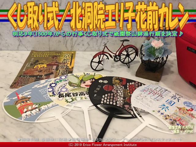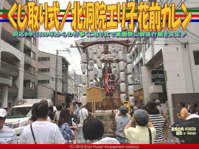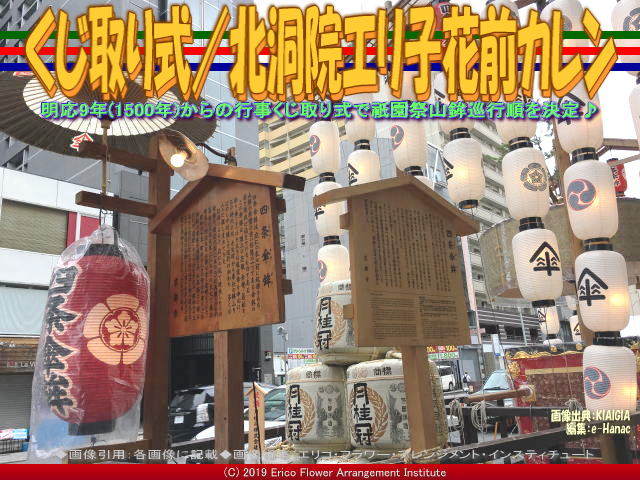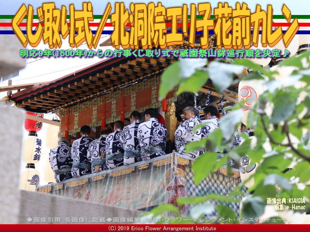 京都祇園祭は、マスコミなどでは祇園祭ニュースというと、山鉾巡行がトピックスで取り上げられてきたために一般的には山鉾町が主催する行事が「祇園祭」と思われています。 実際のところ、京都祇園祭には多くの祭事や行事があります。 その中で、今回紹介しています「くじ取り式」は、祇園祭の山鉾巡行の順番争いを避けるために、籤(くじ)により、山鉾巡行の順番を決める民主的な行事です。 「くじ取り式」は現在は7月2日に行われています。 【くじ取り式(3)/北洞院エリ子花前カレン 02】 <「祇園祭」出典: フリー百科事典『ウィキペディア(Wikipedia)』>ページの「くじ取り式」欄を引用しますと、 <くじ取り式 山鉾のその年の巡行順をくじ引きによって決める儀式。応仁の乱後33年間中断していた祇園祭を復興する際に、激化した順番争いを収めるために室町時代の1500年(明応9年)、当時の侍所の役人(開闔)であった松田豊前守頼亮私宅でくじ取りを行ったと伝えられており、現在もこの神事は、当代の京都市長が裃姿の松田頼亮役として参加するものとして続いている。その後、長らく六角堂で開催されてきたが、1953年から京都市役所の市会議場で開かれるようになり現在に至る。現在は7月2日に行われている。まず前祭のくじ取りを行い、引き続いて後祭のくじ取りを行う。一般の傍聴席での見学は往復はがきで申し込み当選した人に限られている。山鉾町の人々はこのあとすぐに八坂神社に社参し、巡行順が決定したことを奉告する。> と記述されています。 ちなみに、2019年令和元年7月2日に決められた祇園祭2019の前祭と後祭の巡行順序は以下です。 【祇園祭前祭(さきのまつり)山鉾巡行順】 長刀鉾(なぎなたほこ)、蟷螂山(とうろうやま)、芦刈山(あしかりやま)、木賊山(とくさやま)、函谷鉾(かんこほこ)、郭巨山(かっきょやま)、綾傘鉾(あやがさほこ)、伯牙山(はくがやま)、菊水鉾(きくすいほこ)、油天神山(あぶらてんじんやま)、太子山(たいしやま)、保昌山(ほうしょうやま)、鶏鉾(にわとりほこ)、白楽天山(はくらくてんやま)、四条傘鉾(しじょうかさほこ)、孟宗山(もうそうやま)、月鉾(つきほこ)、山伏山(やまぶしやま)、占出山(うらでやま)、霰天神山(あられてんじんやま)、放下鉾(ほうかほこ)、岩戸山(いわとやま)、船鉾(ふねほこ)の23基です。 【祇園祭後祭(あとのまつり)山鉾巡行順】 橋弁慶山(はしべんけいやま)、北観音山(きたかんのんやま)、鯉山(こいやま)、八幡山(はちまんやま)、黒主山(くろぬしやま)、南観音山(みなみかんのんやま)、役行者山(えんのぎょうじゃやま)、浄妙山(じょうみょうやま)、鈴鹿山(すずかやま)、鷹山「唐櫃(からびつ)巡行、大船鉾(おおふねほこ)の11基です。 以上は、空が青く各山鉾が綺麗に撮影されていますのでリンクさせていただきました。 <http://kyoto-k.sakura.ne.jp>さま、ありがとうございます。・・・つづく このブログページは、我が非営利型一般社団法人京都国際芸術院(法人番号7130005015305/略称:KIAIGIA/キアイジャ/公式ページ/Facebookページ/公式Twitter/代表のTwitter)花の代表、北洞院流華法道の家元として指揮を執る私エリ子花前カレン(公式ブログ、Profile、facebook、Twitter、公式HP1、公式HP2)が管理者です。 我が非営利型一般社団法人京都国際芸術院は、昨年2018年5月に京都中京の四条に法人設立した組織です。設立当初は、書と花をコアにして、書は、吉祥院心龍北洞院流書法道正師範(公式ブログ、公式Blog2アメブロ、facebook、Instagram、YouTube、公式HP)、そして花は私エリ子花前カレンの二人で、京都と大阪と兵庫で活動しています。 設立の2018年は私は、特に一般社団法人京都国際芸術院の設立(『社団法人化への歩み(6)/京都国際芸術院』など)や奈良ホテルでの記念式典(『奈良ホテル書花展(10)/京都国際芸術院』など)、出版事業部の初仕事(『アートの旅/一般社団法人京都国際芸術院』『アートの旅美術館/エリ子花前カレン』『アートの旅facebook記事/京都国際芸術院』『アートの旅松本編集長/京都国際芸術院』など)、産直市場よってって新規開店(『よってって和泉中央(4)/エリ子花前カレン』など)でのプロパー作品展示販売、そして公式ページの立上げやFcebookページやTwitterの開設、そして個人的には動画編集ビデオ制作の学習(『ビデオ制作勉強会(9)/エリ子花前カレン』など)等、ネット関連の仕事も増えて、有難くもどんどん忙しくなってきました。 また、2019年4月には京都下鴨北大路通りに北大路WS2(ワークショップ・スタジオ)を開設しました。※改装準備中の画像(※引用『北洞院流スタジオ改造(8)/京都国際芸術院』など)はこちら。 最近の我が非営利型一般社団法人京都国際芸術院の実働としては、書と花と出版をメインテーマにして、教室運営、出張講座、イベント企画と運営、出版、ウェッブ授業とデジタルコンテンツ作成と提供、京都四条北洞院流書法道と華法道認定の各師範の作品開発・頒布販売(<令和時代><作品価格@令和時代>)などを行っています。 とりわけ人気のハー