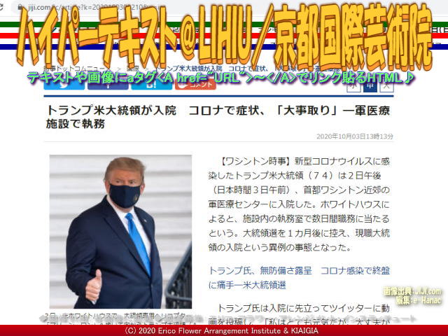 先日(2020年10月03日(木)13:13に出された時事通信提供のニュース<トランプ米大統領が入院=コロナで症状、「大事取り」―軍医療施設で執務>は衝撃的でした。