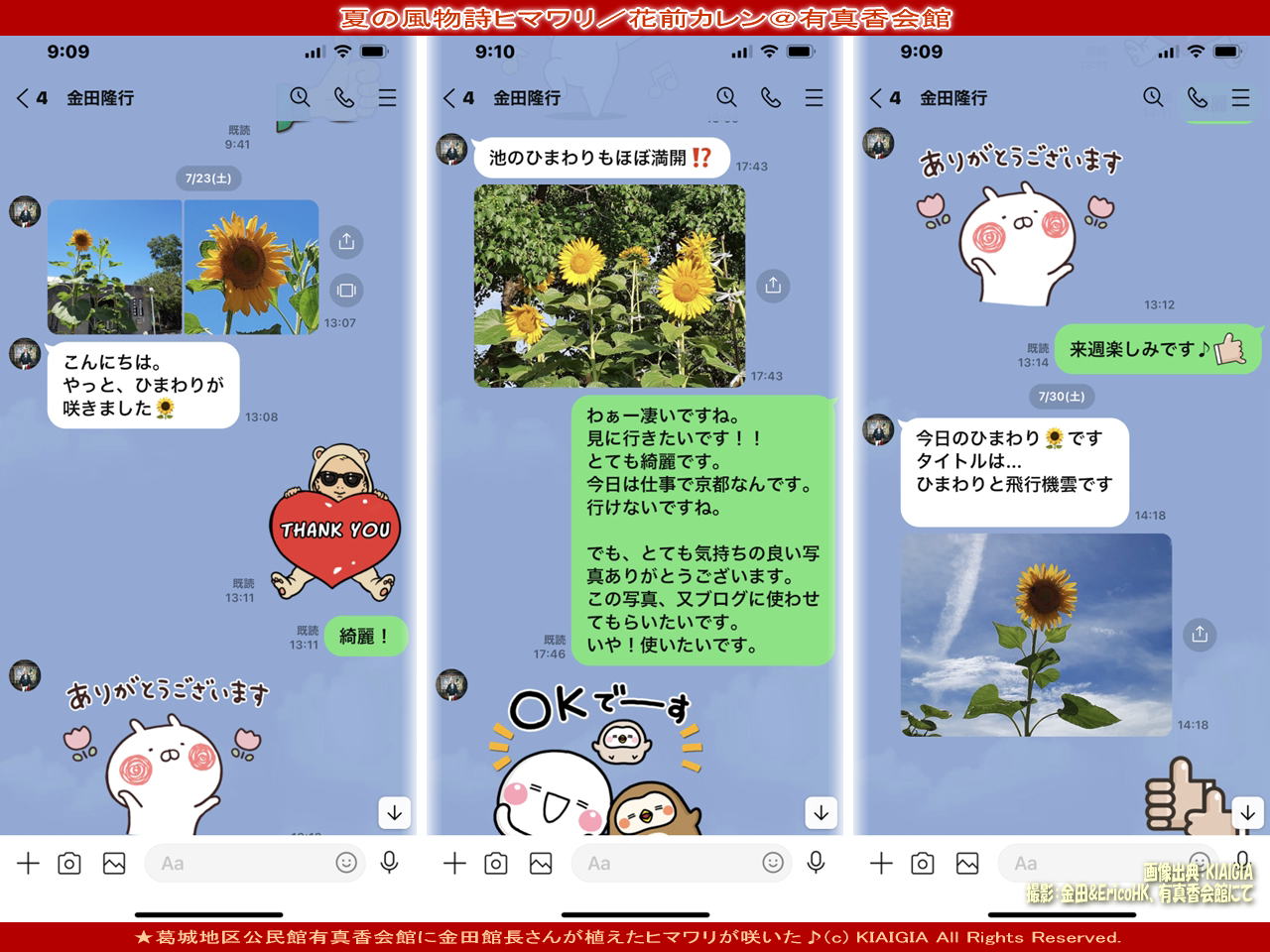 さて、今日は、本ブログテーマ「夏の風物詩ヒマワリ」、先月の7月から8月の最近まで、ヒマワリの件で交信していたラインの画像をアップします。