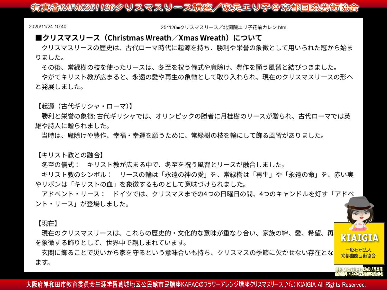 トップのタイトル画像の上部は講座データで、2026年1月14日(水)の大阪府岸和田市教育委員会生涯学習市民講座フラワーアレンジクラブ講座KAFACで「260114有真香KAFACオーバルアレンジ縦型」フラワーアレンジメントレッスンでの生徒に配布するレジュメ(教本)2ページの最初のページの元資料の一部のワンショットビジュアルです。