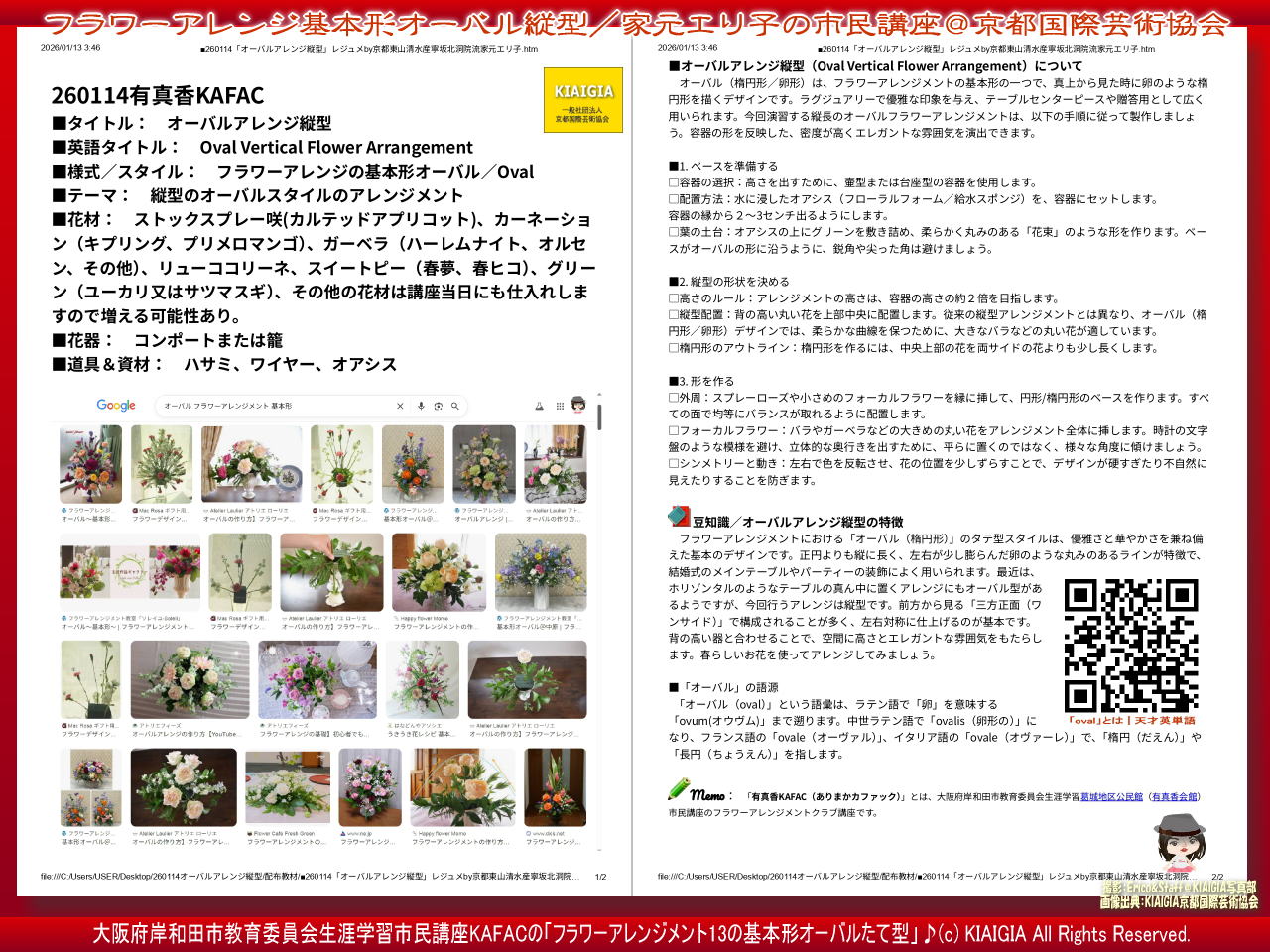 さて、トップのタイトル画像の上部は講座データで、2026年1月14日(水)開催の大阪府岸和田市教育委員会生涯学習市民講座フラワーアレンジクラブ講座KAFACで「260114有真香KAFACオーバルアレンジ縦型」フラワーアレンジメントレッスンでの生徒への配布用レジュメ(教本)A4縦2枚を一枚に編集した画像のワンショットビジュアルです。