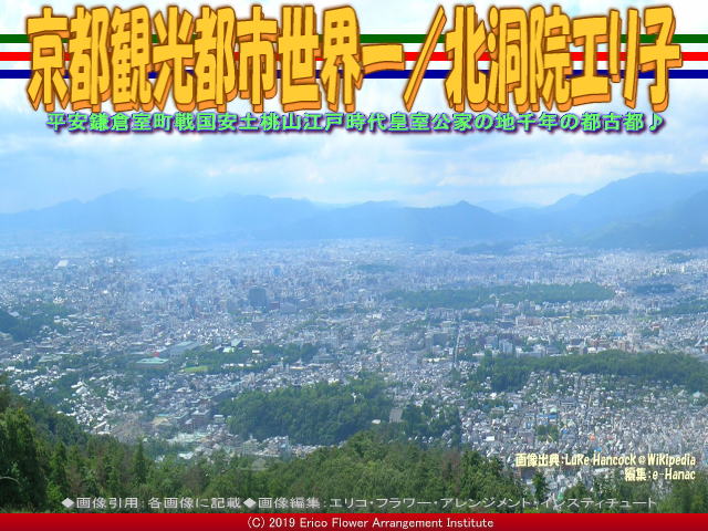 また、<「京都市」出典: フリー百科事典『ウィキペディア(Wikipedia)』>の公式ページの「京都市概要」の項目には、 <市域は令制国でいうと山城国葛野郡・愛宕郡・紀伊郡の全域、山城国宇治郡・乙訓郡と丹波国桑田郡の一部、さらに山城国久世郡・綴喜郡にもくい込んでいる。 京都府最大の都市であり、府の人口の56.7%を占める(2019年6月1日)。都道府県全体の人口の過半数を占める都市は、東京23区を一つの都市として考えない場合は京都市のみである。都市圏としては、京都府・滋賀県などに広がる京都都市圏[1]および京滋の中核であるとともに、京阪神(近畿大都市圏)の一角を担う。都市雇用圏の基準では、都市圏の人口は280万人で京都府より多く、東京都市圏、大阪都市圏、名古屋都市圏に次ぐ日本第4位の規模である。> と述べられています。 トップのタイトル画像と下の画像は、「京都盆地の北部、大文字山より市街地を望む by Luke Hancock@Wikipedia」です。 利用規約に遵って掲載させて頂いています、ありがとうございます。 【京都観光都市世界一(2)/北洞院エリ子 02】 さらに<「京都市」出典: フリー百科事典『ウィキペディア(Wikipedia)』>の公式ページの「京都市概要」の項目の引用を続けると、古都京都は、 <延暦13年(794年)に日本の首都になった平安京を基礎とする都市で、明治天皇が東京に行幸するまでの約1080年に渡って皇室および公家が集住したため「千年の都」との雅称で呼ばれる(首都に関する議論は「日本の首都」を参照)。平安時代、室町時代の室町幕府期には日本の政治の唯一の中心であり、鎌倉時代、室町時代の中の戦国時代、安土桃山時代、江戸時代の幕末期などにおいても、日本の政治の中心の一つとして大きな役割を果たした。 平安時代から江戸時代前期までは日本最大の都市であり、その市街地は「京中」、鎌倉時代以降は「洛中」と呼ばれ、都市としては「京」「京の都」「京都」と呼ばれた。江戸時代には三都、明治期には三市、大正期以降は六大都市(五大都市)の各々の一角を占め、戦後には政令指定都市になった。このような中で都市生活者向けの商工業が発達し、特に国内流通が活発化した江戸時代には、全国に製品を出荷する工業都市となる一方、数々の技術者を各地の藩の要請に従って派遣した。その伝統は現在も伝統工芸として残るのみならず、京セラや島津製作所など先端技術を持つ企業をはじめ、任天堂やワコールなど業界トップクラスの本社が集まるなど、現代産業を支えている地域の一つである。 第二次世界大戦の戦災被害を免れた神社仏閣、古い史跡、町並みが数多く存在し、宗教・貴族・武家・庶民などの様々な歴史的文化や祭りが国内外の観光客を惹き寄せる観光都市であり、「国際観光文化都市法」に基づく国際観光文化都市に指定されている。さらに、旧帝国大学の京都大学をはじめとする多数の大学が集積し、国内外から学生や研究者が集まる学園都市ともなっている。> と詳しく記載されています。 ※原文で改行は<>内では全角スペースで表しています。 読むとなるほどと思います。 794年平安京から始まった古都京都は、平安時代から室町時代、安土桃山時代、そして江戸時代前期までは日本最大の都市と言われています。 古都京都は千年の都と言われるほどに、歴史と伝統と学術と芸術そして先進技術が融合する都市です。 千年の都古都京都は海外から注目を浴びて当然の都市です。 千年の都古都京都に居られることを誇りに思い、大いに自慢したい花前カレンの今日この頃です。 このブログページは、我が非営利型一般社団法人京都国際芸術院(法人番号7130005015305/略称:KIAIGIA/キアイジャ/公式ページ/Facebookページ/公式Twitter/代表のTwitter)花の代表、北洞院流華法道の家元として指揮を執る私エリ子花前カレン(公式ブログ、Profile、facebook、Twitter、公式HP1、公式HP2)が管理者です。 我が非営利型一般社団法人京都国際芸術院は、昨年2018年5月に京都中京の四条に法人設立した組織です。設立当初は、書と花をコアにして、書は、吉祥院心龍北洞院流書法道正師範(公式ブログ、公式Blog2アメブロ、facebook、Instagram、YouTube、公式HP)、そして花は私エリ子花前カレンの二人で、京都と大阪と兵庫で活動しています。 設立の2018年は私は、特に一般社団法人京都国際芸術院の設立(『社団法人化への歩み(6)/京都国際芸術院』など)や奈良ホテルでの記念式典(『奈良ホテル書花展(10)/京都国際芸術院』など)、出版事業部の初仕事(『アートの旅/一般社団法人京都国際芸術院』『アートの旅美術館/エリ子花前カレン』『アートの旅facebook記事/京都国際芸術院』『アートの旅松本編集長/京都国際芸術院』など)、産直市場よってって新規開店(『よってって和泉中央(4)/エリ子花前カレン』など)でのプロパー作品展示販売、そして公式ページの立上げやFcebookページやTwitterの開設、そして個人的には動画編集ビデオ制作の学習(『ビデオ制作勉強会(9)/エリ子花前カレン』など)等、ネット関連