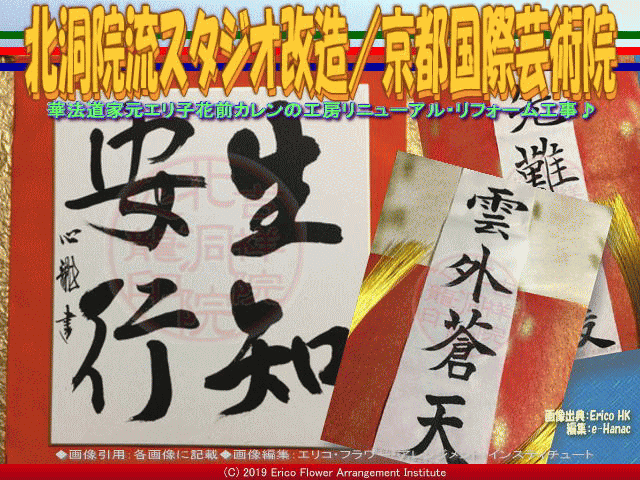 余談ですが、今回、我が北洞院流書法道の総帥(そうすい)吉祥院心龍北洞院流書法道正師範(心龍ITO/伊藤心龍改め、公式ブログ、公式Blog2アメブロ、facebook、Instagram、YouTube、公式HP)はこの京都下鴨ワークショップ北大路スタジオ工房リニューアルリフォーム工事の事案について、ブログでも殆ど顔を出していないのは、病気や今流行の麻疹(はしか)やインフルエンザのためではありません。 作品制作に没頭しての事です。 【北洞院流スタジオ改造(10)/京都国際芸術院 02】 吉祥院心龍という一人の芸術家は、ひとつの事に集中すると他は見えません。 ウチの非営利型一般社団法人京都国際芸術院(法人番号7130005015305/略称:KIAIGIA/キアイジャ/公式ページ/Facebookページ/公式Twitter/代表のTwitter)念願の京都下鴨ワークショップ北大路スタジオ工房リニューアルリフォーム工事の開設や、使い勝手や設計、そしてこれを仕上げるための出張り見回りにシフトなどまったく意に介さない高いレベルで、オープニングの際に展示即売できる優秀な作品生み出しに無我夢中、人生訓四字熟語で表現しますと、一生懸命遮二無二無二無三一心一意一心不乱一意専心しています。 特に、心龍正師範は若い頃修行精進していた頃に、貯めこんでいたデータとしての生活応援人生訓四字熟語をアーカイブして、今まさに作品化しています。 この場を借りて一例を紹介しますと、中庸20章の「生知安行(せいちあんこう)、学知利行(がくちりこう)、困知勉行(こんちべんこう)」の三行ほか、羅列しますと、 ■苦学力行(くがくりっこう) ■先難後獲(せんなんこうかく) ■穿壁引光(せんぺきいんこう) ■懸頭刺股(けんとうしこ) ■一陽来復(いちようらいふく) ■雲外蒼天(うんがいそうてん) ■曇華一現(どんげいちげん) ■錦上添花(きんじょうてんか) ■墜茵落溷(ついいんらくこん) ■不惜身命(ふしゃくしんみょう) ■墨痕淋漓(ぼっこんりんり) また、心龍正師範のススメ、理想の人のあるべき姿、人間力アップの人生訓四字熟語について ■一騎当千(いっきとうせん) ■雲中白鶴(うんちゅうはっかく) ■海闊天空(かいかつてんくう) ■乾坤一擲(けんこんいってき) ■疾風勁草(しっぷうけいそう) ■随処為主(ずいしょいしゅ) ■図南鵬翼(となんほうよく・となんのほうよく) ■知行合一(ちこうごういつ) ■桃李成蹊(とうりせいけい) ■老成円熟(ろうせいえんじゅく) そして心龍正師範の名前に因んだ「龍」を含んだ人生四字熟語については ■雲蒸竜変(うんじょうりょうへん・うんじょうりゅうへん) ■竜騰虎闘(りゅうとうことう・りょうとうことう) ■竜吟虎嘯(りゅうぎんこしょう・りょうぎんこしょう) の作品完成に眠る間も惜しんで3日で7時間睡眠、健常者の3倍の力、これこそ芸術家の創作活動パワーだといって頑張っていると豪語しています。 私エリ子花前カレン(公式ブログ、Profile、facebook、Twitter、公式HP1、公式HP2)は日本書道は準師範7段位ですが、心龍正師範の集中力と揮毫認書するスピードはとても快いものです。 そしてその書で勇気と自信が育まれます。 生活応援人間力アップを図る人生訓四字熟語書法道セラピーです。 京都下鴨ワークショップ北大路スタジオ工房リニューアルリフォーム工事のオープニングの吉日には、これらの人生訓四字熟語書法道セラピー作品と華法道フラワーアレンジセラピー作品が完成していれば是非ご覧いただければ幸いです。・・・つづく ちなみに、このブログページは、非営利型一般社団法人京都国際芸術院(略称:KIAIGIA/キアイジャ/公式ページ/Facebookページ/公式Twitter/代表のTwitter)花の代表、北洞院流華法道の家元として指揮を執る私エリ子花前カレン(公式ブログ、Profile、facebook、Twitter、公式HP1、公式HP2)が管理者です。 我が非営利型一般社団法人京都国際芸術院は、昨年2018年5月に京都中京の四条に法人設立した組織です。設立当初は、書と花をコアにして、書は、吉祥院心龍北洞院流書法道正師範(公式ブログ、公式Blog2アメブロ、facebook、Instagram、YouTube、公式HP)、そして花は私エリ子花前カレンの二人で、京都と大阪と兵庫で活動しています。 最近の実働としては、我が非営利型一般社団法人京都国際芸術院(略称:KIAIGIA/キアイジャ/公式ページ/Facebookページ/公式Twitter/代表のTwitter)は現時点で、書と花と出版をメインテーマにして、教室運営、出張講座、イベント企画と運営、出版、ウェッブ授業とデジタルコンテンツ作成と提供、書と花の各師範の作品開発・販売などを行っています。 設立の2018年は私は、特に一般社団法人京都国際芸術院の設立(『社団法人化への歩み(6)/京都国際芸術院』など)や奈良ホテルでの記念式典(『奈良ホテル書花展(10)/京都国際芸術院』など)、出版事業部の初仕事(『アートの旅/一般社団法人京都国際芸術院』『アートの旅美術館/エリ子花前カレン』『アートの旅facebook記事/京都国際芸術院』『アートの旅松本編集長/京都国際芸術院』など)、産直市場よってって新規開店(『よってって和泉中央(4)/