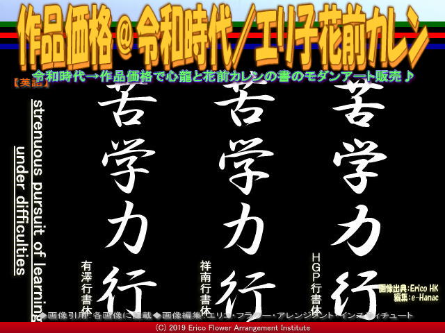人生訓四字熟語「苦学力行」の読みは(くがくりっこう)または(くがくりきこう)です。 英語ではどういうのかと思ってネットのWeblioで調べてみると、“strenuous pursuit of learning under difficulties”または“pursuit of knowledge under difficulties”だそうです。 難しい英語です。 直訳すると、「苦難の下の熱心な学問の追及」または「苦難の下の知識の追求」ということですか。 まあ、「苦難の下に学問や知識を熱心に追及すること」という感じですね。 『令和時代のブログ開設/花前カレン』は以下のシリーズで終了させていただきました。 『令和時代のブログ開設/花前カレン』 『令和時代のブログ開設(2)/花前カレン』 『令和時代のブログ開設(3)/花前カレン』 『令和時代のブログ開設(4)/花前カレン』 『令和時代のブログ開設(5)/花前カレン』 『令和時代のブログ開設(6)/花前カレン』 『令和時代のブログ開設(7)/花前カレン』 『令和時代のブログ開設(8)/花前カレン』 お読み頂きましてありがとうございました。 【作品価格@令和時代(4)/エリ子花前カレン 02】 『人生訓四字熟語「苦学力行」/吉祥院心龍@北洞院流書法道』ブログで詳しく意味を紹介しています。 人生訓四字熟語「苦学力行」(くがくりっこう)は、<働いて苦労しながら懸命に勉強すること。懸命に行う、努力しながら働いて学資を得て、懸命に学問に励むこと。>です。 学び事、習い事、研究、さらには人生そのものの生き方など全てに通じる言葉です。 『苦学力行@令和時代』の作品は、もともと色紙に揮毫認めた(きごうしたためた)作品です。 この「苦学力行」とその英語の表現「strenuous pursuit of learning under difficulties」をPCの書体で書いてみましょう。 上の画像はPC内臓フォントを使ってプリントした「苦学力行」の3フォントのビジュアルです。 やはりPCフォントの行書体ですから何か機械的で綺麗過ぎて味がないというか、まあ、それなりですが・・・つづく 今回北大路ワークショップスタジオで実施している『令和記念イベント』の教材としての「ハーバリウム」については、北洞院流華法道家元エリ子花前カレン(公式ブログ、Profile、facebook、Twitter、公式HP1、公式HP2)は、多くのレッスンを行って来ています。 まずは『ハーバリウム作り@5じやん!/テレビ岸和田EX版/京都国際芸術院』をご覧くださいませ。 【ハーバリウム作り@5じやん!/テレビ岸和田EX版/京都国際芸術院】 ■URL: 以下です。 ※クリックでYouTube動画が観れます。 □https://youtu.be/IBMht5basnQ □https://youtu.be/Oe2BKEqevao ■ジャンル: YouTubeビデオ ■形式: MP4 ■長さ: 00:13:31 ■サイズ: 789MB ■フレーム: 1280x720pxls ■公開: 2019/04/18 ■発信元: 非営利型一般社団法人 京都国際芸術院 TVKテレビ岸和田で北洞院流ハーバリウムが紹介された生番組「5じやん!ハーバリウム」については以下のブログ 『5じやん!ハーバリウム/北垣有唯』 『5じやん!ハーバリウム/加納永美子』 『5じやん!ハーバリウム/川崎亜沙美』 『5じやん!ハーバリウム/真輝志@きんめ鯛』 『5じやん!ハーバリウム/記念撮影』 『5じやん!ハーバリウム/北洞院流工房』 『5じやん!ハーバリウム/北洞院流家元』 『5じやん!ハーバリウム/北洞院流白原』 『5じやん!ハーバリウム/北洞院流』 『5じやん!(5)/TVKテレビ岸和田』 『5じやん!(4)/TVKテレビ岸和田』 『5じやん!(3)/TVKテレビ岸和田』 『5じやん!(2)/TVKテレビ岸和田』 『5じやん!/TVKテレビ岸和田』 を作成してアップしてあります。 また、ハーバリウム体験や講座・レッスン関連ですこし例に挙げると、今までに 『ハーバリウム製作体験(3)/有真香会館』 『ハーバリウム製作体験(2)/有真香会館』 『ハーバリウム製作体験/有真香会館』 『岸和田教育委員会FA講座(5)/エリ子花前カレン』 『岸和田教育委員会FA講座(4)/エリ子花前カレン』 『岸和田教育委員会FA講座(3)/エリ子花前カレン』 『岸和田教育委員会FA講座(2)/エリ子花前カレン』 『岸和田教育委員会FA講座/エリ子花前カレン』 などのブログを作成して紹介してあります。 最近行った少人数でのフラワーアレンジメントにおけるハーバリウムセラピーについては以下のブログ 『煉瓦館ハーバリウム(5)/北洞院流』 『煉瓦館ハーバリウム(4)/北洞院流』 『煉瓦館ハーバリウム(3)/北洞院流』 『煉瓦館ハーバリウム(2)/北洞院流』 『煉瓦館ハーバリウム/北洞院流』 をアップしてあります。 ハーバリウム体験授業の中で口頭で紹介させて頂きました「アートの旅」は、私たち非営利型一般社団法人京都国際芸術院(法人番号7130005015305/略称:KIAIGIA/キアイジャ/公式ページ/Facebookページ/公式Twitter/代表のTwitter)が企画・出版しています小冊子の名称で、英語名は“THE TRAVEL OF ART”です。 日本の各地の美術館や博物館から掲載ご許可を頂いて展示作品や催事などを紹介するフリーペーパーです。 私エリ子花前カレンが企画に加わって、松本正編集長が編集・出版した昨年からのアートの旅は、「アートの旅2018春号(640x480画像)」「アートの旅2018夏号(表紙2460x3486画像、動画『アートの旅/ページめ