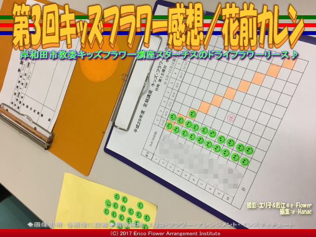 【キッズ・フラワーアレンジ(3)/岸和田 01】 今回の紹介ブログは、『キッズ・フラワーアレンジ(3)/岸和田』です。 前回(昨日)の紹介ブログ『キッズ・フラワーアレンジ(2)/岸和田』の続きです。 前々回(一昨日)の紹介ブログ『キッズ・フラワーアレンジ/岸和田』から続いています。 本ブログ画像タイトルは、「キッズ・フラワーアレンジ/岸和田」で統一しています。 画像共通テーマ(サブタイトル)は<岸和田教委いきいき学びのプラン中央公民館キッズ定期講座Xmas♪>です。 タグは<#キッズ・フラワー、#フラワーアレンジ、#岸和田、#岸和田教委、#いきいき学びのプラン、#中央公民館、#キッズ定期講座、#Xmas、#クリスマス会、#定期講座>としています。 上の画像の中央の女性は、岸和田市立中央公民館キッズ・フラワーの立ち上げのときからずっとお世話いただいています岸和田市教育委員会生涯学習部生涯学習課社会教育指導員の西村千都子(にしむらちずこ)さんです。 キッズ・フラワークラス運営の心強いサポート、そしてレッスンでもアシストをしてくださいます。 キッズ達にも人気があってとても優しい指導員さんです。 私エリ子花前カレン(公式ブログ、Profile、facebook、Twitter、公式HP1、公式HP2)と弟子の新谷若江プロフローリストは助かっています。 本当にいつもありがとうございます。 「キッズ・フラワーアレンジ(3)/岸和田」関連は、一昨日より年を跨いで以下のブログ 『岸和田キッズ・フラワー(2)/Xmasアレンジ』 『岸和田キッズ・フラワー/Xmasアレンジ』 を作成して投稿アップしています。 あわせてご覧くださいませ。 また、2017年平成29年度のクリスマス会は以下のブログ 『ミニXmas会/キッズ・フラワー花前カレン』 『ミニXmas会(2)/キッズ・フラワー花前カレン』 『ミニXmas会(3)/キッズ・フラワー花前カレン』 『ミニXmas会(4)/キッズ・フラワー花前カレン』 『ミニXmas会(5)/キッズ・フラワー花前カレン』 『ミニXmas会(6)/キッズ・フラワー花前カレン』 で紹介しています。 2017年平成29年度の「クリスマス」定期講座は、テーブルフラワーアレンジ「クリスマスキャンドルリース」については以下のブログ 『第8回キッズ・フラワー/エリ子花前カレン』 『第8回キッズ・フラワー(2)/エリ子花前カレン』 『第8回キッズ・フラワー(3)/エリ子花前カレン』 『第8回キッズ・フラワー(4)/エリ子花前カレン』 『第8回キッズ・フラワー(5)/エリ子花前カレン』 『第8回キッズ・フラワー(6)/エリ子花前カレン』 『第8回キッズ・フラワー(7)/エリ子花前カレン』 『第8回キッズ・フラワー(8)感想/花前カレン』 を作成してアップしてあります。 2017年平成29年度の定期講座「第7回キッズフラワー/クリスマスツリー」については、以下のブログ 『第7回キッズフラワー(8)/Xmasツリー飾り作り』 『第7回キッズフラワー(7)/Xmasツリーオーナメント作り』 『第7回キッズフラワー(6)/Xmasツリーリボン下準備』 『第7回キッズフラワー(5)/Xmasツリーオアシス下準備』 『第7回キッズフラワー(4)/Xmasツリー下準備』 『第7回キッズフラワー(3)/Christmas Tree』 『第7回キッズフラワー(2)/公民館まつり』 『第7回キッズフラワー/クリスマスツリー』 を作成してアップしてあります。あわせてご覧ください。 11月に前もって岸和田市報「広報きしわだ11月号」でも掲載された、12月2日(日)の岸和田市葛城地区公民館が開催する今年最後のクリスマスイベントとして「ミニクリスマスツリーをつくろう!」講座(※岸和田市広報募集画像はこちら)については、 開催後の手順などのレポートブログは今までに以下のブログ 『フラワーアレンジ/岸和田』 『フラワーアレンジメント/岸和田』 『フラワーアレンジXmas/岸和田』 『ミニクリスマスツリー手順/岸和田フラワーアレンジ』 『ミニXmasツリー手順(2)/岸和田フラワーアレンジ』 『ミニクリスマスツリー完成/岸和田フラワーアレンジ』 の6本を作成してアップしてあります。 そしてワンオフレッスン講座「ミニクリスマスツリーをつくろう!」開催前の案内ブログは以下の3本のブログ 『岸和田市フラワーアレンジ/エリ子花前カレン』 『岸和田市フラワーアレンジ(2)/エリ子花前カレン』 『岸和田市フラワーアレンジ(3)/エリ子花前カレン』 でも紹介させて頂きました。 あわせてご覧頂ければ幸いです。 また、岸和田市の公民館イベントについては、2017年岸和田市教育委員会生涯学習部生涯学習課主催のクリスマスシーズンのみの公募の「キャンドルリースを作ろう!」でクリスマスリースのワンオフレッスン講座を行っています。以下のブログ 『Xmas2017キャンドルリース(6)/葛城地区公民館』 『Xmas2017キャンドルリース(5)/葛城地区公民館』 『Xmas2017キャンドルリース(4)/葛城地区公民館』 『Xmas2017キャンドルリース(3)/葛城地区公民館』 『Xmas2017キャンドルリース(2)/葛城地区公民館』 『Xmas2017キャンドルリース/葛城地区公民館』 を作成してアップしてあります。 そして2016年の岸和田市クリスマスイベントとして「クリスマスサ