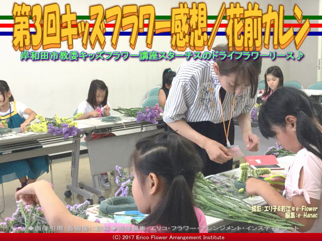 今回の7月<第3回: キッズ・フラワー#170701『ドライフラワーのリース』>の授業は、8人の参加でした。 そもそも私のキッズ・フラワー講座は、毎回エコでクラフトチックでフラワーアレンジの基礎知識を学んでもらおうと、オリジナル企画で独自の教材を毎回考えています。 【第3回キッズフラワー感想【2】/花前カレン 02】 今回の<第3回: キッズ・フラワー#170701『ドライフラワーのリース』>は、少しずつ暑くなって、花持ちも悪くなって来る7月開催です。 お花にとっては酷な季節です。 そんな中、なにが良いのかと考えていますと・・・ あっ!とひらめいたのが、リースです。 そうだ!リースが良いわ! それもドライフラワーになって行くリースを! 材料となる花材は既に季節の物が頭に浮かんでいます。・・・つづく ちなみに、私プロフローリスト、エリ子花前カレンがインストラクターを務めさせて頂いています、岸和田市教育委員会生涯学習部生涯学習課主催のフラワーアレンジメント関連ブログは、以下のようなタイトルがあります。 2 『2016フラワーアレンジ/公民館まつり花前カレン』 2 『2016フラワーアレンジ(2)/公民館まつり花前カレン』 K 『KAFAC植田享子/花前カレン生徒作品集』 K 『KAFAC原光枝/花前カレン生徒作品集』 K 『KAFAC植田美紀/花前カレン生徒作品集』 K 『KAFAC小山淳子/花前カレン生徒作品集』 K 『KAFAC笠井ヒデ子/花前カレン生徒作品集』 K 『KAFAC太田良江/花前カレン生徒作品集』 K 『KAFAC外山真利子/花前カレン生徒作品集』 K 『KAFAC小椋美栄子/花前カレン生徒作品集』 K 『KAFAC上田順子/花前カレン生徒作品集』 K 『KAFAC植田千代子/花前カレン生徒作品集』 K 『KAFAC藤本利子/花前カレン生徒作品集』 あ 『有真香2015Xmasリース/花前カレン』 あ 『有真香会館/花前カレン』 あ 『有真香会館花アレンジ/花前カレン』 あ 『有真香花アレンジクラブ/花前カレン』 お 『お正月初めての雨の祭日/花前カレン』 お 『お正月飾りフラワーアレンジ/花前カレン』 お 『お正月飾りフラワーアレンジ(2)/花前カレン』 お 『お正月飾りフラワーアレンジ(3)/花前カレン』 お 『お正月飾り2017フラワーアレンジ/花前カレン』 か 『葛城地区公民館/花前カレン』 か 『葛城公民館祭2016展示/花前カレン』 か 『葛城公民館祭2016発表/花前カレン』 か 『葛城地区公民館祭2016/花前カレン』 か 『葛城地区公民館まつり/花前カレン』 か 『葛城地区公民館まつり(2)/花前カレン』 か 『葛城地区公民館まつり(3)/花前カレン』 か 『葛城地区公民館まつり(4)/花前カレン』 か 『葛城地区公民館まつり(5)/花前カレン』 か 『葛城地区公民館まつり(6)/花前カレン』 こ 『コスモスアレンジ(4)/花前カレン』 こ 『コスモス・フラワーアレンジ(3)/花前カレン』 さ 『サンタのモスブーツ大芝会館/Xmas花前カレン』 さ 『サンタのモスブーツ/クリスマス花前カレン』 ふ 『フラワーアレンジ・コスモス(2)/花前カレン』 ふ 『フラワーアレンジメント・コスモス/花前カレン』 ふ 『フラワーアレンジメント/花前カレン』 ふ 『フラワーアレンジメント2016/花前カレン』 ふ 『フラワーアレンジ準備編/葛城地区公民館まつり2016』 ふ 『フラワーアレンジ市場編/公民館まつり2016花前カレン』 ふ 『フラワーアレンジ市場(2)/公民館まつり2016花前カレン』 ふ 『フラワーアレンジメント前日/葛城地区公民館まつり2016』 ふ 『フラワーアレンジメント制作/葛城地区公民館まつり2016』 ふ 『フラワーアレンジメント展示/葛城地区公民館まつり2016』 ふ 『フラワーアレンジメント公開/葛城地区公民館まつり2016』 ふ 『プリザーブドフラワーアレンジ/花前カレン』 ふ 『プリザーブドフラワーアレンジ(2)/葛城地区公民館まつり2016』 ふ 『プリザーブドフラワーアレンジ(3)/ワイヤリング花前カレン』 ふ 『プリザーブドフラワーアレンジ(4)/テーピング花前カレン』 あわせてご覧いただければ幸いです。 また、この画像の岸和田市立中央地区公民館で行われているキッズ・フラワー講師である私、エリ子花前カレン関連ブログは、 『プロフローリスト花屋/花前カレン一期一会』 『プロフローリスト花屋(2)/花前カレン』 『プロフローリスト花屋(3)/花前カレン』 『プロフローリスト花屋(4)/花前カレン』 『プロフローリスト花屋(5)/花前カレン』 『プロフローリスト花屋(6)/花前カレン』 『プロフローリスト花屋(7)/花前カレン』 『プロフローリスト花屋(8)/花前カレン』 『プロフローリスト花屋(9)/花前カレン』 『フラワーショップ園部/花前カレン』 『フラワーショップ園部(2)/花前カレン』 『フラワーショップ園部(3)/花前カレン』 『フラワーショップ園部(4)/花前カレン』 『フラワーショップ園部(5)/花前カレン』 『ノマドワーカー(5)/花前カレン』 『ノマドワーカー(4)/花前カレン』 『ノマドワーカー(3)/花前カレン』 『ノマドワーカー(2)/花前カレン』 『ノマドワーカー/花前カレン』 のタイトルがあります。 最近はfacebook デビュー勉強中です。厚かましくて恐れ入りますが、「いい