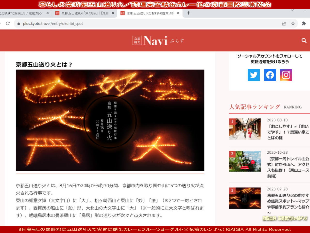 8月暮らしの歳時記は五山送り火で実習は鯖缶カレー他@花前カレン♪