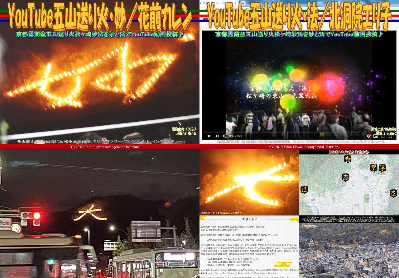 お盆の精霊(「おしょらいさん」)を送る伝統行事である京都の五山送り火は、、千年の都古都京都市登録無形民俗文化財です。 京都の五山送り火は、まずは午後8時から東山、左京区浄土寺七廻り町に「大」の文字が点されるとくっきりと漆黒の夜空に浮かび上がり、続いて、左京区松ヶ崎西山・東山に「妙」と「法」、北区西賀茂に船形、北区大北山に左大文字、そして、右京区嵯峨鳥居本に鳥居形と続きます。 これら5つの送り火は現在は8時から順に5分間隔で点火されていきます。 代表的な観覧地点(ビューイングスポットVS)は以下です。 ■大文字=20:00~20:30頃 VS:賀茂川(鴨川)堤防〔丸太町大橋?御薗橋〕 ■妙=20:05~20:35頃 VS:北山通〔京都ノートルダム女子大学附近〕 ■法=20:05~20:35頃 VS:高野川堤防〔高野橋北〕 ■船形=20:10~20:40頃 VS:北山通〔北山橋から北西〕 ■左大文字=20:15~20:45頃 VS:西大路通〔西院?金閣寺〕 ■鳥居形=0:20~20:50頃 VS:松尾橋・広沢の池など 【五山送り火(4)/北洞院エリ子花前カレン 02】 今回は、千年の都古都京都大好きの私北洞院エリ子こと、エリ子花前カレン(公式ブログ、Profile、facebook、Twitter、公式HP1、公式HP2)は、初めて五山送り火の松ヶ崎「妙法」を見学します。 北大路WSS(下鴨北大路ワークショップオフィス)の窓からは、松ヶ崎「妙法」の「妙」という字が一部だけ見ることが出来ます。 ネットで紹介されています、松ヶ崎「妙法」の代表的な観覧地点(ビューイングスポットVS)は、「妙」は北山通京都ノートルダム女子大学付近、「法」は、高野川堤東岸(河合橋~松ヶ崎浄水場付近)です。 松ヶ崎「妙法」を撮影する以上は、京都大好きの私は間近で見たい、まずは点火の瞬間を我が目で見て、できればビデオに撮りたいと思います。 静止画像はキャノンEOS Kiss X9iで、そしてアメリカでは映画監督が映画撮影でも使うiPhoneで動画撮影してビデオ制作を!という気持ちで現場に向かいます。・・・つづく このブログページは、我が非営利型一般社団法人京都国際芸術院(法人番号7130005015305/略称:KIAIGIA/キアイジャ/公式ページ/Facebookページ/公式Twitter/代表のTwitter)花の代表、北洞院流華法道の家元として指揮を執る私北洞院エリ子花前カレン(公式ブログ、Profile、facebook、Twitter、公式HP1、公式HP2)が管理者です。 我が非営利型一般社団法人京都国際芸術院は、昨年2018年5月に京都中京の四条に法人設立した組織です。設立当初は、書と花をコアにして、書は、吉祥院心龍北洞院流書法道正師範(公式ブログ、公式Blog2アメブロ、facebook、Instagram、YouTube、公式HP)、そして花は私北洞院エリ子花前カレンの二人で、京都と大阪と兵庫で活動しています。 設立の2018年は私は、特に一般社団法人京都国際芸術院の設立(『社団法人化への歩み(6)/京都国際芸術院』など)や奈良ホテルでの記念式典(『奈良ホテル書花展(10)/京都国際芸術院』など)、出版事業部の初仕事(『アートの旅/一般社団法人京都国際芸術院』『アートの旅美術館/エリ子花前カレン』『アートの旅facebook記事/京都国際芸術院』『アートの旅松本編集長/京都国際芸術院』など)、産直市場よってって新規開店(『よってって和泉中央(4)/エリ子花前カレン』など)でのプロパー作品展示販売、そして公式ページの立上げやFcebookページやTwitterの開設、そして個人的には動画編集ビデオ制作の学習(『ビデオ制作勉強会(9)/エリ子花前カレン』など)等、ネット関連の仕事も増えて、有難くもどんどん忙しくなってきました。 また、2019年4月には京都下鴨北大路通りに北大路WS2(ワークショップ・スタジオ)を開設しました。※改装準備中の画像(※引用『北洞院流スタジオ改造(8)/京都国際芸術院』など)はこちら。 最近の我が非営利型一般社団法人京都国際芸術院の実働としては、書と花と出版をメインテーマにして、教室運営、出張講座、イベント企画と運営、出版、ウェッブ授業とデジタルコンテンツ作成と提供、京都四条北洞院流書法道と華法道認定の各師範の作品開発・頒布販売(<令和時代><作品価格@令和時代>)などを行っています。 とりわけ人気のハーバリウム体験や講座・レッスン関連ですこし例に挙げると、今までに 『ハーバリウム製作体験(3)/有真香会館』 『岸和田教育委員会FA講座(5)/エリ子花前カレン』『煉瓦館ハーバリウム(5)/北洞院流』を行い、一部ブログを作成して紹介してあります。 ハーバリウム体験授業の中で必ず口頭で紹介させて頂きます「アートの旅」は、私たち非営利型一般社団法人京都国際芸術院が企画・出版しています小冊子の名称で、英語名は“THE TRAVEL OF ART”です。 「アートの旅」は、日本の各地の美術館や博物館から掲載ご許可を頂いて展示作品や催事などを紹介するフリーペーパーです。 私北洞院エリ子花前カレンが企画と制作に加わって、松本正編集長が編集・出版した昨年からのアートの旅は、「アートの旅2018春号(640x480画像)」「アートの旅2018夏号(表紙2460x3486画像、動画『アートの旅/ページめくり』)」「アートの旅2018秋号」「アー