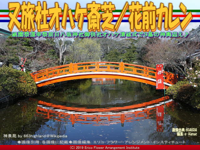 「祇園祭還幸祭」前日の八坂神社御供社「又旅社」の「オハケ清祓式(おはけきよはらいしき/おはけせいばつしき)」神事で、東南(辰巳、巽、たつみ、そん)の方位に配置された、幅七尺(横約210センチメートル)奥行二尺(縦60センチメートル)の地べたを這うような低い芝生を張った土壇、緑の縁台は、斎芝(いみしば)と呼ばれると書きました。 この斎芝(いみしば/いつきのしば)は水辺を表わす芝生の土壇です。 オハケはこの斎芝(いみしば/いつきのしば)に神の依り代である御幣三本を立てたものです。 【又旅社オハケ斎芝(6)/花前カレン 02】 八坂神社御供社「又旅社」の「オハケ清祓式(おはけきよはらいしき/おはけせいばつしき)」を拝読すると、 <貞観11年(869)都に疫病が流行した時、平安京の広大な庭園であった神泉苑に66本の鉾を立て、祇園社(現八坂神社)の神輿を迎え、祇園御霊会が行われた。 当社は往古の神泉苑の南端にあたり祇園御霊会祭日である6月14日(明治以後は7月24日に変更)には斎場が設けられ、祇園社の神輿三基を奉安し、神饌を御供えする。>と書かれています。 そして八坂神社御供社「又旅社」の <当社が鎮座する三条大宮の地は、古く平安時代より、祭りの行列を点検する場所を意味する「列見の辻」と呼ばれており、都の北側を巡る少将井(櫛稲田姫命)神輿と南側を巡る大政所(素戔嗚尊)神輿並びに八王子(八柱御子神)神輿が合流する地であった。そのため、一千年を経た今日に於いても、祇園祭の還幸祭(7月24日)には、三基の神輿が当社前に奉安され、神饌を供え奉饌祭が執り行われている。> と「列見の辻」を説明しています。 八坂神社御供社「又旅社」は、千年の都古都京都祇園祭の起源と言われる「御霊会(ごりょうえ)」が行われた神泉苑の東南の端に位置しています。 オハケをじっと見ていると、この今私が居る八坂神社御供社「又旅社」は、神泉苑の池のほとりにある斎場だったのだという説明もよく分かります。 因みに、現在の神泉苑は、慶長8年(1603年)徳川家康が二条城を造営した際に当時の16分の1の規模に縮小されているようです。 平安時代当初の敷地は二条通から三条通まで、南北約500メートル、東西約240メートルに及ぶ、池を中心とした広大な庭園だったそうです。・・・つづく このブログページは、我が非営利型一般社団法人京都国際芸術院(法人番号7130005015305/略称:KIAIGIA/キアイジャ/公式ページ/Facebookページ/公式Twitter/代表のTwitter)花の代表、北洞院流華法道の家元として指揮を執る私北洞院エリ子花前カレン(公式ブログ、Profile、facebook、Twitter、公式HP1、公式HP2)が管理者です。 我が非営利型一般社団法人京都国際芸術院は、昨年2018年5月に京都中京の四条に法人設立した組織です。設立当初は、書と花をコアにして、書は、吉祥院心龍北洞院流書法道正師範(公式ブログ、公式Blog2アメブロ、facebook、Instagram、YouTube、公式HP)、そして花は私北洞院エリ子花前カレンの二人で、京都と大阪と兵庫で活動しています。 設立の2018年は私は、特に一般社団法人京都国際芸術院の設立(『社団法人化への歩み(6)/京都国際芸術院』など)や奈良ホテルでの記念式典(『奈良ホテル書花展(10)/京都国際芸術院』など)、出版事業部の初仕事(『アートの旅/一般社団法人京都国際芸術院』『アートの旅美術館/エリ子花前カレン』『アートの旅facebook記事/京都国際芸術院』『アートの旅松本編集長/京都国際芸術院』など)、産直市場よってって新規開店(『よってって和泉中央(4)/エリ子花前カレン』など)でのプロパー作品展示販売、そして公式ページの立上げやFcebookページやTwitterの開設、そして個人的には動画編集ビデオ制作の学習(『ビデオ制作勉強会(9)/エリ子花前カレン』など)等、ネット関連の仕事も増えて、有難くもどんどん忙しくなってきました。 また、2019年4月には京都下鴨北大路通りに北大路WS2(ワークショップ・スタジオ)を開設しました。※改装準備中の画像(※引用『北洞院流スタジオ改造(8)/京都国際芸術院』など)はこちら。 最近の我が非営利型一般社団法人京都国際芸術院の実働としては、書と花と出版をメインテーマにして、教室運営、出張講座、イベント企画と運営、出版、ウェッブ授業とデジタルコンテンツ作成と提供、京都四条北洞院流書法道と華法道認定の各師範の作品開発・頒布販売(<令和時代><作品価格@令和時代>)などを行っています。 とりわけ人気のハーバリウム体験や講座・レッスン関連ですこし例に挙げると、今までに 『ハーバリウム製作体験(3)/有真香会館』 『岸和田教育委員会FA講座(5)/エリ子花前カレン』『煉瓦館ハーバリウム(5)/北洞院流』を行い、一部ブログを作成して紹介してあります。 ハーバリウム体験授業の中で必ず口頭で紹介させて頂きます「アートの旅」は、私たち非営利型一般社団法人京都国際芸術院が企画・出版しています小冊子の名称で、英語名は“THE TRAVEL OF ART”です。 「アートの旅」は、日本の各地の美術館や博物館から掲載ご許可を頂いて展示作