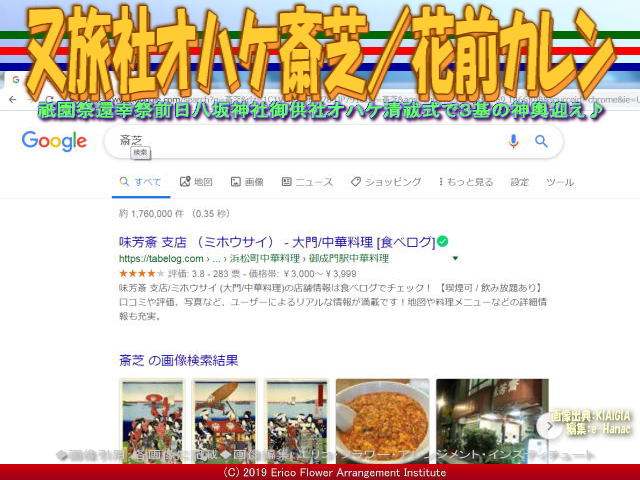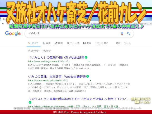 京都祇園祭は7月1日から31日の一ヶ月間営まれました。 今年2019年令和元年の京都祇園祭は1150年の節目を迎えました。 京都大好きの私北洞院エリ子こと、エリ子花前カレン(公式ブログ、Profile、facebook、Twitter、公式HP1、公式HP2)は、京都祇園祭一ヶ月のお祭り期間の間出来るだけ時間を割いて観てきました。 北野天満宮七夕祭や京都五山送り火松ヶ崎妙法なども拝観させて頂きました。 感激覚めやらぬ間にブログ記事を書いています。 京都関係のブログや動画は以下 ■YouTube動画 『「妙法」京都五山送り火@京都国際芸術院』 『京都五山送り火「法」@京都国際芸術院』 『京都五山送り火「妙」@京都国際芸術院』 京都国際芸術院のYouTubeチャンネル 『YouTube五山送り火妙法/花前カレン』 『YouTube五山送り火・法/北洞院エリ子』 『YouTube五山送り火・妙/花前カレン』 『誰もいない京都北野天満宮/京都国際芸術院』YouTube動画 『北野天満宮後日譚(3)/花前カレン』 『北野天満宮後日譚(2)/花前カレン』 『北野天満宮後日譚/花前カレン』 『五山送り火(4)/北洞院エリ子花前カレン』 『五山送り火(3)/北洞院エリ子花前カレン』 『五山送り火(2)/北洞院エリ子花前カレン』 『五山送り火/北洞院エリ子花前カレン』 『北野天満宮七夕祭(10)/花前カレン』 『北野天満宮七夕祭(9)/花前カレン』 『北野天満宮七夕祭(8)/花前カレン』 『北野天満宮七夕祭(7)/花前カレン』 『北野天満宮七夕祭(6)/花前カレン』 『北野天満宮七夕祭(5)/花前カレン』 『北野天満宮七夕祭(4)/花前カレン』 『北野天満宮七夕祭(3)/花前カレン』 『北野天満宮七夕祭(2)/花前カレン』 『北野天満宮七夕祭/花前カレン』 『オハケ清祓式(12)/北洞院エリ子花前カレン』 『オハケ清祓式(11)/北洞院エリ子花前カレン』 『オハケ清祓式(10)/北洞院エリ子花前カレン』 『オハケ清祓式(9)/北洞院エリ子花前カレン』 『オハケ清祓式(8)/北洞院エリ子花前カレン』 『オハケ清祓式(7)/北洞院エリ子花前カレン』 『オハケ清祓式(6)/北洞院エリ子花前カレン』 『オハケ清祓式(5)/北洞院エリ子花前カレン』 『オハケ清祓式(4)/北洞院エリ子花前カレン』 『オハケ清祓式(3)/北洞院エリ子花前カレン』 『オハケ清祓式(2)/北洞院エリ子花前カレン』 『オハケ清祓式/北洞院エリ子花前カレン』 『京都観光都市世界一(2)/北洞院エリ子』 『京都観光都市世界一/北洞院エリ子』 『くじ取り式(4)/北洞院エリ子花前カレン』 『くじ取り式(3)/北洞院エリ子花前カレン』 『くじ取り式(2)/北洞院エリ子花前カレン』 『くじ取り式/北洞院エリ子花前カレン』 『祇園祭(5)/北洞院エリ子花前カレン』 『祇園祭(4)/北洞院エリ子花前カレン』 『祇園祭(3)/北洞院エリ子花前カレン』 『祇園祭(2)/北洞院エリ子花前カレン』 『祇園祭/北洞院エリ子花前カレン』 『祇園祭2019蟷螂山(5)/花前カレン』 『祇園祭2019蟷螂山(4)/花前カレン』 『祇園祭2019蟷螂山(3)/花前カレン』 『祇園祭2019蟷螂山(2)/花前カレン』 『祇園祭2019蟷螂山/花前カレン』 を作成してアップしています。 あわせてご覧いただければ幸いです。 今回のブログは、「斎芝」について気になりました一つの目です。 「斎芝」って何と読むのだろうか?ということです。 【又旅社オハケ斎芝(2)/花前カレン 02】 先日のブログ『オハケ清祓式(12)/北洞院エリ子花前カレン』で、祇園祭や八坂神社の末社・八坂神社御供社「オハケ清祓式」関連では、難しい漢字が多いので、八坂神社語彙としてお勉強したついでに漢字と読み方を書いておきました。 リストには「斎芝」は挙げていません。 私のブログには「斎芝」=「いみしば」と書いていますが、実はこの読みには根拠がありません。 私が京都の顧問の先生からそう聞いて書いているだけです。 一応、「斎芝」についてネットでGoogle「斎芝」検索してみました。 「いみしば」についてもネットでGoogle「いみしば」検索してみました。 上のタイトル画像や挿入画像は、Google検索のインデクサページのプリントスクリーンワンショットビジュアルです。 あれ?私は探し下手なのかしら。 「斎芝」、「いみしば」では詳しいページは見つけることができませんでした。 ネットで納得いくページが見つけられないので、自分なりに「斎」という漢字から調べてみることにします。・・・つづく ■このブログについて このブログページは、我が非営利型一般社団法人京都国際芸術院(法人番号7130005015305/略称:KIAIGIA/キアイジャ/公式ページ/Facebookページ/公式Twitter/代表のTwitter)花の代表、北洞院流華法道の家元として指揮を執る私北洞院エリ子花前カレン(公式ブログ、Profile、facebook、Twitter、公式HP1、公式HP2)が管理者です。 ・・・もっと詳しく □テキスト編集:Fiori, Erico _ |