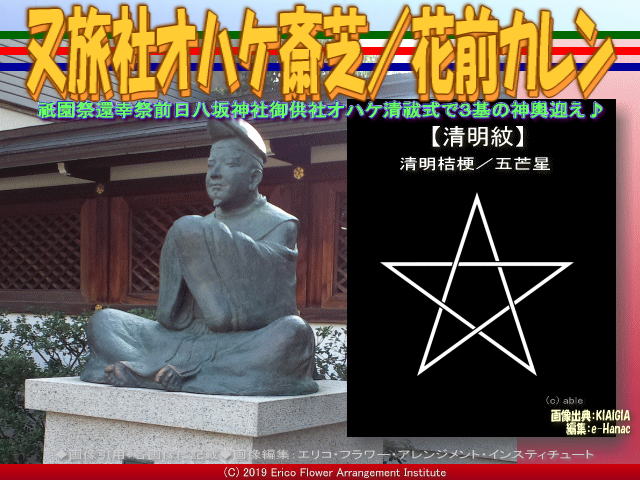 さて、今回のブログは、「斎芝」について気になりました二つの目の事です。 「オハケ清祓式(おはけきよはらいしき/おはけせいばつしき)」の神事でのオハケを立てる「斎芝」を観て気がついたことは、斎芝(いみしば/いつきのしば)そのものの位置の事です。 言い換えれば、八坂神社御供社「又旅社」のお社の建物から見て、斎芝の位置、方位です。 陰陽道が盛んな平安時代には、きっと陰陽師(おんみょうじ)安倍晴明(あべ のせいめい/はるあき/はるあきら/延喜21年1月11日〈921年2月21日〉~寛弘2年9月26日〈1005年10月31日〉)ならこの斎芝の位置、方位に何らかの考えがある筈です。 上のタイトル画像は、一条戻橋のたもと(北西)にあった晴明の屋敷跡に鎮座する晴明神社の安倍晴明の像(京都市上京区堀川通一条上る晴明町806番地1)を撮影したYanajin33@Wikipediaさんのワンショットビジュアルです。 また画像に挿入してある清明紋(清明桔梗/五芒星・ごぼうせい)はMukai@Wikipediaさんの作品です。 規約に遵って使用させて頂いています。 Yanajin33さん、Mukaiさん、貴重な作品をありがとうございます。 【又旅社オハケ斎芝(5)/花前カレン 02】 私エリ子花前カレン(公式ブログ、Profile、facebook、Twitter、公式HP1、公式HP2)は、いけばなやFAフラワーアレンジメントに関わってくるインテリアやエクステリアなど室内コーディネートや屋外造園のデザインやプロデュースもしますので、方位に興味を持ってお勉強・精進しています。 今回初めてこの「祇園祭還幸祭」の八坂神社御供社「又旅社」の「オハケ清祓式(おはけきよはらいしき/おはけせいばつしき)」神事を拝見しました。 オハケ(おはけ)を立てるこの斎芝(いみしば/いつきのしば)が置かれている位置に興味を持ちました。 このお社から見て、この斎芝(いみしば/いつきのしば)は東南の位置にあります。 東南の方位は一般的に辰巳方位、巽(たつみ、そん)と呼ばれてところです。 東南(辰巳、巽、たつみ、そん)は、八方位の中では最上の吉方位で、太陽が昇る(RisingSun ライジングサン)東のパワーと日光(SunRays サンレイズ)が良く差し込む南のエネルギーの集まるRSR位置にあります。 斎芝(いみしば/いつきのしば)はパワーとエネルギーの両方に恵まれた吉方位です。 東南(辰巳、巽、たつみ、そん)は、陰陽師時代の昔から大切にされてきた方位です。 その方位に、さらに出っ張って斎芝(いみしば/いつきのしば)を設置してあります。 東南(辰巳、巽、たつみ、そん)の方位に「張り」を作って一層の吉方に斎芝(いみしば/いつきのしば)を置くという周到さです。 流石、千年の都古都京都祇園祭から学ぶところは数多くあります。・・・つづく ■AboutUs(1) このブログページは、我が非営利型一般社団法人京都国際芸術院(法人番号7130005015305/略称:KIAIGIA/キアイジャ/公式ページ/Facebookページ/公式Twitter/代表のTwitter)花の代表、北洞院流華法道の家元として指揮を執る私北洞院エリ子花前カレン(公式ブログ、Profile、facebook、Twitter、公式HP1、公式HP2)が管理者です。 ■AboutUs(2) 我が非営利型一般社団法人京都国際芸術院は・・・ ■AboutUs(3) 設立の2018年は・・・ ■AboutUs(4) 2019年4月には京都下鴨北大路通りに・・・ ■AboutUs(5) 最近の我が非営利型一般社団法人京都国際芸術院の実働としては・・・ ■AboutUs(6) 「アートの旅」は、・・・ ■AboutUs(7) アートの旅は一年で・・・ ■AboutUs(8) 私北洞院エリ子花前カレンは、自分の教室・・・ ■AboutUs(9) 私は、フラワーアレンジメントプロフローリスト&花屋・・・ ■AboutUs(10) そして浜の市場・大阪府泉佐野漁業協同組合直結の青空市場(略称:泉佐野漁協青空市場)の・・・ ★YouTube動画は、テレビ岸和田で京都国際芸術院のハーバリウム(『5じやん!ハーバリウム/記念撮影』『5じやん!(5)/TVKテレビ岸和田』『5じやん!ハーバリウム/北洞院流』)が取り上げられました。 ![]() 【ハーバリウム作り@5じやん!/テレビ岸和田EX版/京都国際芸術院】 ■URL: 以下です。 ※クリックでYouTube動画が観れます。 □https://youtu.be/IBMht5basnQ □https://youtu.be/Oe2BKEqevao ■ジャンル: YouTubeビデオ ■形式: MP4 ■長さ: 00:13:31 ■サイズ: 789MB ■フレーム: 1280x720pxls ■公開: 2019/04/18~1週間のヘビロテ ■ブログ: 『5じやん!ハーバリウム/記念撮影』 ■発信元: 非営利型一般社団法人 京都国際芸術院 ★またアップしていただきましたYouTube動画は、以下です。 2017年の年末はテレビ岸和田TVK放送で私のクリスマスフラワーアレンジが、「テレビ岸和田 ドレミファん」(#39/12月の放送内容)で12月中ずっと一ヶ月間ヘビーローテーションで毎日2回放映されました。YouTube動画投稿していただいて、Googleでもインデクサされています。 【簡単クリスマスリース作り/TVKドレミファん】 『公民館まつり2017/岸和田市立中央地区公民館』とあわせてご覧頂ければ幸いです。 私へのご連絡は、<kiaigia@outlook.com>か <info@kiaigia.org>の私宛にメールを頂ければ幸いです。 【リンク集】 一般社団法人京都国際芸術院公式HP: ★http://kiaigia.org/ ★http://facebook.com