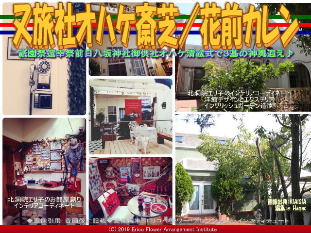 あ、ところで、昨日書いたこの3本の御幣は、正確には3体の御幣という数え方をします。 なぜ3体と数えるかというと、「祇園祭還幸祭」前日の八坂神社御供社「又旅社」の「オハケ清祓式(おはけきよはらいしき/おはけせいばつしき)」で斎芝(いみしば)に立てられる3本の御幣には、素戔嗚尊(すさのおのみこと)、櫛稲田姫命(くしなだひめのみこと)、八柱御子神(やはしらのみこがみ)が移り宿るからです。 これを依り代といいます。 【又旅社オハケ斎芝(8)/花前カレン 02】 「オハケ清祓式(おはけきよはらいしき/おはけせいばつしき)」を思い起こすと、神職が斎芝(いみしば)の中央に、まずは中央に素戔嗚尊(すさのおのみこと)に見立てた御幣を立てます。 その右に櫛稲田姫命(くしなだひめのみこと)、そして最後に左に八柱御子神(やはしらのみこがみ)が依り代とする御幣を立てます。 3人の神様が宿るのが3本の御幣なので、宿った後は3体の御幣となります。 八坂神社御供社「又旅社」の「オハケ清祓式(おはけきよはらいしき/おはけせいばつしき)」は7月の23日。 そして「祇園祭還幸祭」は翌7月の24日には、斎芝(いみしば/いつきのしば)の回り四隅には斎竹を立て、注連縄(しめなわ)を張っています。 ちなみに、注連縄(しめなわ)については、当ブログでは以下のブログ 『ワラからしめ縄作り(5)/花前カレン』 『注連飾り作り(6)/花職人花前カレン』 『しめ飾り(5)/フラワーアレンジ花前カレン』 『お正月しめ縄(3)/花前カレン一期一会』 を作成してアップしてあります。 あわせてお読みいただければ幸いです。 画像は7月の24日「祇園祭還幸祭」当日の八坂神社御供社「又旅社」でのワンショットビジュアルです。・・・つづく ■AboutUs(1) このブログページは、我が非営利型一般社団法人京都国際芸術院(法人番号7130005015305/略称:KIAIGIA/キアイジャ/公式ページ/Facebookページ/公式Twitter/代表のTwitter)花の代表、北洞院流華法道の家元として指揮を執る私北洞院エリ子花前カレン(公式ブログ、Profile、facebook、Twitter、公式HP1、公式HP2)が管理者です。 ■AboutUs(2) 我が非営利型一般社団法人京都国際芸術院は・・・ ■AboutUs(3) 設立の2018年は・・・ ■AboutUs(4) 2019年4月には京都下鴨北大路通りに・・・ ■AboutUs(5) 最近の我が非営利型一般社団法人京都国際芸術院の実働としては・・・ ■AboutUs(6) 「アートの旅」は、・・・ ■AboutUs(7) アートの旅は一年で・・・ ■AboutUs(8) 私北洞院エリ子花前カレンは、自分の教室・・・ ■AboutUs(9) 私は、フラワーアレンジメントプロフローリスト&花屋・・・ ■AboutUs(10) そして浜の市場・大阪府泉佐野漁業協同組合直結の青空市場(略称:泉佐野漁協青空市場)の・・・ ★YouTube動画は、テレビ岸和田で京都国際芸術院のハーバリウム(『5じやん!ハーバリウム/記念撮影』『5じやん!(5)/TVKテレビ岸和田』『5じやん!ハーバリウム/北洞院流』)が取り上げられました。 ![]() 【ハーバリウム作り@5じやん!/テレビ岸和田EX版/京都国際芸術院】 ■URL: 以下です。 ※クリックでYouTube動画が観れます。 □https://youtu.be/IBMht5basnQ □https://youtu.be/Oe2BKEqevao ■ジャンル: YouTubeビデオ ■形式: MP4 ■長さ: 00:13:31 ■サイズ: 789MB ■フレーム: 1280x720pxls ■公開: 2019/04/18~1週間のヘビロテ ■ブログ: 『5じやん!ハーバリウム/記念撮影』 ■発信元: 非営利型一般社団法人 京都国際芸術院 ★またアップしていただきましたYouTube動画は、以下です。 2017年の年末はテレビ岸和田TVK放送で私のクリスマスフラワーアレンジが、「テレビ岸和田 ドレミファん」(#39/12月の放送内容)で12月中ずっと一ヶ月間ヘビーローテーションで毎日2回放映されました。YouTube動画投稿していただいて、Googleでもインデクサされています。 【簡単クリスマスリース作り/TVKドレミファん】 『公民館まつり2017/岸和田市立中央地区公民館』とあわせてご覧頂ければ幸いです。 私へのご連絡は、<kiaigia@outlook.com>か <info@kiaigia.org>の私宛にメールを頂ければ幸いです。 【リンク集】 一般社団法人京都国際芸術院公式HP: ★http://kiaigia.org/ ★http://facebook.com/kiaigia/ ★https://twitter.com/kiaigia_kyoto ■エリ子花前カレンBlog: http://hanamae.blog.jp/ ■エリ子花前カレンTwitter: https://twitter.com/HanasakiKaren ■エリ子花前カレン公式HP: http://e-flower.club/ ■エリ子花前カレンfacebook: https://facebook.com/hanasaki.karen ■一般社団法人京都国際芸術院FBページ: https://facebook.com/kiaigia/ ◆心龍公式ブログ: http://shinryu.blog.jp/ ◆心龍公式HP: http://shinryu-japan.com/ ◆心龍動画: https://youtu.be/6UQppxk9Xdc ◆心龍アメブロ: https://ameblo.jp/shinryu1214 ◆心龍インスタ : https://www.instagram.com/Shinryu1111/ ◆心龍facebook: https://ja-jp.facebook.com/kazumi.ito.7545 ◆心龍YouTube: shinryu-japan.com/index_youtube.htm ◆心龍プロフィール: http://kiaigia.org/shinryu986x1400.jpg □テキスト編集:Fiori, Erico _ |