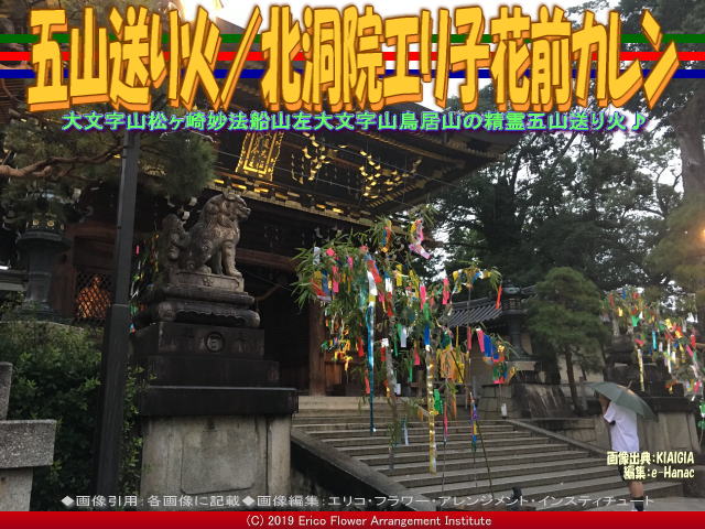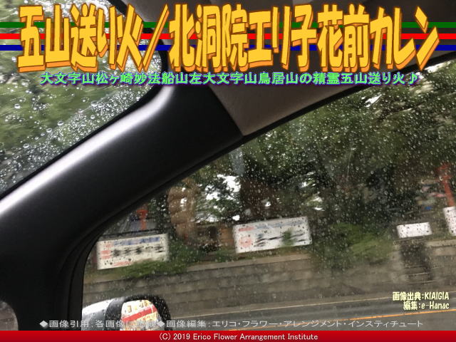 千年の都古都京都大好きの私北洞院エリ子こと、エリ子花前カレン(公式ブログ、Profile、facebook、Twitter、公式HP1、公式HP2)は、明日8月16日の五山送り火の松ヶ崎「妙法」撮影に出かける予定ですが、もし千年の都古都京都に台風10号がやってきたら・・・。 でも今まで大雨でも決行されるのが常。 五山送り火は、ご先祖様の精霊(「おしょらいさん」)を送る大切な伝統行事。 ご先祖様もこの日があの世へ戻る大切な日。 五山送り火の松ヶ崎「妙法」を点すことが中止されることは滅多に無いと思いますが・・・。 心配です。 上のタイトル画像は、近日中に書こうと思っているブログ「北野天満宮七夕祭のその後8月15日(タイトル未定)」の8月15日雨の中のワンショットビジュアルです。 タイトル画像内の左下の男性は、毎日お参りにいらしているご様子で信心深いお方のようです。 台風10号の影響で降りしきる雨の中、雨傘を肩にかけて合掌する姿に見惚れて(みとれて)しまいました。 【五山送り火(2)/北洞院エリ子花前カレン 02】 上の画像は8月15日、強雨の中、西大路通りを北に右手に平野神社を通過しているワンショットビジュアルです。 本当に明日16日もこんな雨だったら、五山送り火の準備も大変だし、観光客や見物客も大変です。 もちろん撮影も大変だし、画像も綺麗でないのでいやだなあ~て思います。 こんな心配を他所に、8月16日金曜日五山送り火の当日、台風が通過した後の晴天です。 正に台風一過です。 台風一過については過去に以下のブログを 『台風一過・台風一家/エリ子花前カレン』 『台風一過・台風一家(2)/エリ子花前カレン』 『台風一過・台風一家(3)/エリ子花前カレン』 『台風一過・台風一家(4)/エリ子花前カレン』 を書いてアップしてあります。 あわせてお読みいただければ幸いです。 さて、心も晴れやか午後8時を目処に、京都大好きの私北洞院エリ子こと、エリ子花前カレン(公式ブログ、Profile、facebook、Twitter、公式HP1、公式HP2)は、初めて五山送り火の松ヶ崎「妙法」を見学します。 我が京都四条北洞院流の非営利型一般社団法人京都国際芸術院(法人番号7130005015305/略称:KIAIGIA/キアイジャ/公式ページ/Facebookページ/公式Twitter/代表のTwitter)北大路WSS(下鴨北大路ワークショップオフィス)でこの記事を書きながら、五山送り火の松ヶ崎「妙法」をネットのあちこちで調査しながら、五山送り火の松ヶ崎「妙法」点火のタイミングを見計らってオフィスで待機しています。・・・つづく このブログページは、我が非営利型一般社団法人京都国際芸術院(法人番号7130005015305/略称:KIAIGIA/キアイジャ/公式ページ/Facebookページ/公式Twitter/代表のTwitter)花の代表、北洞院流華法道の家元として指揮を執る私北洞院エリ子花前カレン(公式ブログ、Profile、facebook、Twitter、公式HP1、公式HP2)が管理者です。 我が非営利型一般社団法人京都国際芸術院は、昨年2018年5月に京都中京の四条に法人設立した組織です。設立当初は、書と花をコアにして、書は、吉祥院心龍北洞院流書法道正師範(公式ブログ、公式Blog2アメブロ、facebook、Instagram、YouTube、公式HP)、そして花は私北洞院エリ子花前カレンの二人で、京都と大阪と兵庫で活動しています。 設立の2018年は私は、特に一般社団法人京都国際芸術院の設立(『社団法人化への歩み(6)/京都国際芸術院』など)や奈良ホテルでの記念式典(『奈良ホテル書花展(10)/京都国際芸術院』など)、出版事業部の初仕事(『アートの旅/一般社団法人京都国際芸術院』『アートの旅美術館/エリ子花前カレン』『アートの旅facebook記事/京都国際芸術院』『アートの旅松本編集長/京都国際芸術院』など)、産直市場よってって新規開店(『よってって和泉中央(4)/エリ子花前カレン』など)でのプロパー作品展示販売、そして公式ページの立上げやFcebookページやTwitterの開設、そして個人的には動画編集ビデオ制作の学習(『ビデオ制作勉強会(9)/エリ子花前カレン』など)等、ネット関連の仕事も増えて、有難くもどんどん忙しくなってきました。 また、2019年4月には京都下鴨北大路通りに北大路WS2(ワークショップ・スタジオ)を開設しました。※改装準備中の画像(※引用『北洞院流スタジオ改造(8)/京都国際芸術院』など)はこちら。 最近の我が非営利型一般社団法人京都国際芸術院の実働としては、書と花と出版をメインテーマにして、教室運営、出張講座、イベント企画と運営、出版、ウェッブ授業とデジタルコンテンツ作成と提供、京都四条北洞院流書法道と華法道認定の各師範の作品開発・頒布販売(<令和時代><作品価格@令和時代>)などを行っています。 とりわけ人気のハーバリウム体験や講座・レッスン関連ですこし例に挙げると、今までに 『ハーバリウム製作体験(3)/有真香会館』 『岸和田教育委員会FA講座(5)/エリ子花前カレン』『煉瓦館ハーバリウム(5)/北洞院流』を行い、一部ブログを作成して紹介してあります。 ハーバリウム体験授業の中で必ず口頭で紹介させて頂きます「アートの旅」は、私たち非