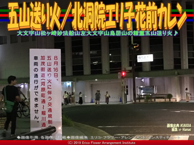 上のタイトル画像は、「ざ・京都」サイトの「五山の送り火」ページのプリントスクリーンショット・ビジュアルです。 京都五山の送り火について、このページを引用しますと、以下 <8月16日、京都の夏の夜に浮かび上がる大の文字。「大文字焼き」ではなく、正確には「五山の送り火」と呼びます。五山の送り火とはお盆に行われる京都の伝統行事で、京都を囲む5つの山にそれぞれ「大文字」「左大文字」「船形」「鳥居形」「妙法」の形に火をともすというものです。五つの山に5種類の送り火を焚くところから「五山の送り火」と呼ばれるようになりました。その起源は諸説に分かれるのですが、平安時代とも室町時代ともいわれ、長い間、京の町の人々に親しまれています。この五山の送り火はお盆の先祖供養の一般信仰「盂蘭盆会(うらぼんえ)」と結びついたもので、お盆に帰ってきた先祖の魂(精霊。「おしょらいさん」)を各家で供養した後、再びあの世に送り出すという意味があります。大文字の送り火は護摩木に自分の名前と病名を書いて火床の割木の上に載せて焚くと、その病が癒るという信仰があり、また消炭を持ち帰って粉末にして服すると、持病が癒るとも言われています。送り火は、京都三大祭(葵祭、祇園祭、時代祭)に加えて、京都四大行事とも言われています。> と紹介されています。 【五山送り火(3)/北洞院エリ子花前カレン 02】 さて、8月16日金曜日五山送り火の当日、午後7時過ぎ松ヶ崎「妙法」の撮影に出かける時間です。 我が京都四条北洞院流の非営利型一般社団法人京都国際芸術院(法人番号7130005015305/略称:KIAIGIA/キアイジャ/公式ページ/Facebookページ/公式Twitter/代表のTwitter)北大路WSS(下鴨北大路ワークショップオフィス)から自転車と徒歩で取材に出かけます。 上の画像は、北大路通りに面している我が北大路WSS(下鴨北大路ワークショップオフィス)の朝6時過ぎのワンショットビジュアルです。 実は、北大路WSS(下鴨北大路ワークショップオフィス)の窓からは、高さの問題で松ヶ崎「妙法」の「妙」という字の一部だけ見ることが出来ます。 このお盆の終り夏の夜空を彩る「京都五山送り火」は、京都のお盆のビッグイベントです。 大文字(東山如意ケ嶽)、妙法 (松ヶ崎西山・東山)、舟形(西賀茂船山)、左大文字(金閣寺大北山)、鳥居形(嵯峨曼荼羅山)の五山送り火は盂蘭盆・お盆にお戻りのおしょらいさん(お精霊さん/ご先祖の魂)を再びあの世浄土に送り出すという伝統的な行いです。・・・つづく このブログページは、我が非営利型一般社団法人京都国際芸術院(法人番号7130005015305/略称:KIAIGIA/キアイジャ/公式ページ/Facebookページ/公式Twitter/代表のTwitter)花の代表、北洞院流華法道の家元として指揮を執る私北洞院エリ子花前カレン(公式ブログ、Profile、facebook、Twitter、公式HP1、公式HP2)が管理者です。 我が非営利型一般社団法人京都国際芸術院は、昨年2018年5月に京都中京の四条に法人設立した組織です。設立当初は、書と花をコアにして、書は、吉祥院心龍北洞院流書法道正師範(公式ブログ、公式Blog2アメブロ、facebook、Instagram、YouTube、公式HP)、そして花は私北洞院エリ子花前カレンの二人で、京都と大阪と兵庫で活動しています。 設立の2018年は私は、特に一般社団法人京都国際芸術院の設立(『社団法人化への歩み(6)/京都国際芸術院』など)や奈良ホテルでの記念式典(『奈良ホテル書花展(10)/京都国際芸術院』など)、出版事業部の初仕事(『アートの旅/一般社団法人京都国際芸術院』『アートの旅美術館/エリ子花前カレン』『アートの旅facebook記事/京都国際芸術院』『アートの旅松本編集長/京都国際芸術院』など)、産直市場よってって新規開店(『よってって和泉中央(4)/エリ子花前カレン』など)でのプロパー作品展示販売、そして公式ページの立上げやFcebookページやTwitterの開設、そして個人的には動画編集ビデオ制作の学習(『ビデオ制作勉強会(9)/エリ子花前カレン』など)等、ネット関連の仕事も増えて、有難くもどんどん忙しくなってきました。 また、2019年4月には京都下鴨北大路通りに北大路WS2(ワークショップ・スタジオ)を開設しました。※改装準備中の画像(※引用『北洞院流スタジオ改造(8)/京都国際芸術院』など)はこちら。 最近の我が非営利型一般社団法人京都国際芸術院の実働としては、書と花と出版をメインテーマにして、教室運営、出張講座、イベント企画と運営、出版、ウェッブ授業とデジタルコンテンツ作成と提供、京都四条北洞院流書法道と華法道認定の各師範の作品開発・頒布販売(<令和時代><作品価格@令和時代>)などを行っています。 とりわけ人気のハーバリウム体験や講座・レッスン関連ですこし例に挙げると、今までに 『ハーバリウム製作体験(3)/有真香会館』 『岸和田教育委員会FA講座(5)/エリ子花前カレン』『煉瓦館ハーバリウム(5)/北洞院流』を行い、一部ブログを作成して紹介してあります。 ハーバリウム体験授業の中で必ず口頭で紹介させて頂きます「アー