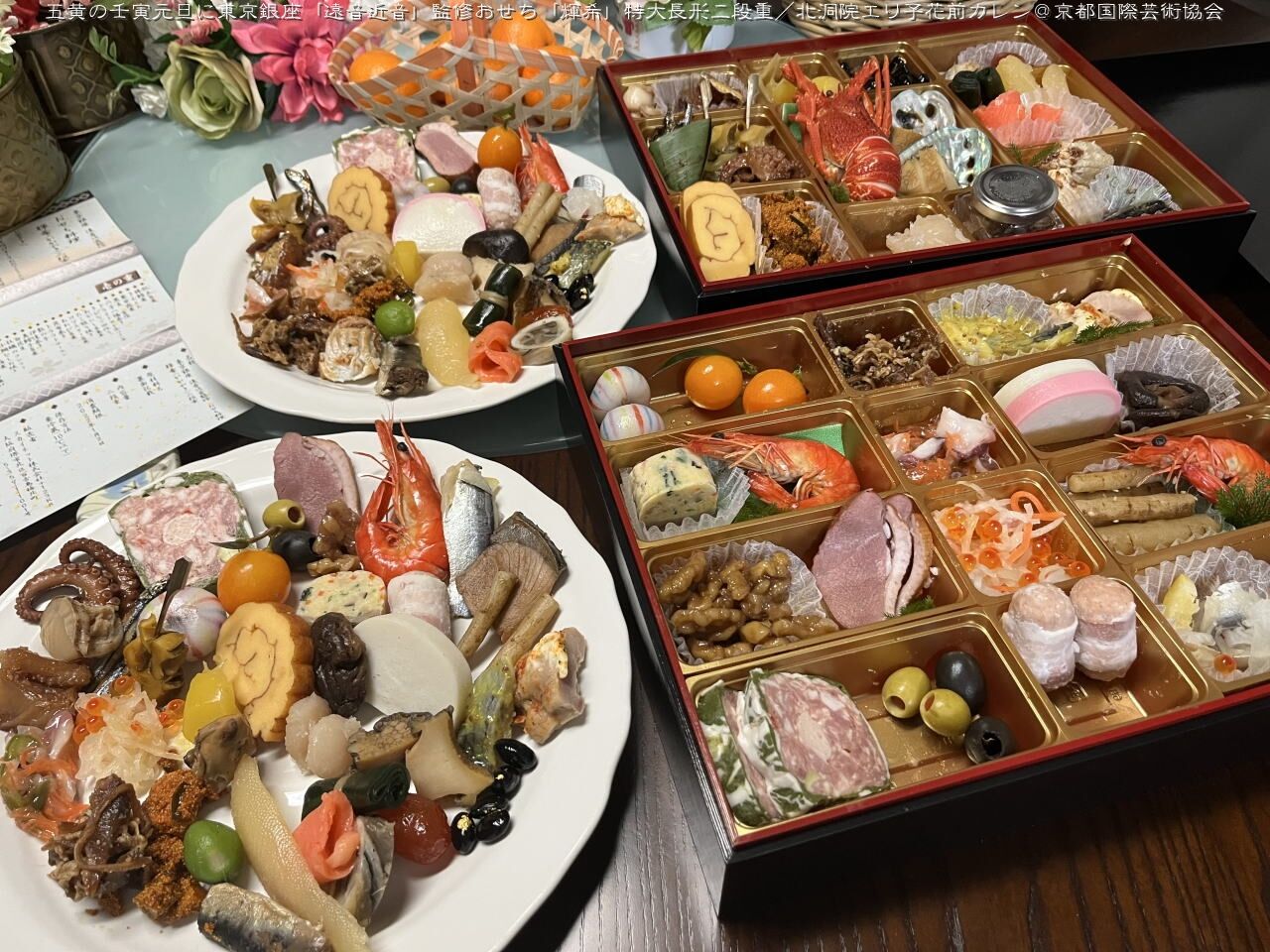 トップのタイトル画像01は、我が一般社団法人京都国際芸術協会<法人設立当時の旧商号:非営利型一般社団法人京都国際芸術院(法人番号7130005015305/略称:KIAIGIA/キアイジャ/公式ページ/Facebookページ/公式Twitter/代表のTwitter/大阪南本部)>で代表を務める、わたくし京都四条北洞院流家元エリ子<北洞院エリ子花前カレン(公式ブログ、Profile、facebook、Twitter、Instagram、公式HP1、公式HP2/個人塾/浜のフラワーショップ/花屋の矜持)>がおせち通販スカイネット匠本舗の遠音近音(おちこち)のおせち「輝希(かがやき)」というおせち(お節料理)を開いた時のワンショットビジュアルです。