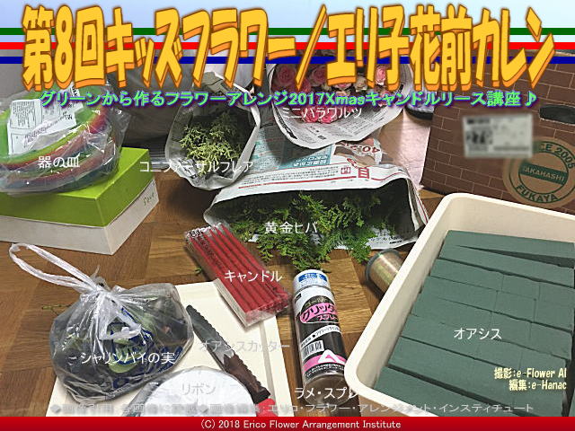 【第8回キッズフラワー/エリ子花前カレン 01】 今回の紹介ブログは、『第8回キッズフラワー/エリ子花前カレン』です。 画像タイトルは、<第8回キッズフラワー/エリ子花前カレン>としています。 サブタイトルは、<グリーンから作るフラワーアレンジ2017Xmasキャンドルリース講座♪>としています。 タグは<第8回、キッズフラワー、エリ子、花前カレン、グリーン、フラワーアレンジ、2017、Xmas、キャンドル、リース>としています。 キャンドルリースについては、昨年2017年岸和田市教育委員会生涯学習部生涯学習課の岸和田市立葛城地区公民館有真香会館公募のクリスマスシーズンのみの公民館フラワーアレンジメントとして、ワンオフレッスン「Xmas2017キャンドルリース/葛城地区公民館」を、私プロフローリスト、エリ子花前カレンがインストラクターを務めさせて頂きました。以下のブログ 『Xmas2017キャンドルリース(6)/葛城地区公民館』 『Xmas2017キャンドルリース(5)/葛城地区公民館』 『Xmas2017キャンドルリース(4)/葛城地区公民館』 『Xmas2017キャンドルリース(3)/葛城地区公民館』 『Xmas2017キャンドルリース(2)/葛城地区公民館』 『Xmas2017キャンドルリース/葛城地区公民館』 を作成してアップしてあります。 | ||||